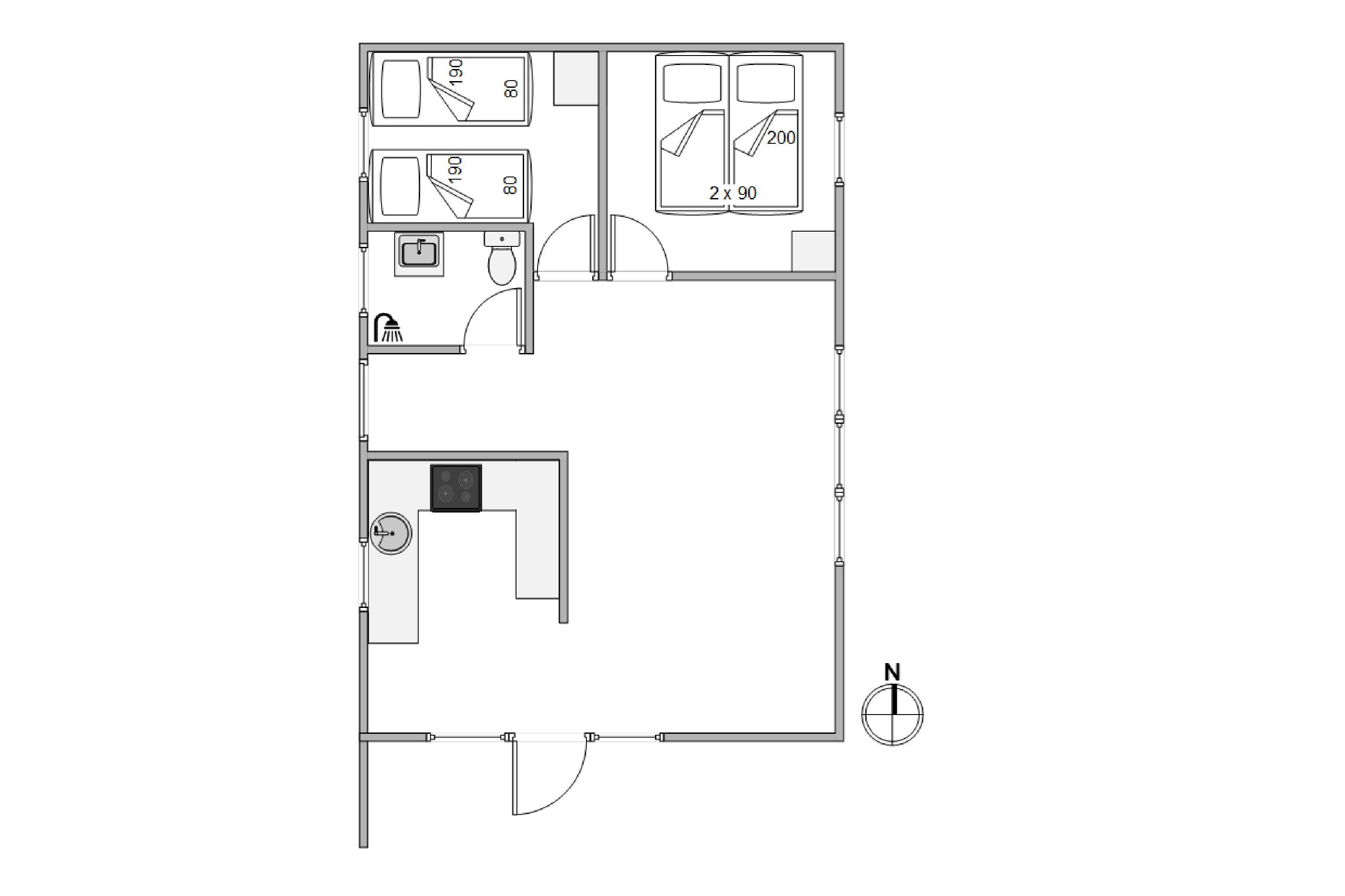 Opholdstuen med åben forbindelse til køkkenet fungerer som husets hjerte og vil uden tvivl blive jeres omdrejningspunkt og mødested. Her kan I tilberede jeres måltider, hygge med spil og film i de sene aftentimer eller læse en god bog. Her er mange store vinduer, der både sørger for et godt lysindfald, men også lukker den omkringliggende natur helt indenfor. Huset råder over to værelser – et værelse med dobbeltseng og et med to enkeltsenge. Herudover er der et mindre badeværelse med bruseniche og flisegulv.