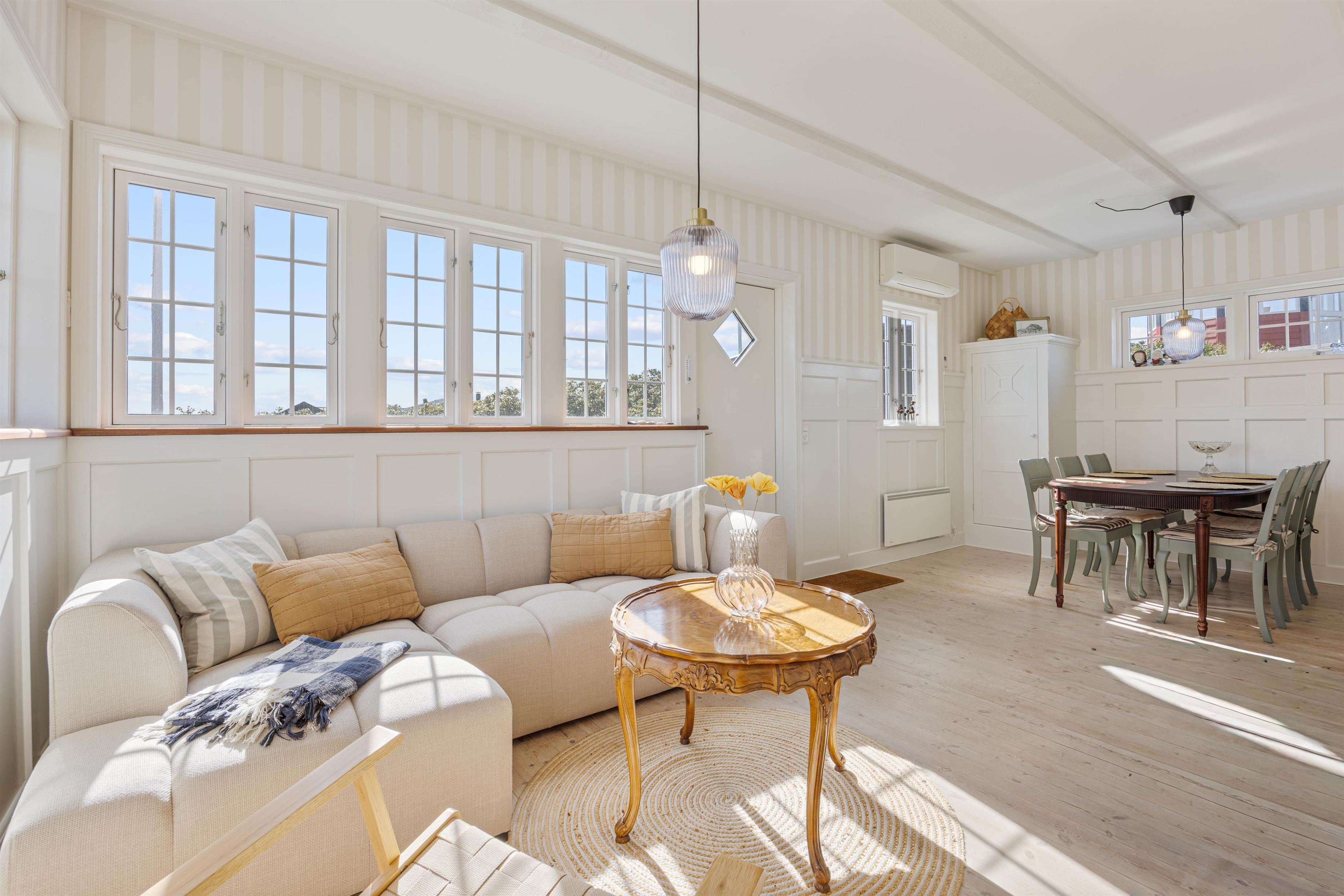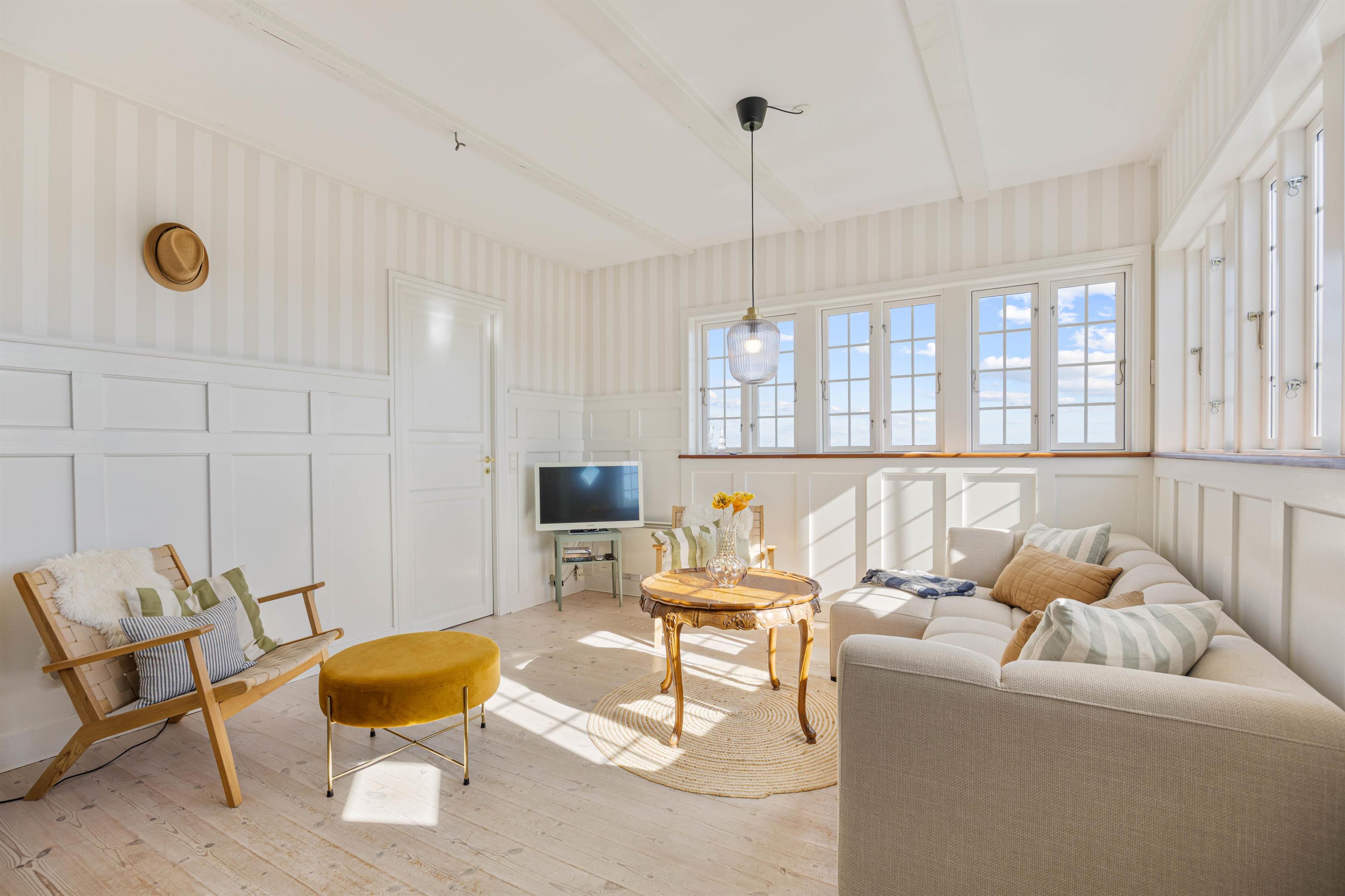 Allerede når I træder indenfor i dette sommerhus i Søndervig, vil I opleve den særlige badehotelsstemning, som gør huset helt unikt. De smukke vægpaneler, flotte tapeter og sprossede vinduer skaber en autentisk og hyggelig atmosfære, som man sjældent finder i traditionelle sommerhuse til leje.