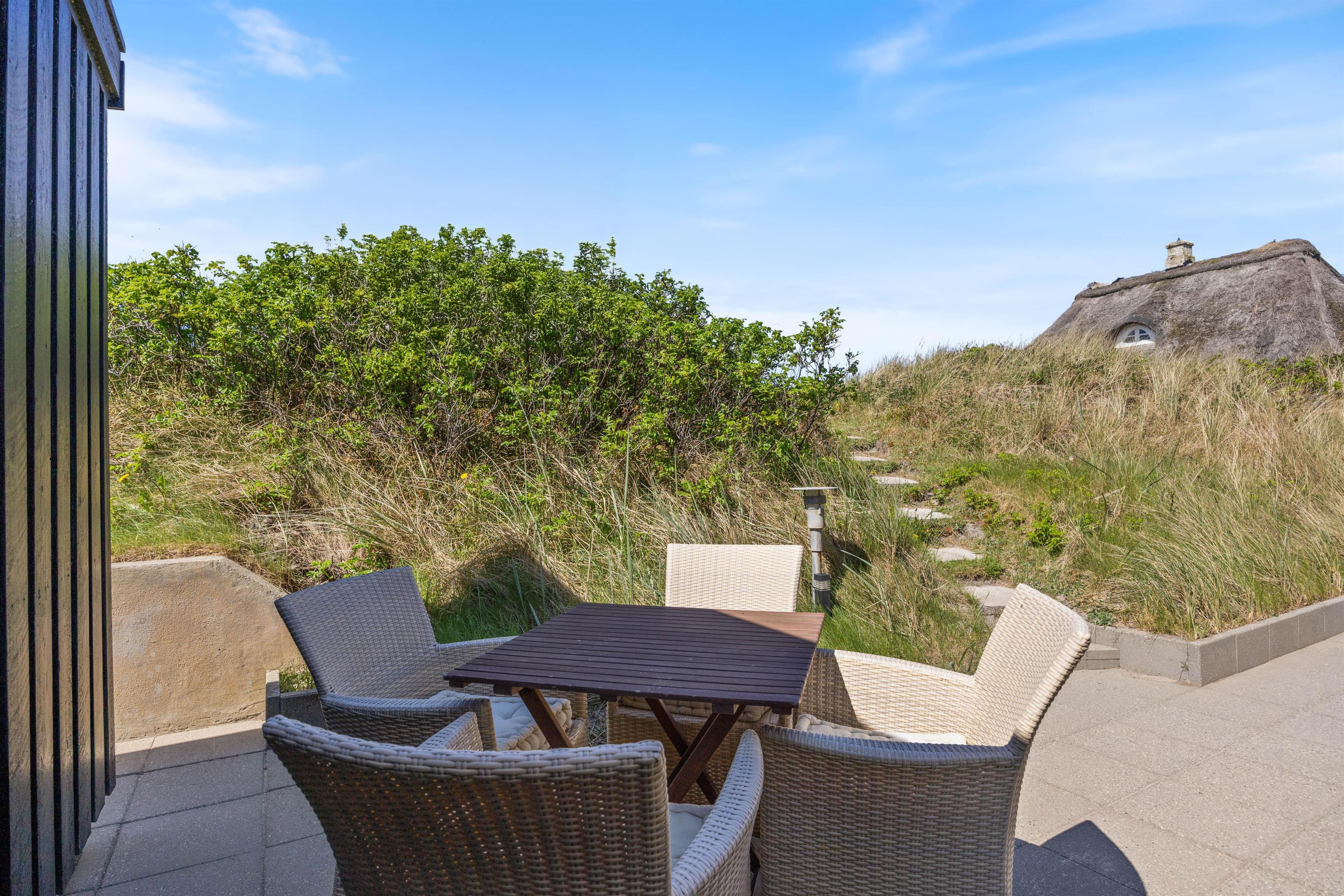 Det er ikke kun indendørs, at dette sommerhus i Søndervig imponerer. Udendørs finder I flere hyggelige terrasser, hvor I kan slappe af og nyde den vestjyske natur. Den sydvestvendte terrasse er oplagt til morgen- og formiddagssolen, mens terrassen mod vest inviterer til smukke solnedgange og aftensmad under åben himmel. Med grill til rådighed kan I også flytte madlavningen udenfor. Fra begge terrasser kan I nyde lyden af Vesterhavets brusen – en uforglemmelig og afslappende baggrundslyd