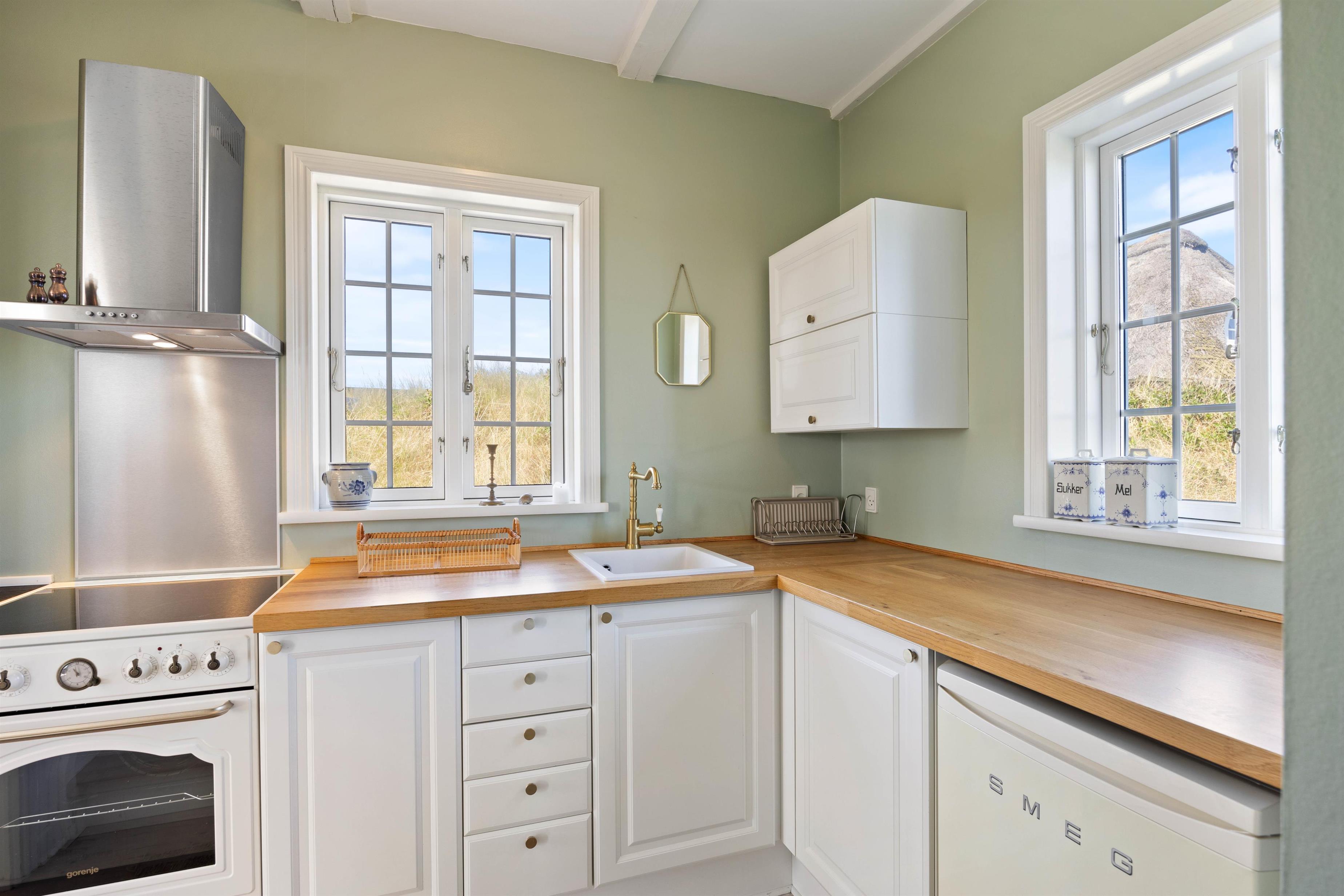 Opholdsrummet rummer både sofamøblement og spiseplads, samt det også fremstår lyst og åbent. De mange vinduer giver jer en fantastisk udsigt over Søndervig og det omkringliggende klitlandskab. I får derfor imødekommet jeres ønsker, hvis I ønsker et sommerhus med udsigt.
