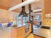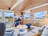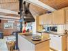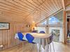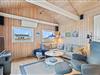 Når I træder ind i feriehuset, bliver I mødt af en hyggelig feriehusstemning med træbeklædte vægge. Feriehusets midtpunkt er det store opholdsrum, som forbinder køkken-alrum og stuen. Her kan I lave mad sammen, spille kort eller hygge jer foran fjernsynet med jeres yndlingsserie. På regnvejrsdage kan I hygge jer foran brændeovnen, som bidrager til den typiske feriehusstemning. Desuden er der installeret en energibesparende luft-til-luft-varmepumpe i feriehuset, som sørger for en hyggelig og behagelig varme. Loftet går også hele vejen til kip her i opholdsrummet, hvilket er med til at give rummet en god rumfornemmelse.