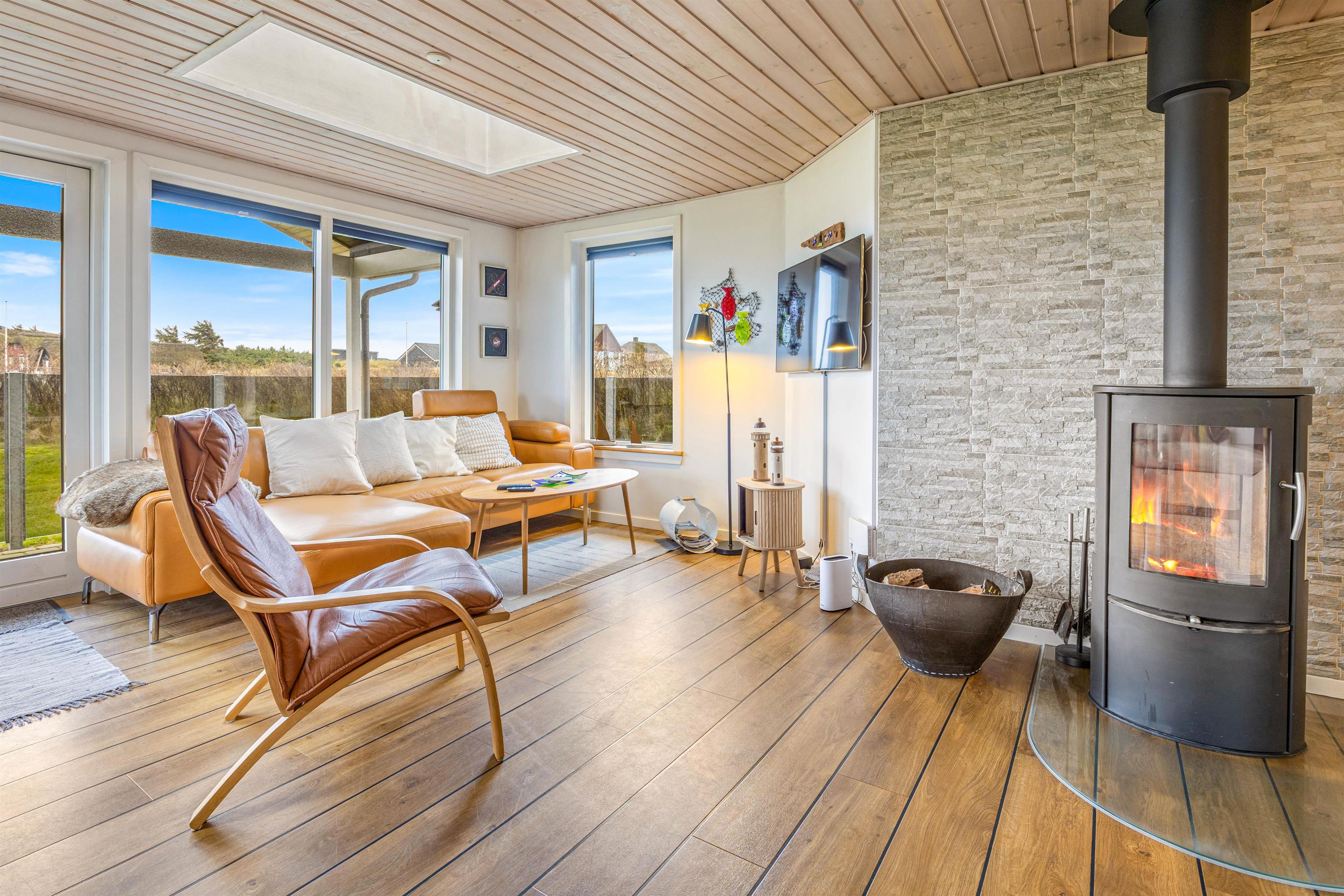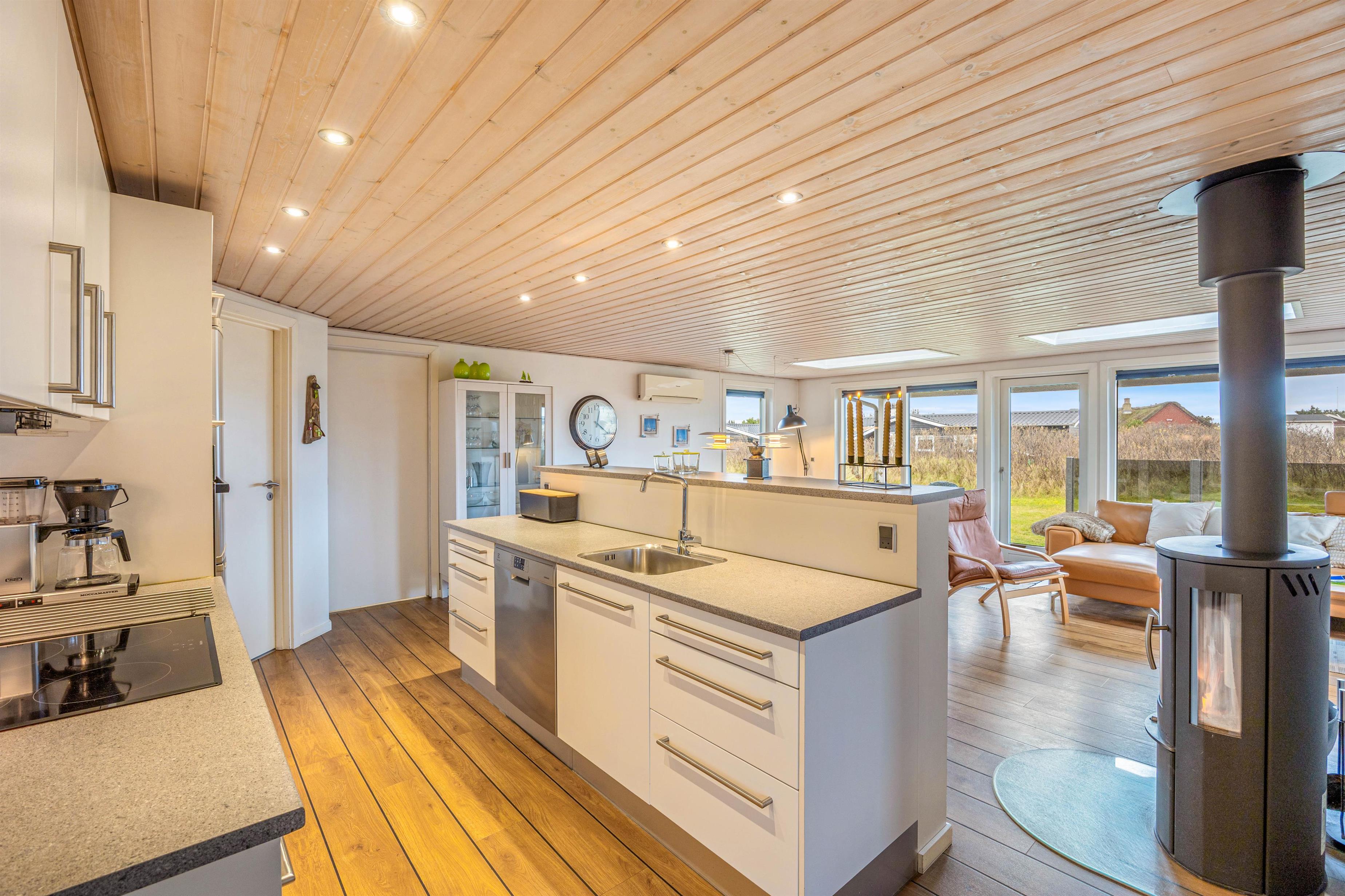 Feriehusets køkkenalrum er helt perfekt til at skabe nogle mindreværdige ferieminder. Her er der dejligt lyst, og dette skyldtes især de dejligste ovenlysvinduer, der skaber et fantastisk indemiljø med et dejligt lysindfald. I kan også med fordel tænde op for husets brændeovn, som altid er garant for at skabe en hyggelig og varm atmosfære.