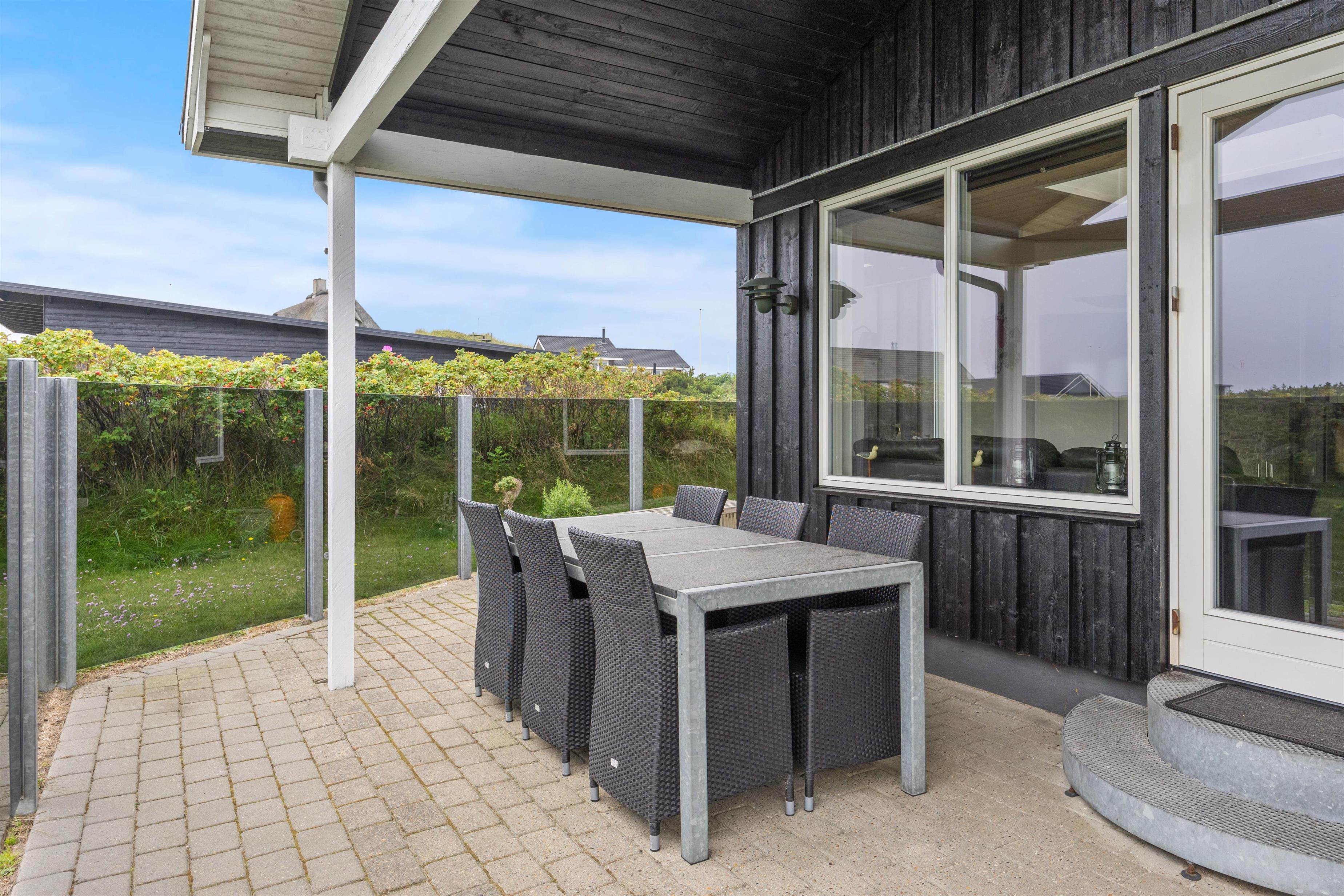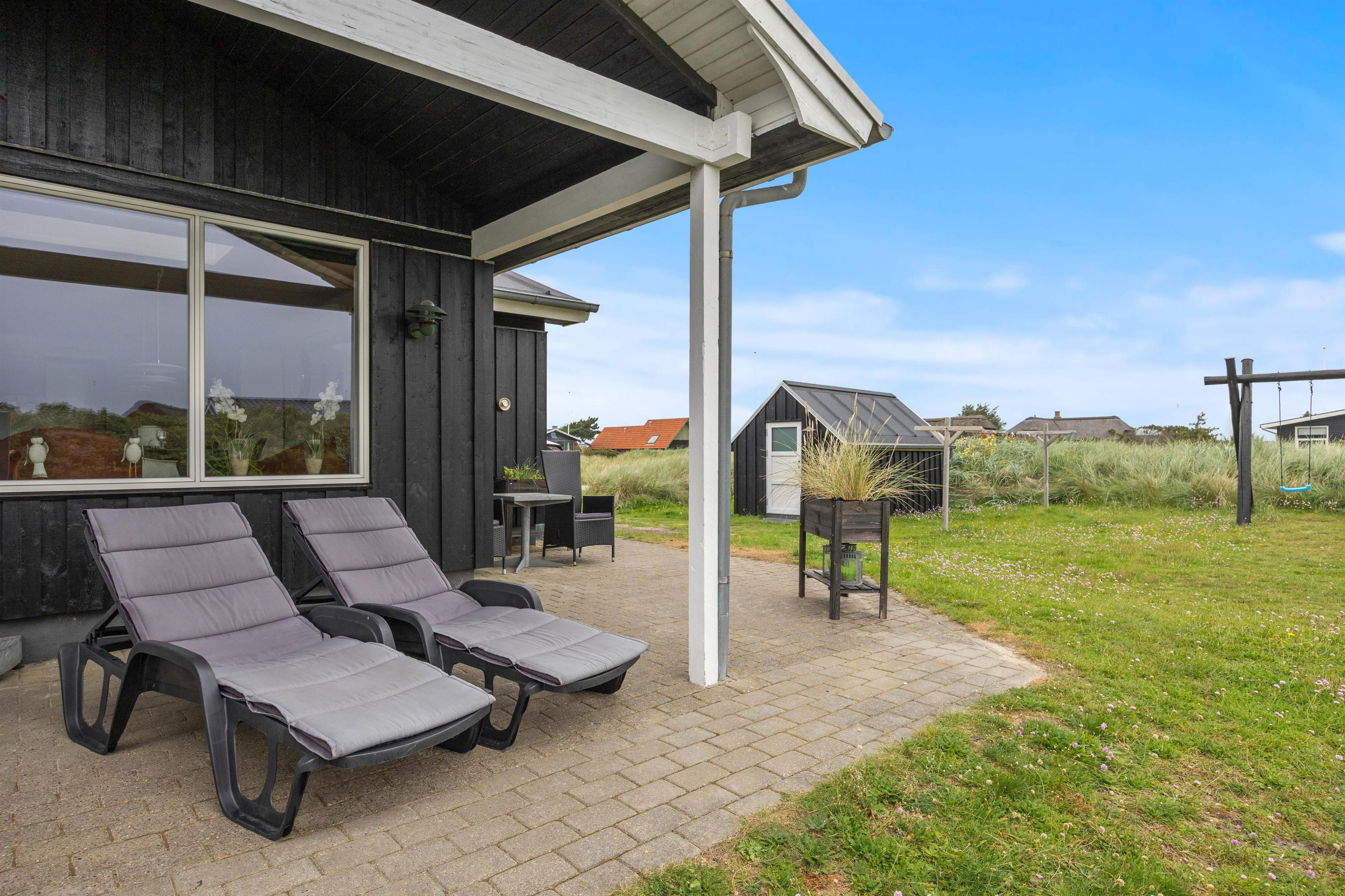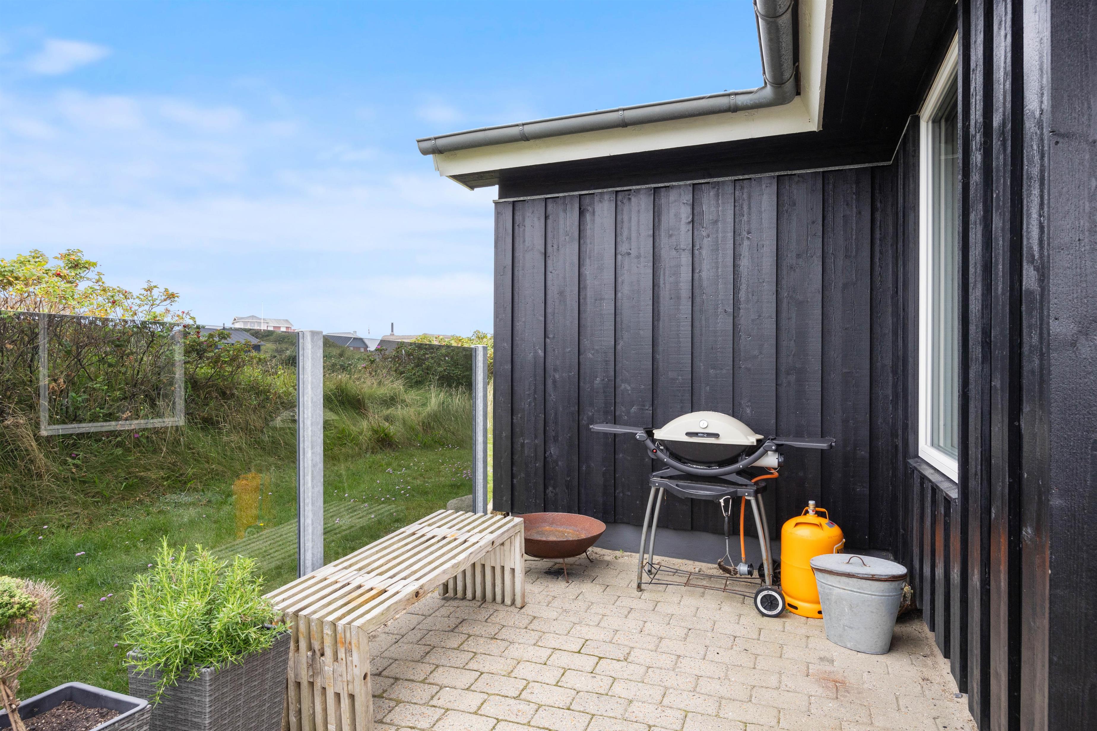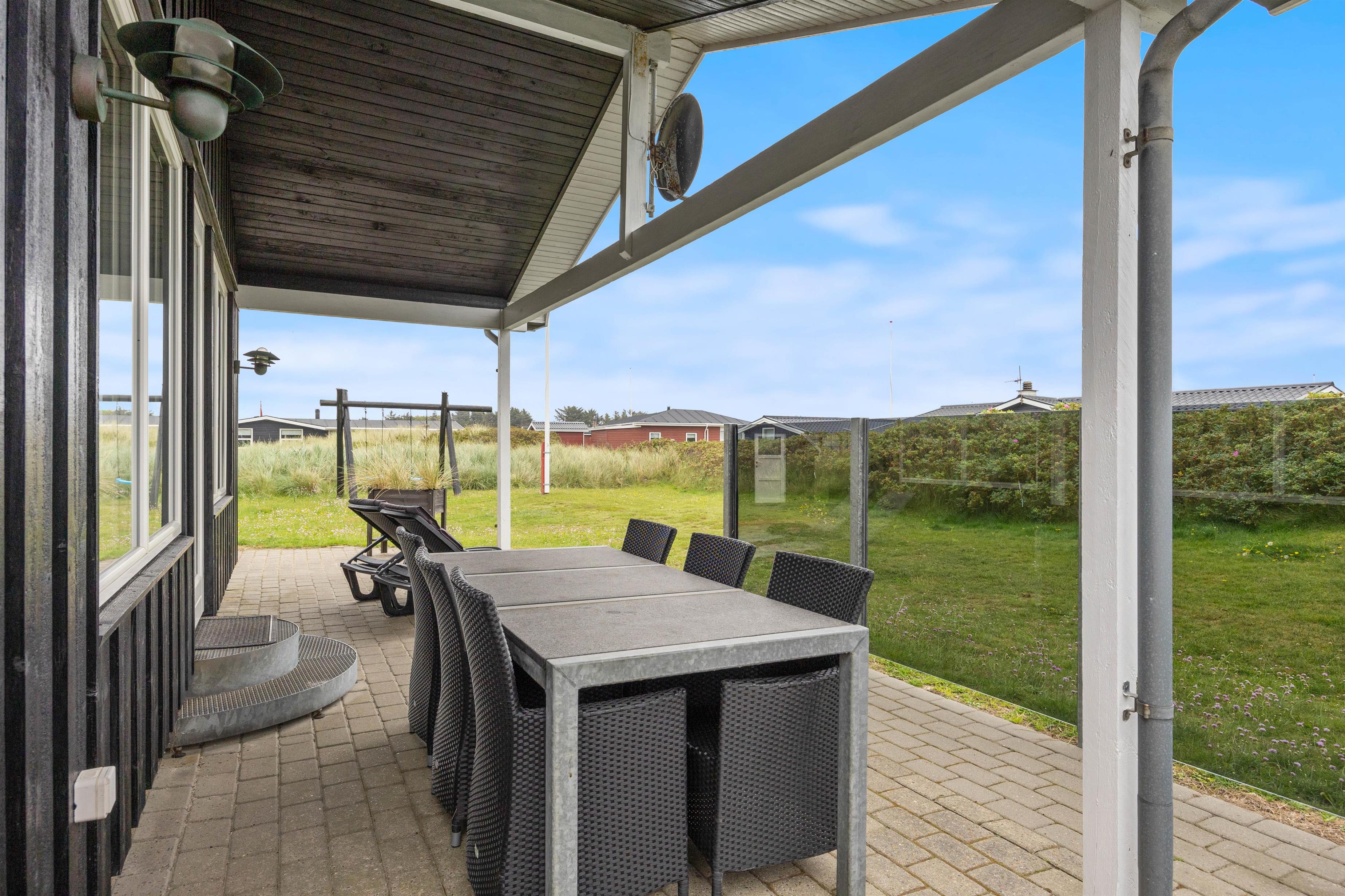 Når I træder uden for feriehuset på Nordsøvej 94, møder I mod syd en god, delvis overdækket terrasse, så I har mulighed for at læne jer tilbage i feriehusets havemøbler og liggestole og nyde det omkringliggende område og den friske havluft samtidig med, at den tilhørende grill sørger for et lækkert aftensmåltid.