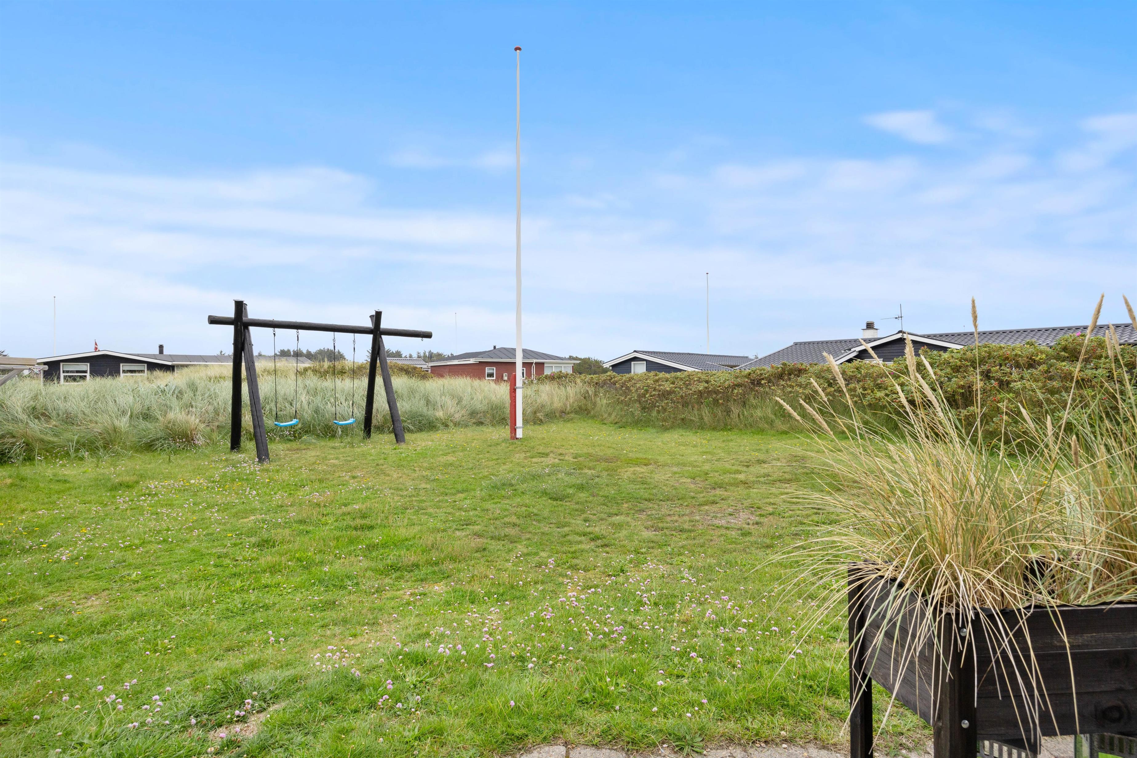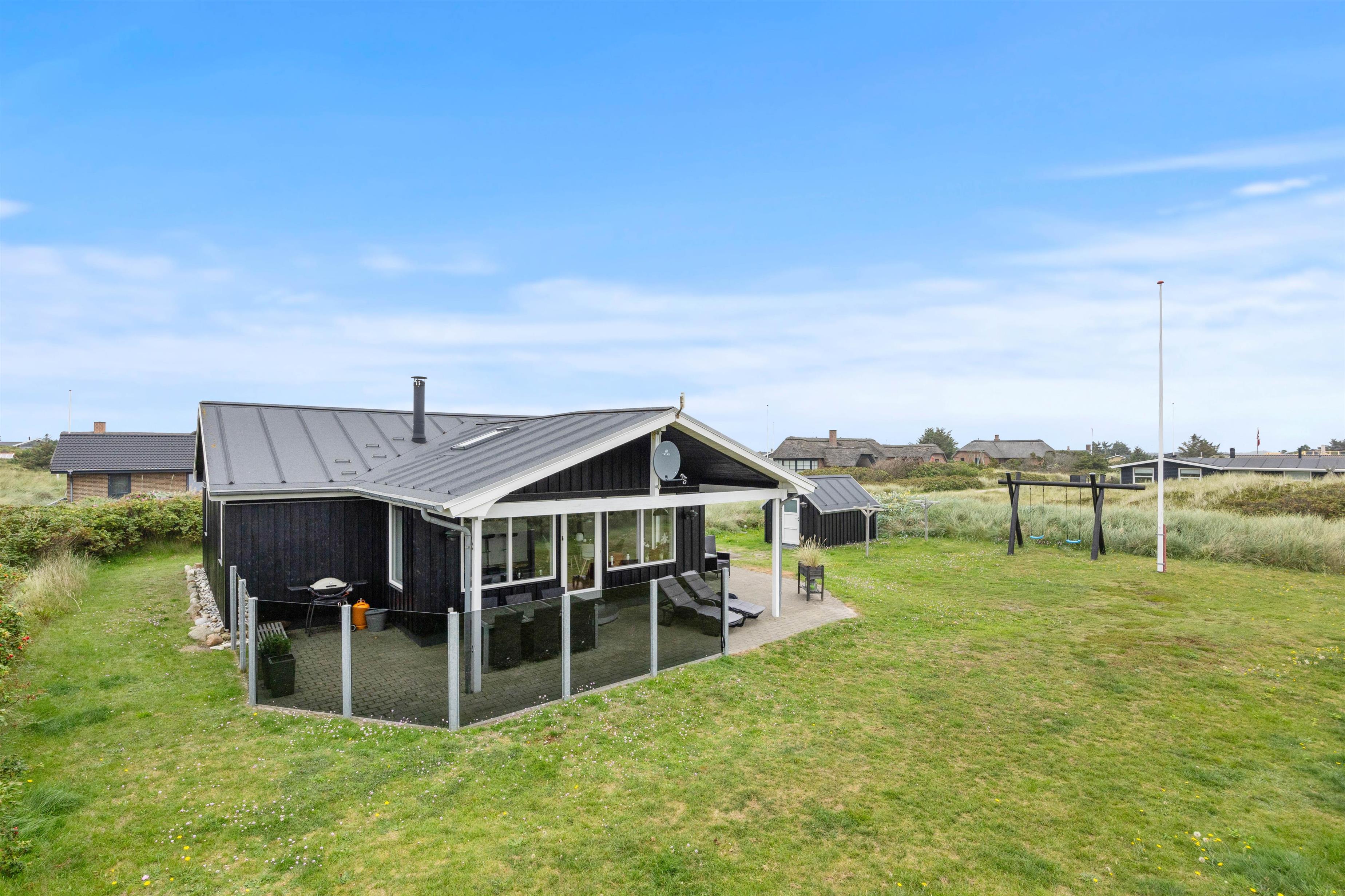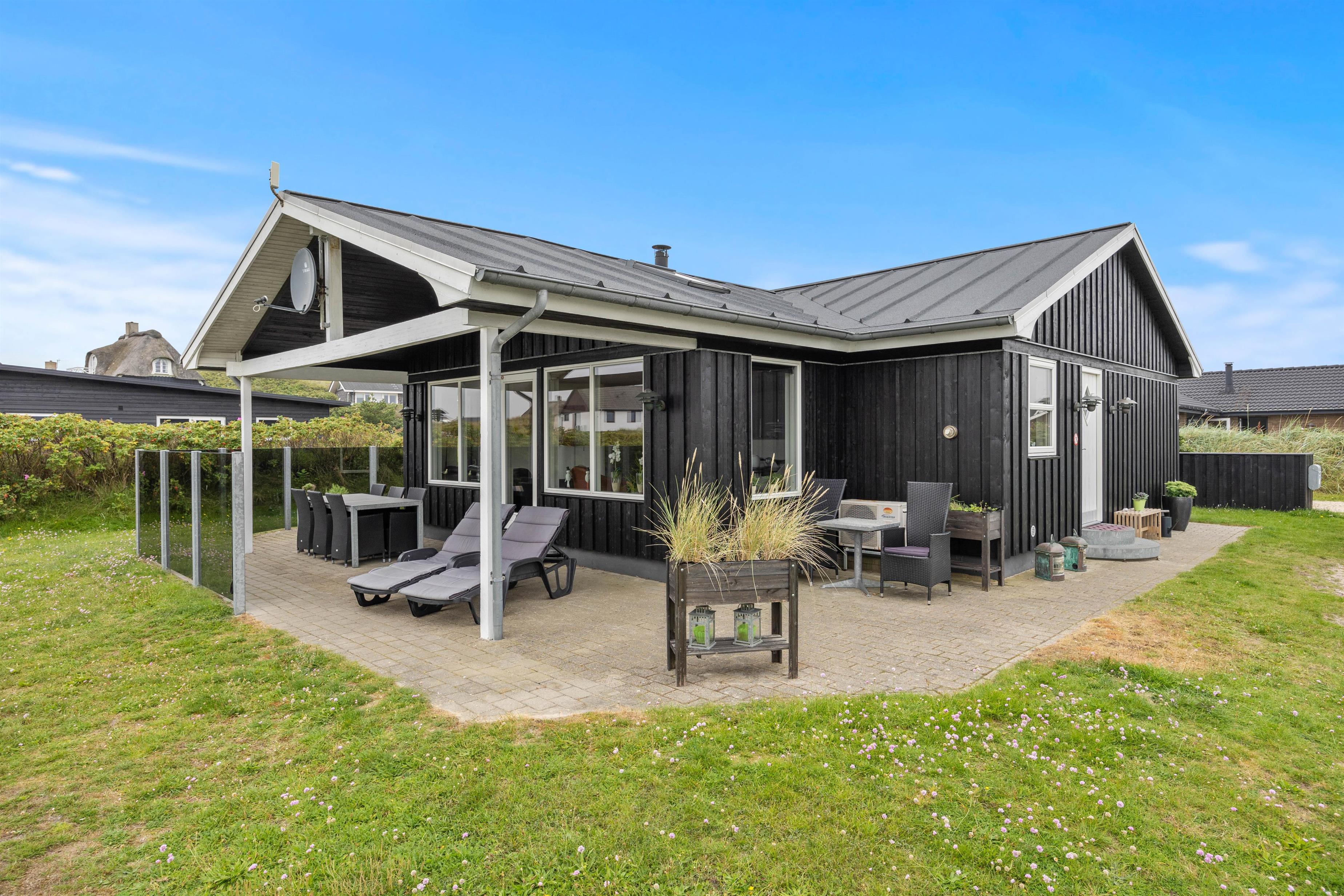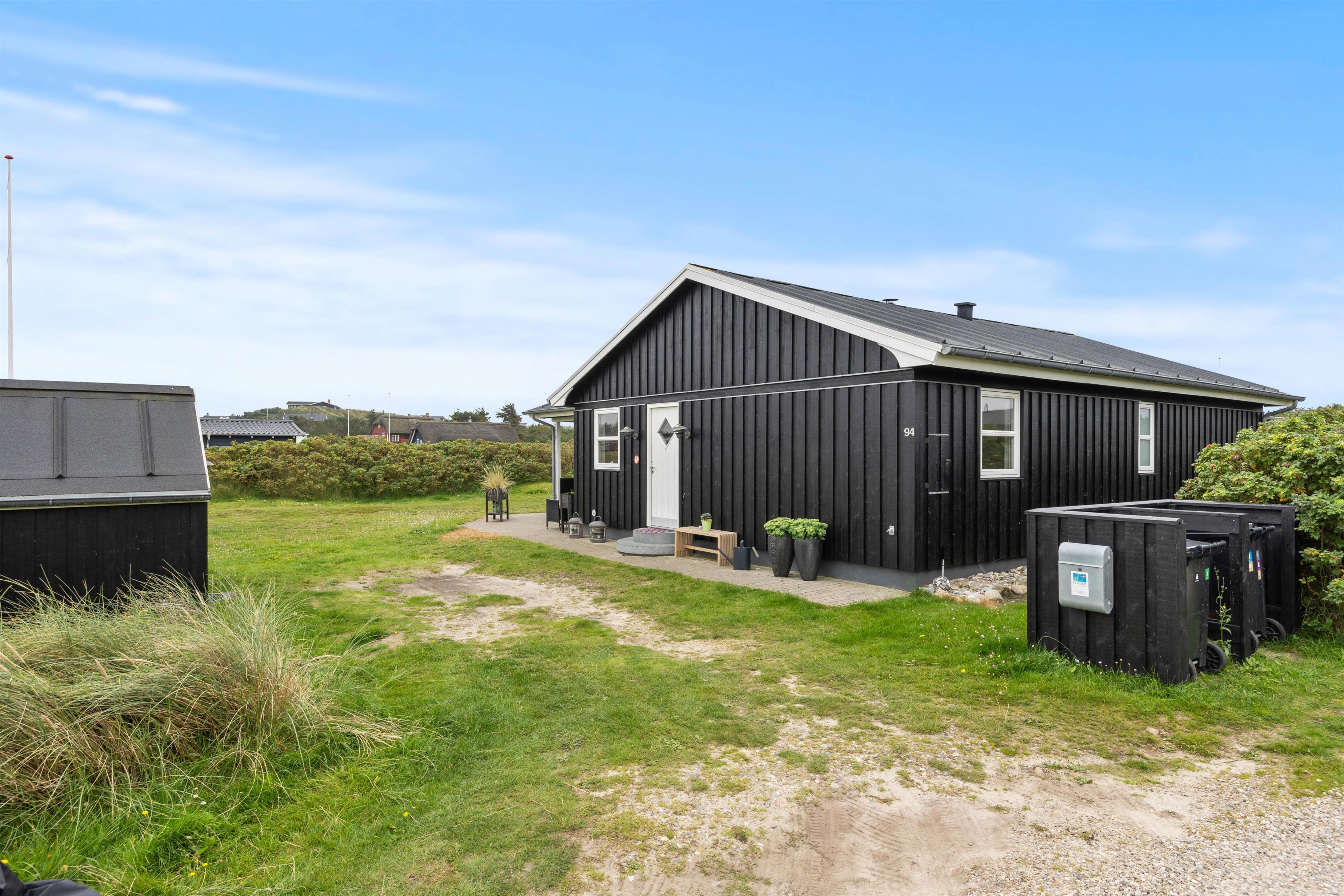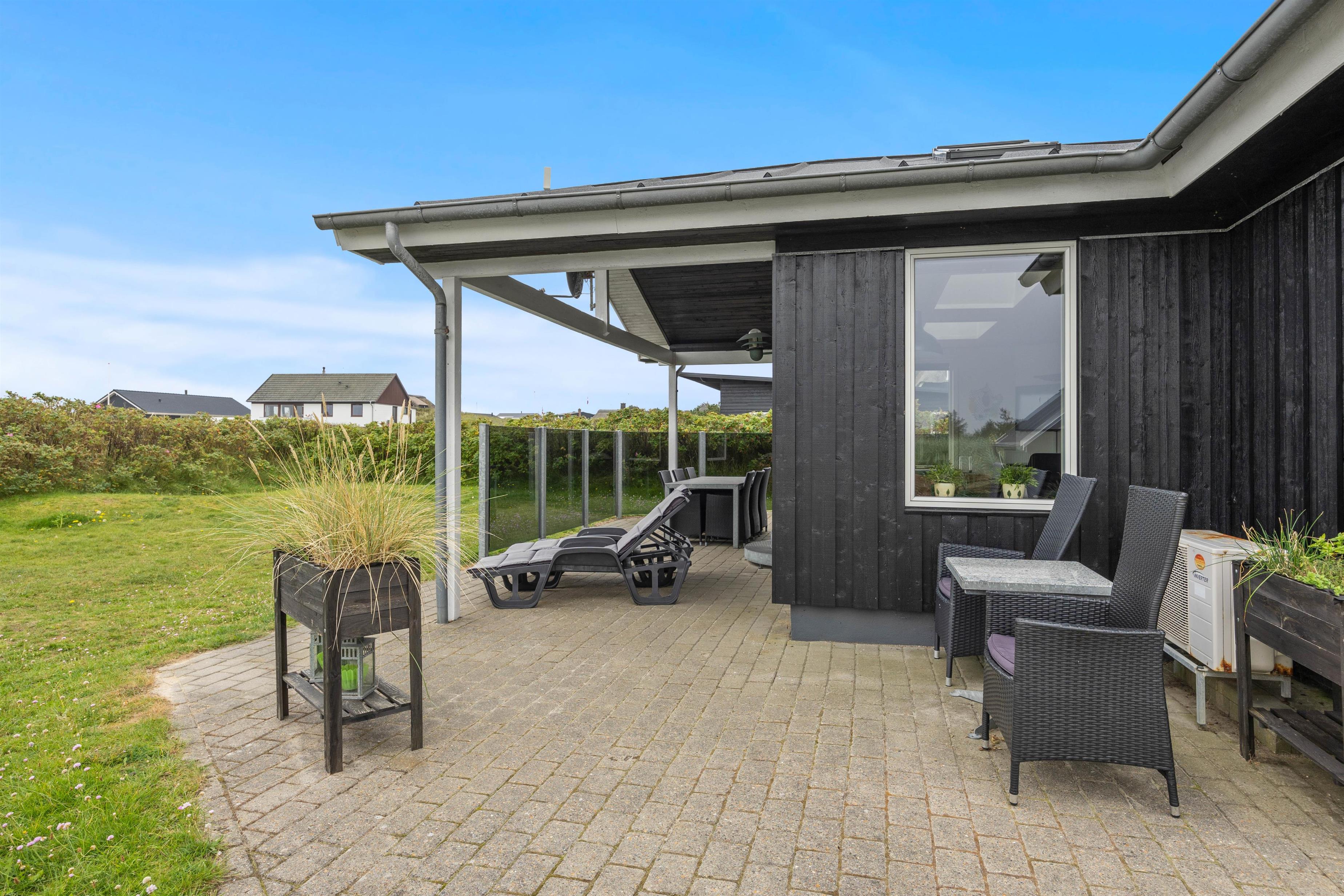 Når I træder uden for feriehuset på Nordsøvej 94, møder I mod syd en god, delvis overdækket terrasse, så I har mulighed for at læne jer tilbage i feriehusets havemøbler og liggestole og nyde det omkringliggende område og den friske havluft samtidig med, at den tilhørende grill sørger for et lækkert aftensmåltid.