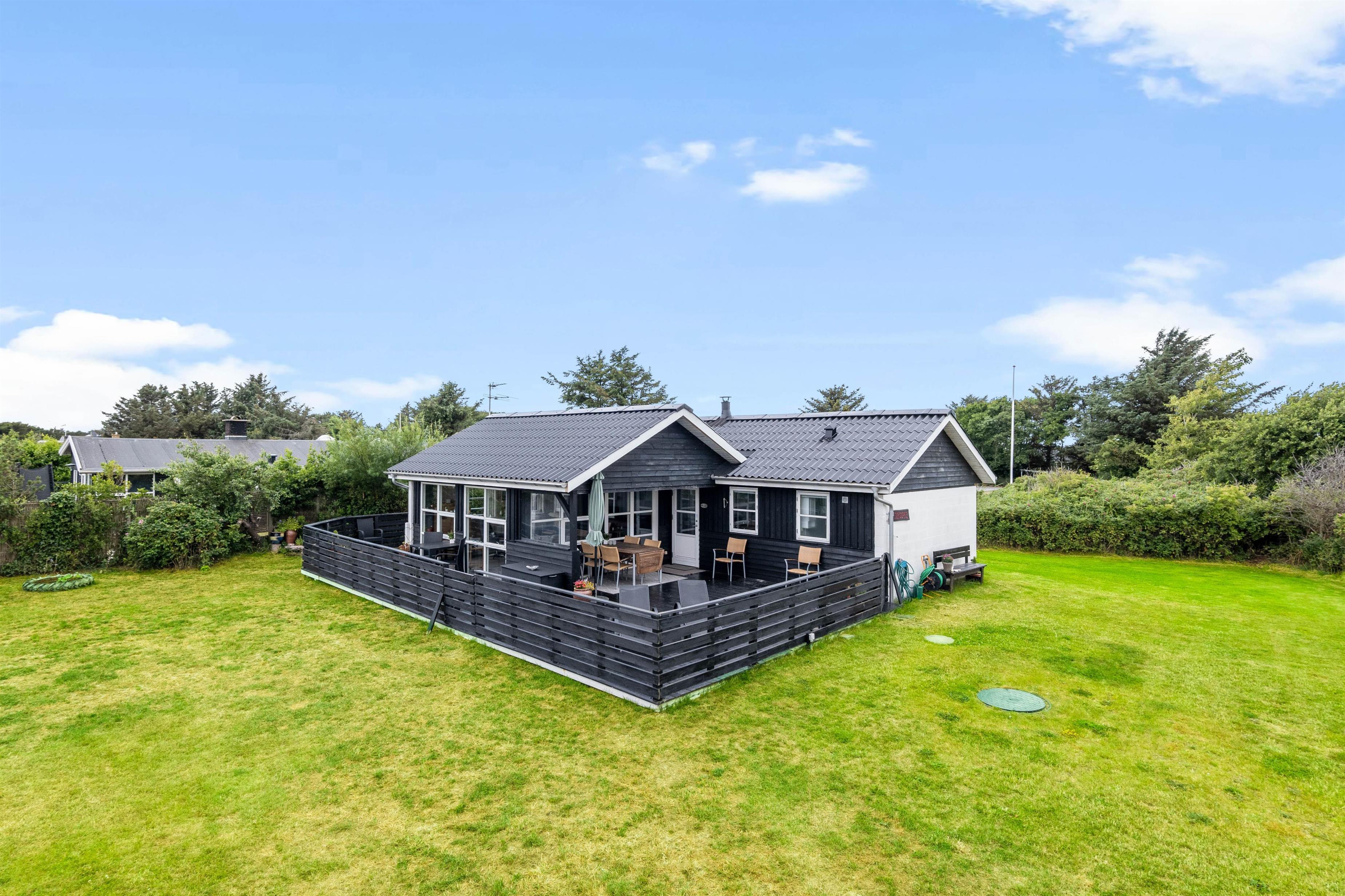 Lad ferien begynde på den dejlige, afskærmede og delvis overdækkede terrasse, hvor der er god plads til at nyde det herlige vejr og de smukke omgivelser. Børnene og hunden kan få fri leg på den store græsplæne, der hører med til huset, og her kan der også tages et spil bold med hele familien, eller de mindste kan lege på gyngerne.