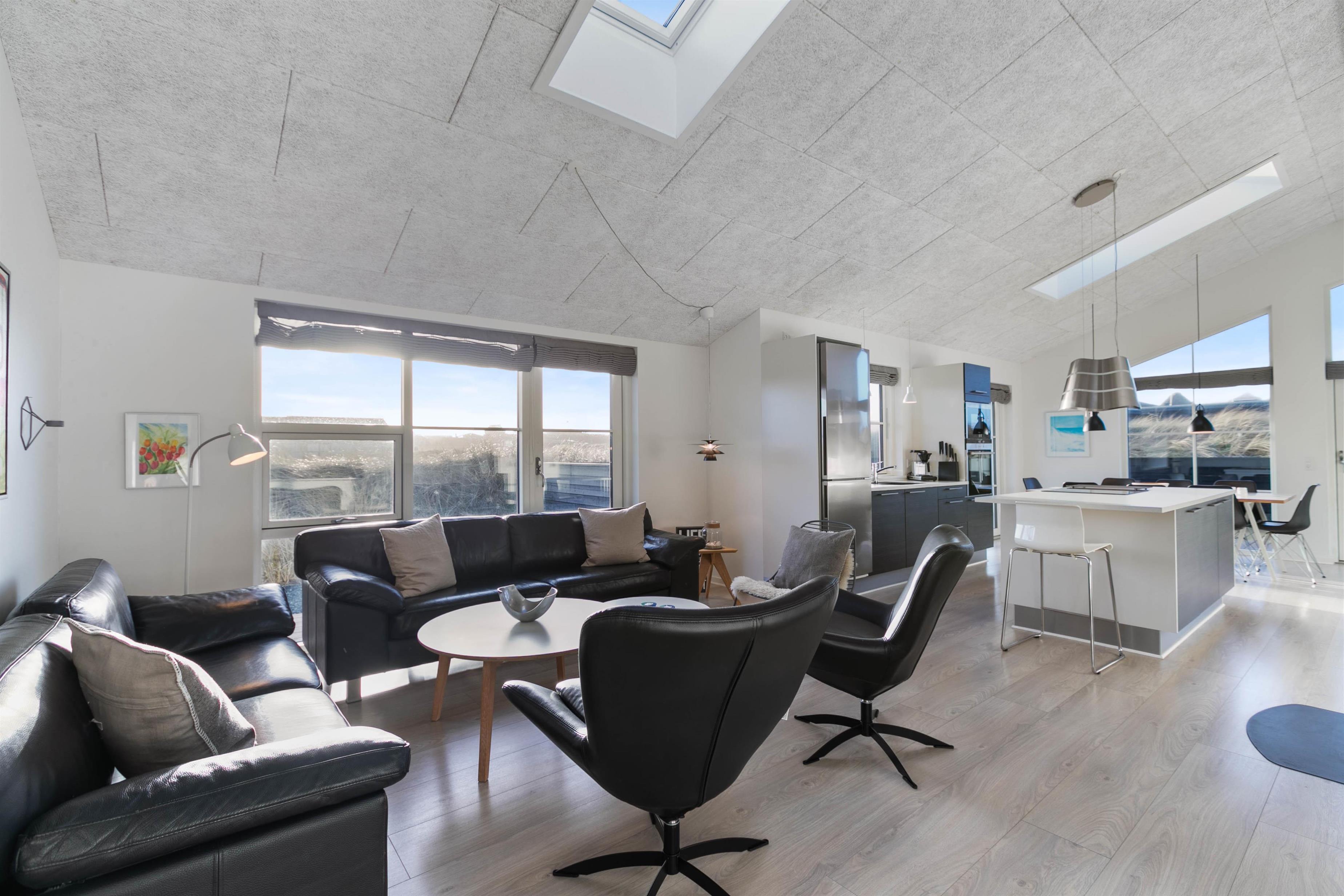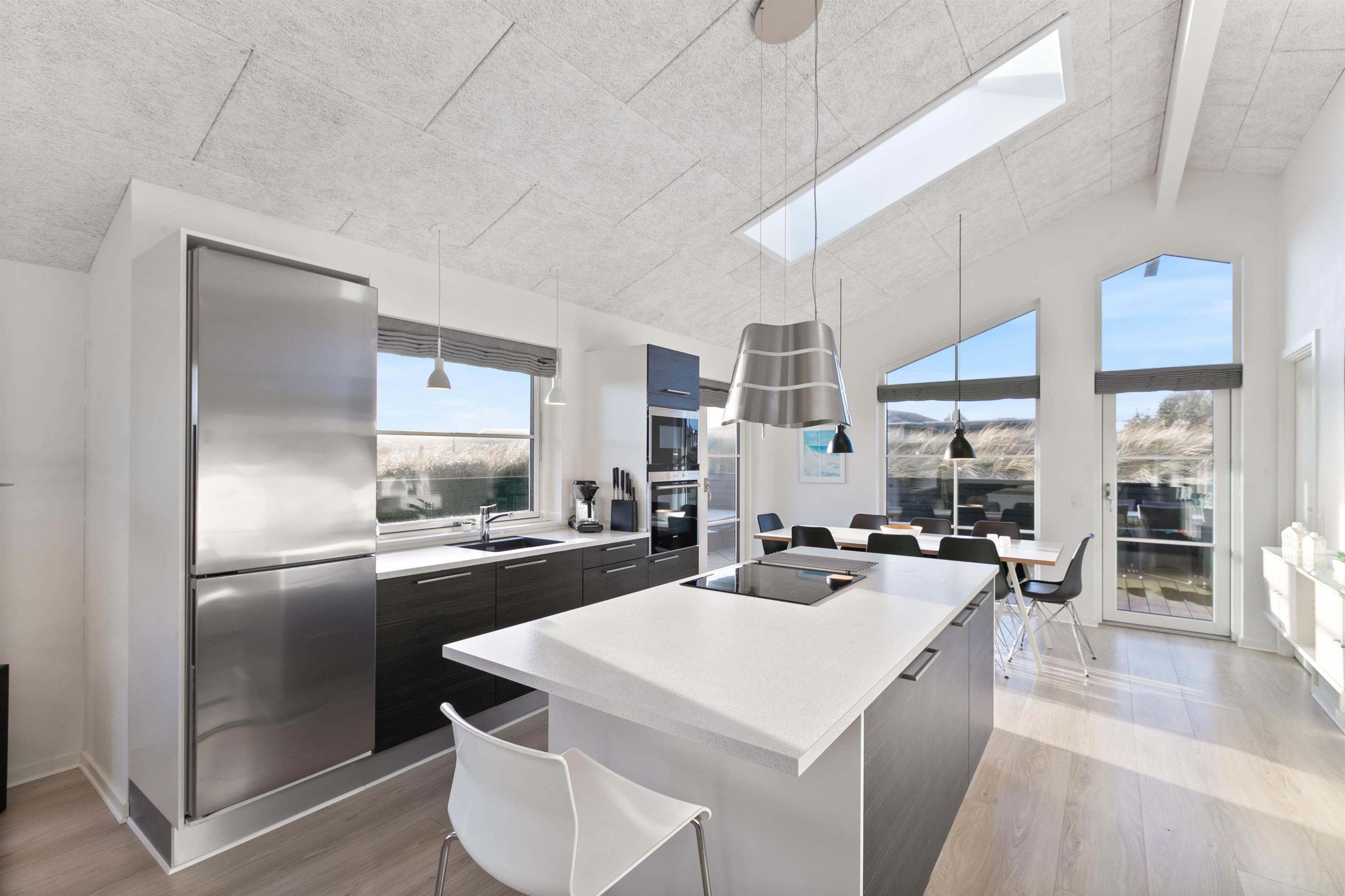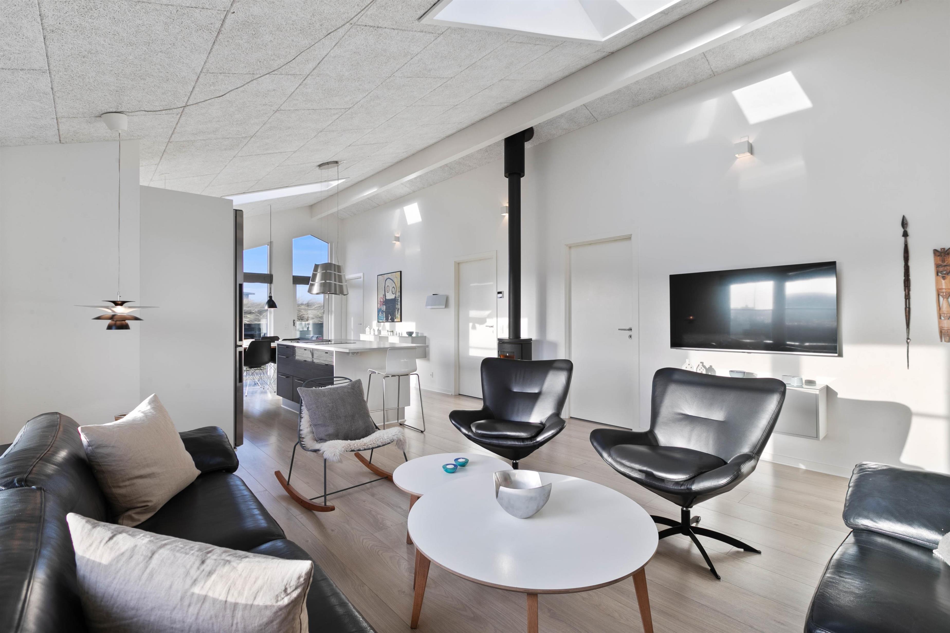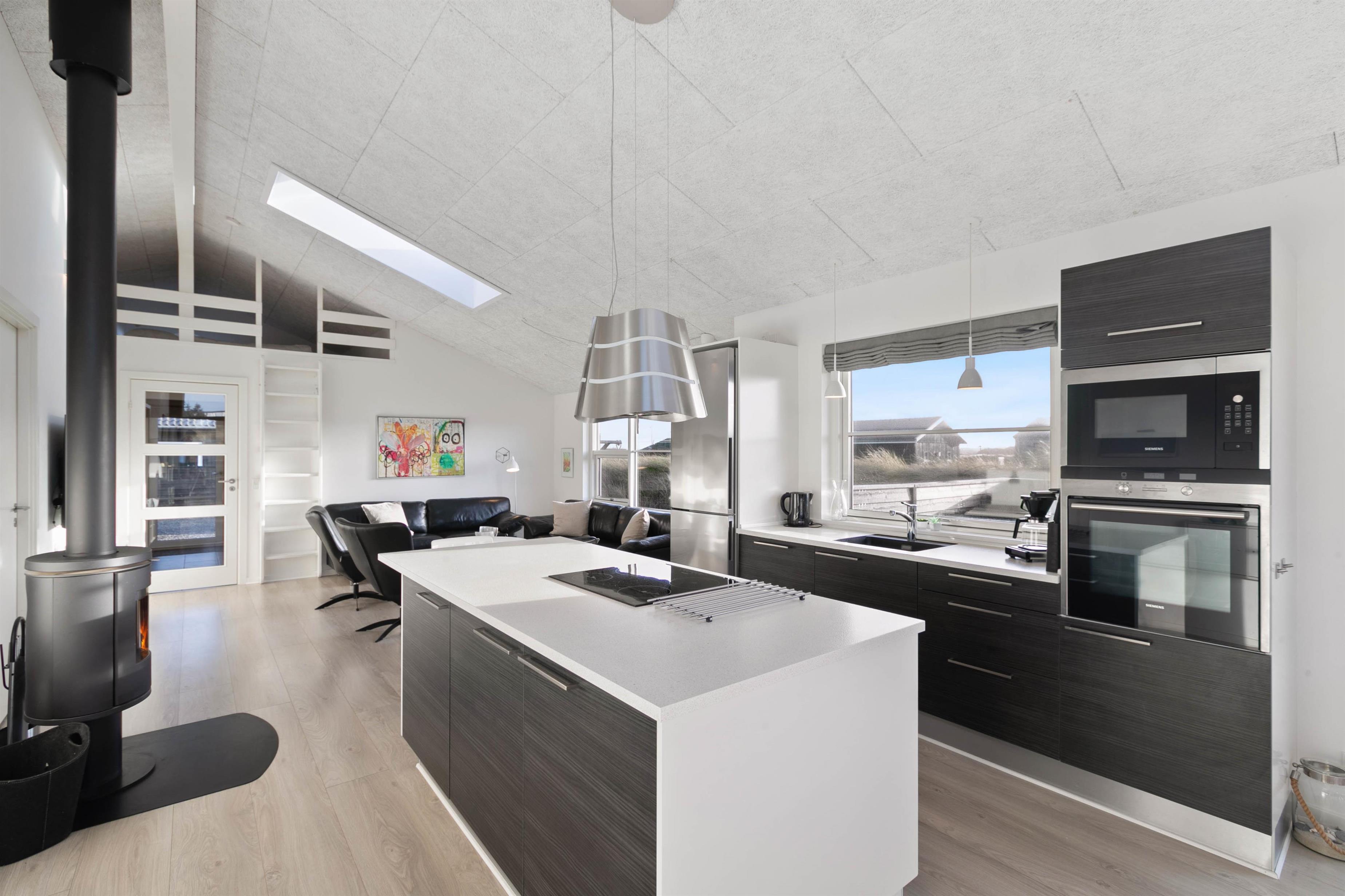 Køkkenet er i åben forbindelse med stuen, og med sin fantastiske akustik, smagfulde indretning, brændeovn og fladskærm er rummet det perfekte samlingssted for hele familien. Feriehuset har trådløst internet og det opvarmes billigt med naturgas. Der er gulvvarme i alle rum.
