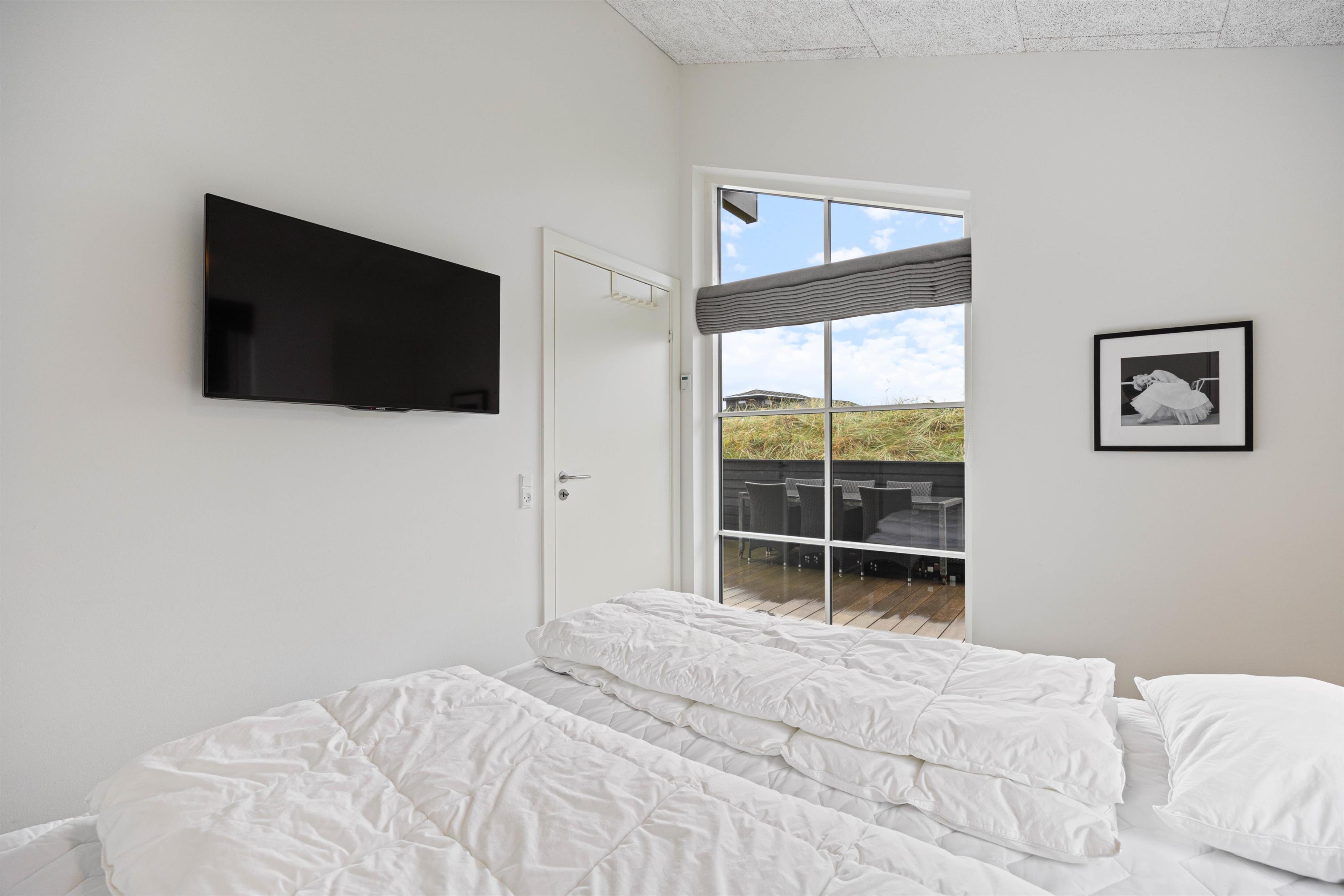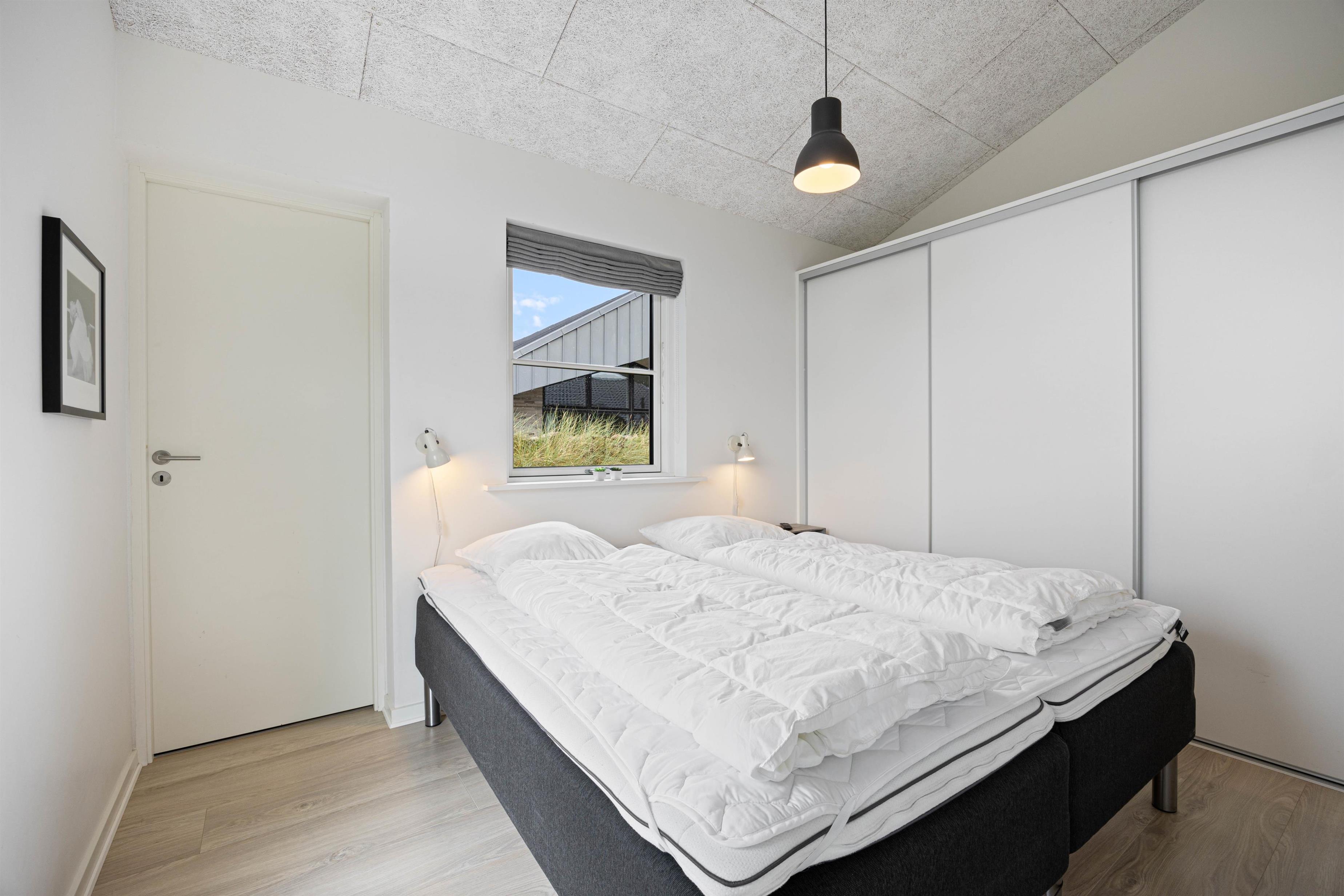 Dette sommerhus er opført i kvalitetsmaterialer og fremstår særdeles lyst og indbydende. Det har 3 store værelser med dobbeltseng, god skabsplads og fladskærm og desuden en hems med 2 ekstra sovepladser til de større børn.