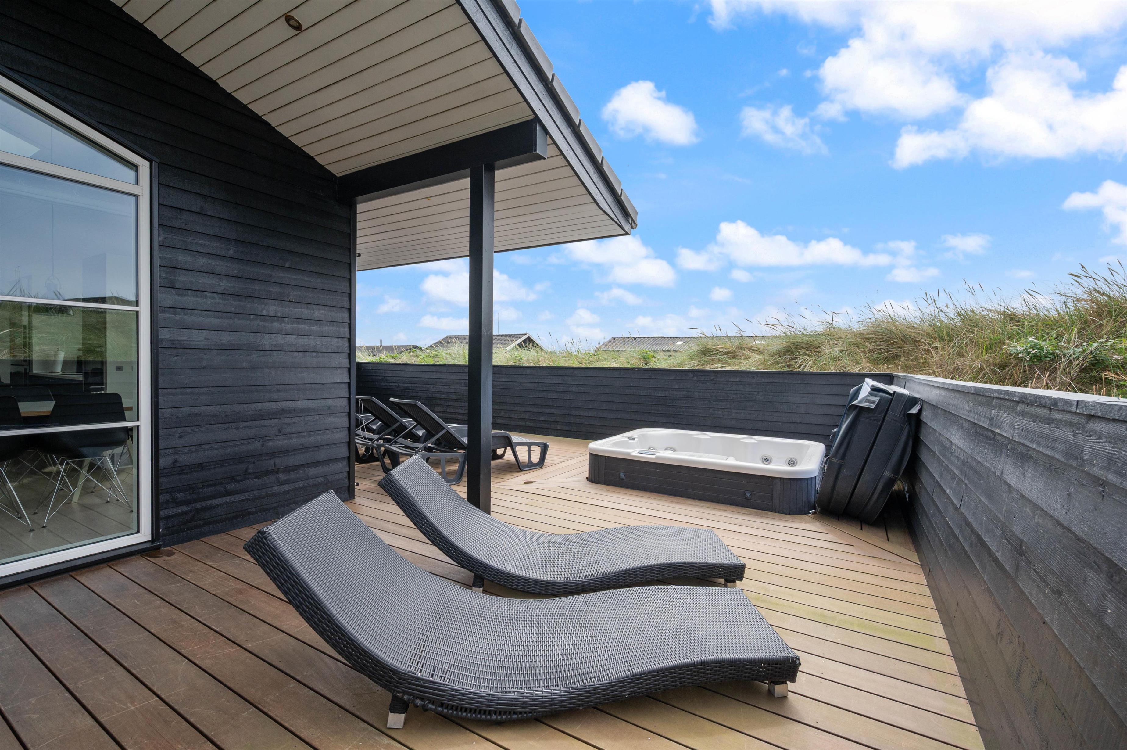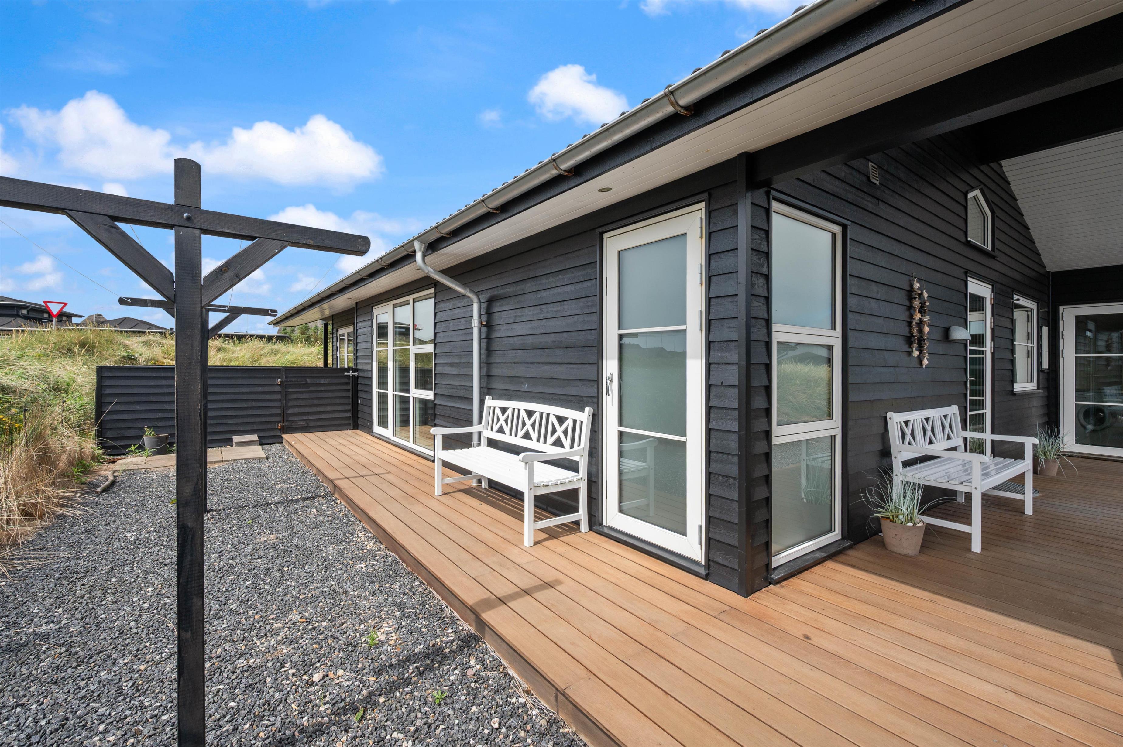 Uden for feriehusets rammer er der også mulighed for at nyde husets lækre faciliteter. Feriehusets terrasse er både overdækket, afskærmet og helt lukket , hvilket giver mulighed for at nyde udendørslivet uanset vind og vejr. Grillen og de komfortable havemøbler indbyder til hyggelige grillaftener med familien eller venner. Med kun 300 meter til havet kan I nemt tage en forfriskende dukkert eller gå en tur langs stranden.