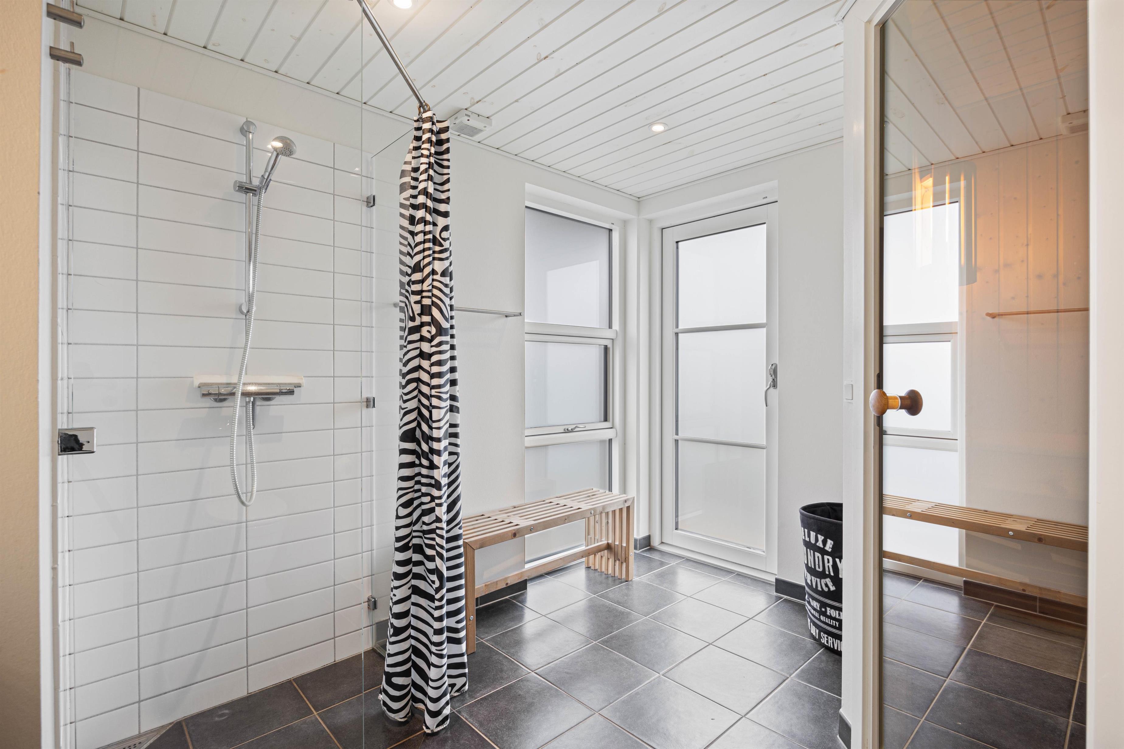 Der er 2 dejlige badeværelser – det ene med sauna og udgang til de skønne træterrasser, der omgiver feriehuset. På den lukkede og delvist overdækkede terrasse, er der en lækker udespa, som børnene vil elske at bade i om dagen, og hvori de voksne kan slappe af med et glas vin under stjernehimlen om aftenen. Den perfekte afslutning på en aktiv dag!