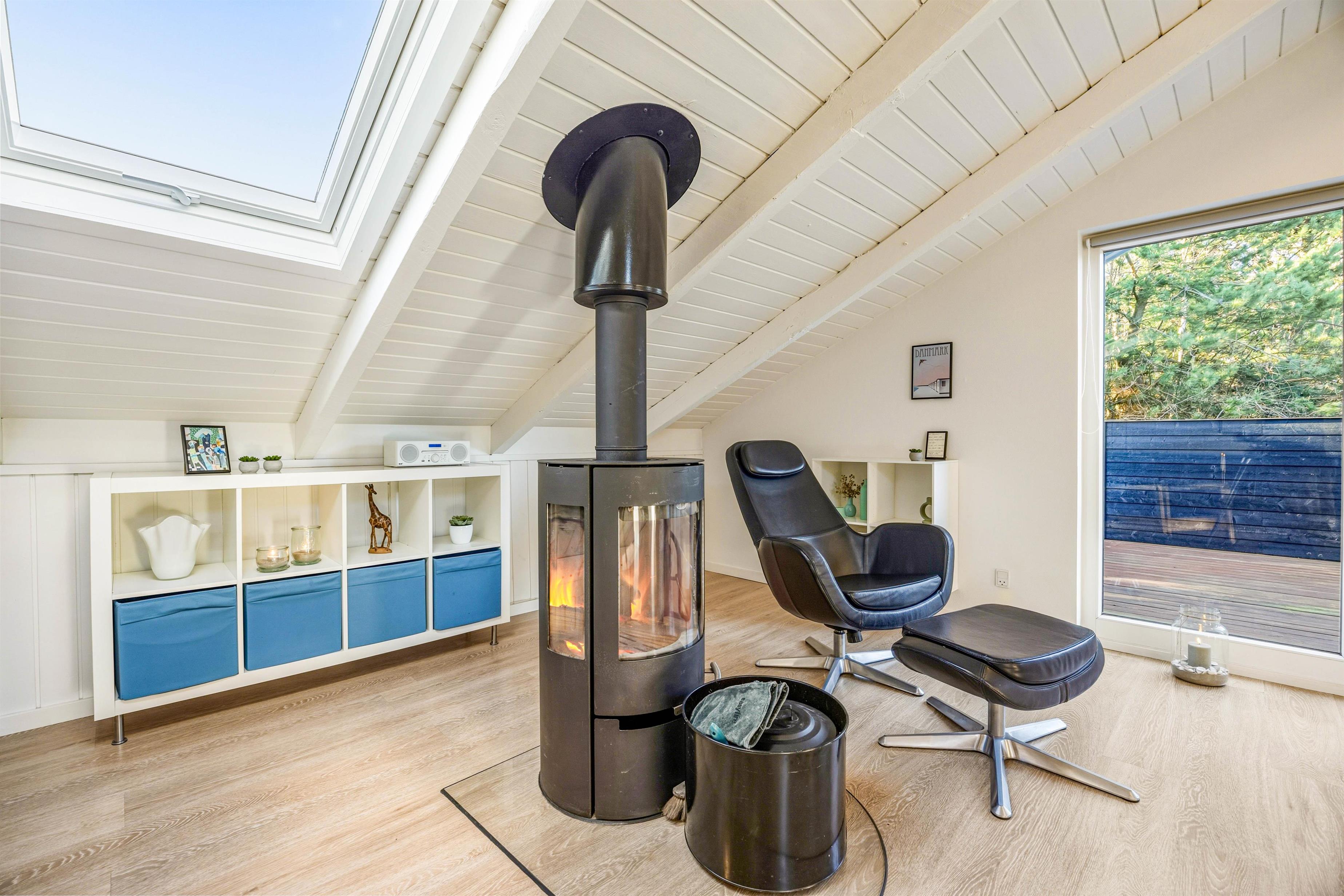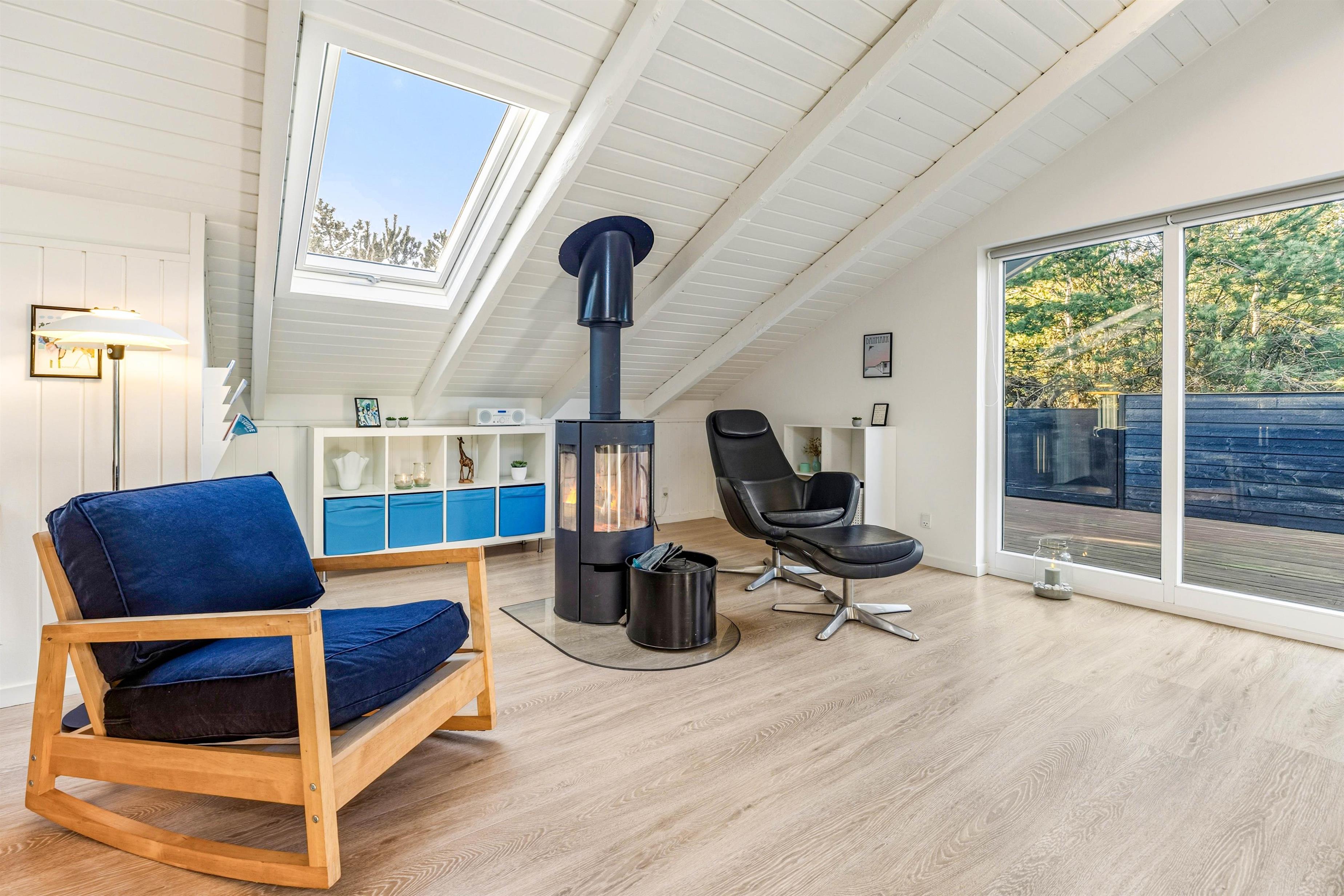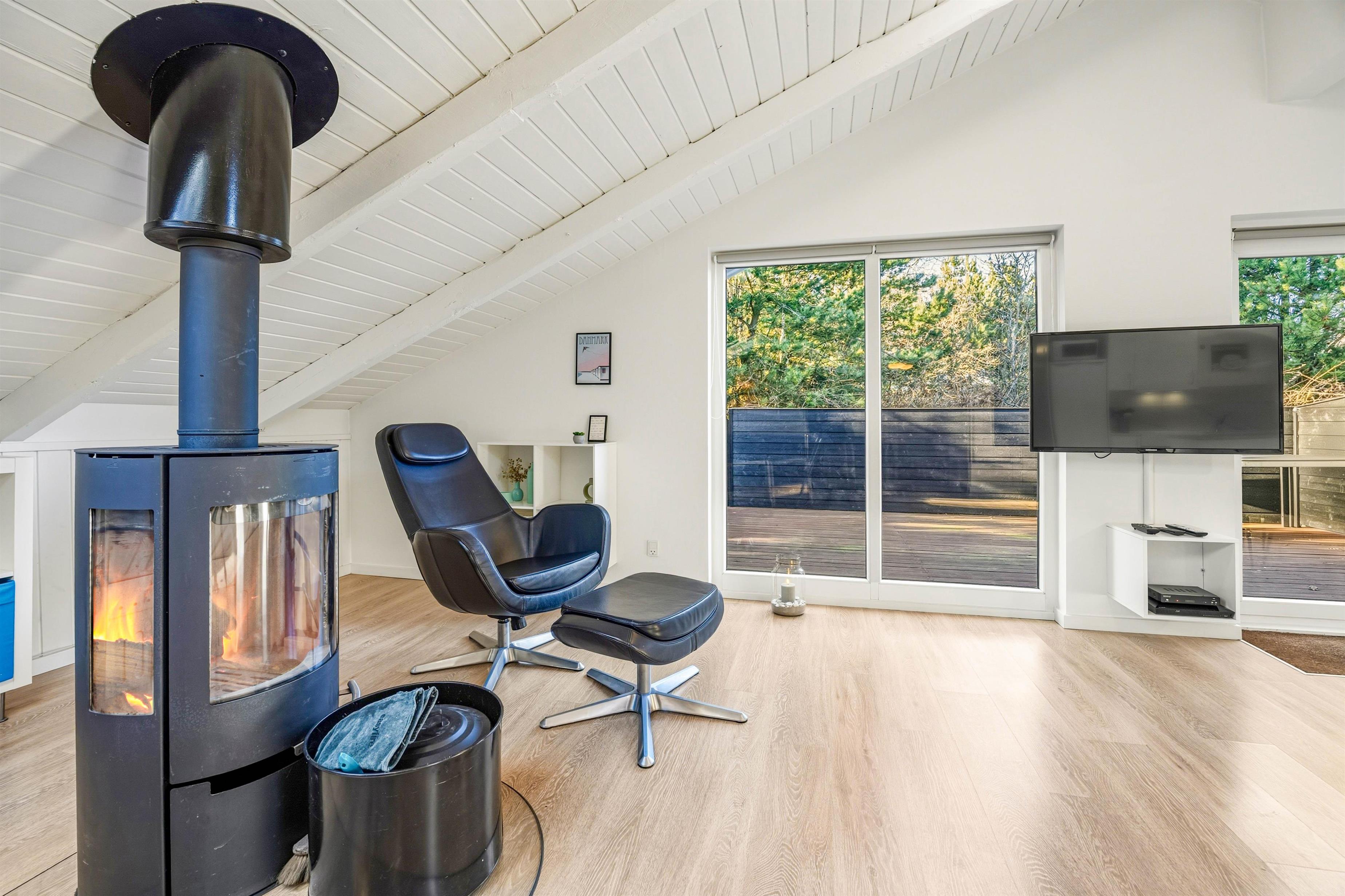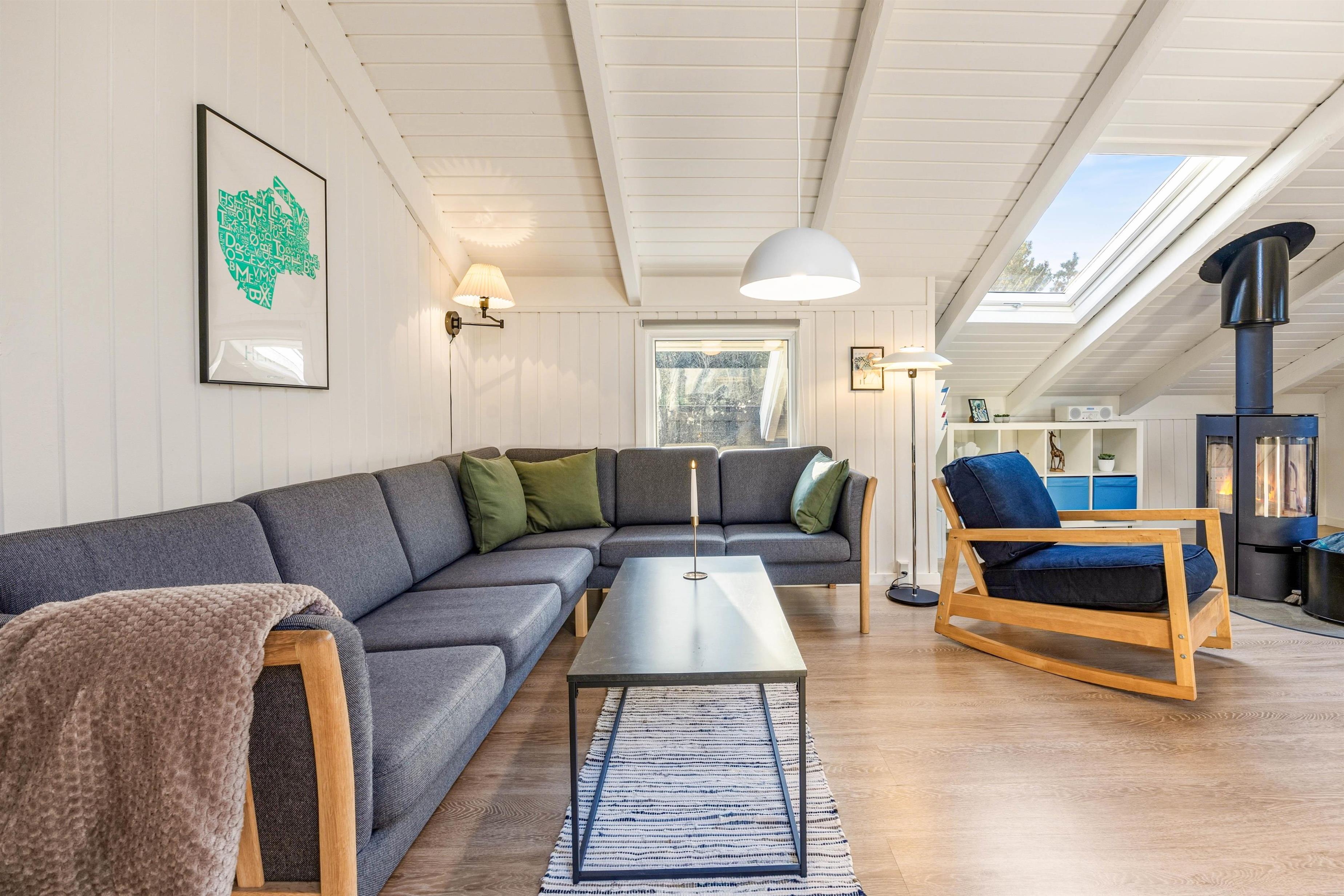 Sommerhuset hjerterum er helt sikkert den hyggelige stue, der er udstyret med komfortable møbler, brændeovn og fladskærm. Fra stuen er der udgang til vestvendt terrasse. Her er åbent til kip og godt lysindfald fra ovenlys vindue og terrasseparti. Den tidligere alkove i stuen er nu en hyggelig krog, perfekt til en afslappende dag med en bog foran brændeovnen. I sommerhuset er der også gratis trådløst internet, der sikrer at I altid kan følge med online om hvad der sker ude omkring i verdenen.