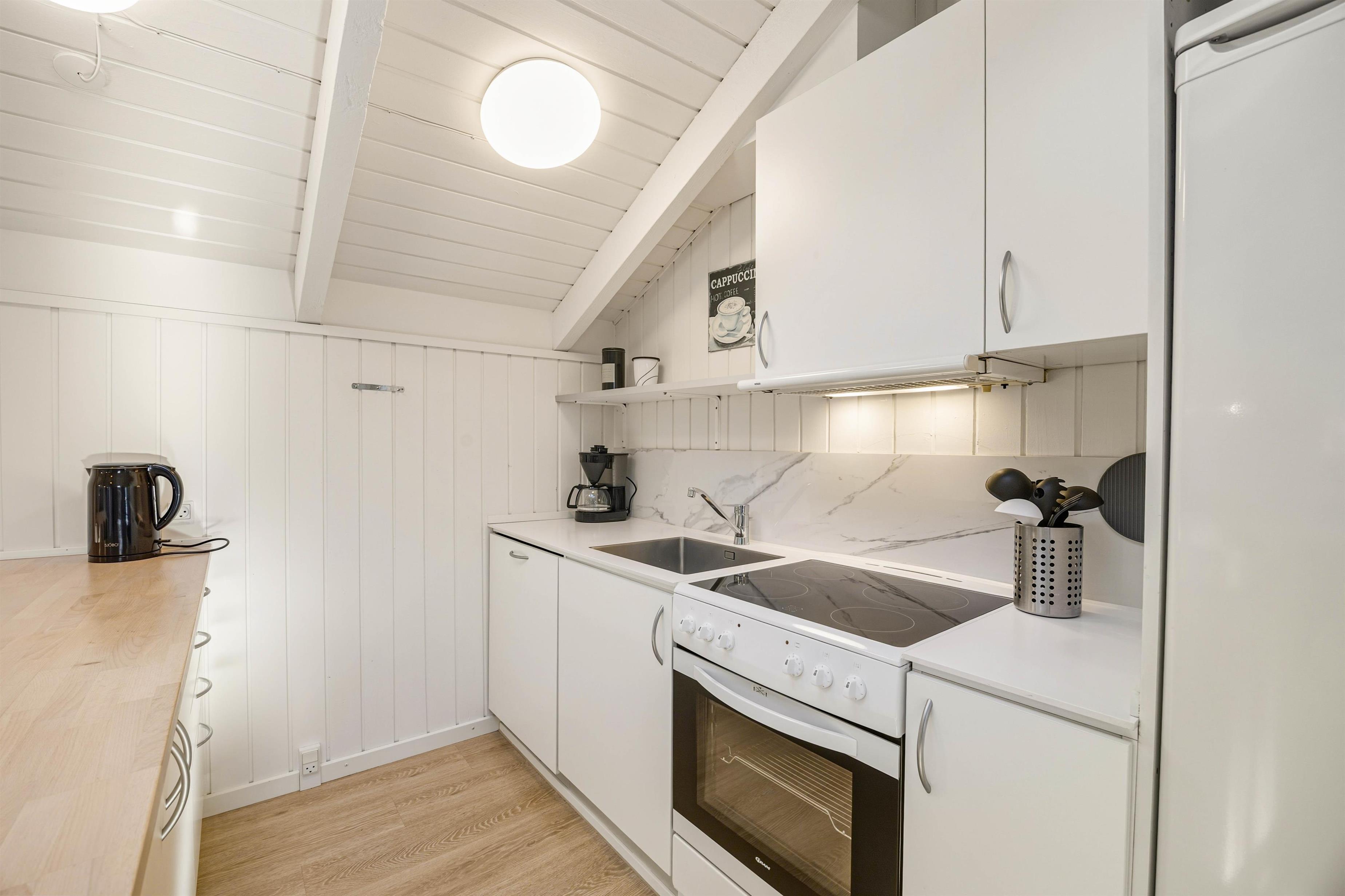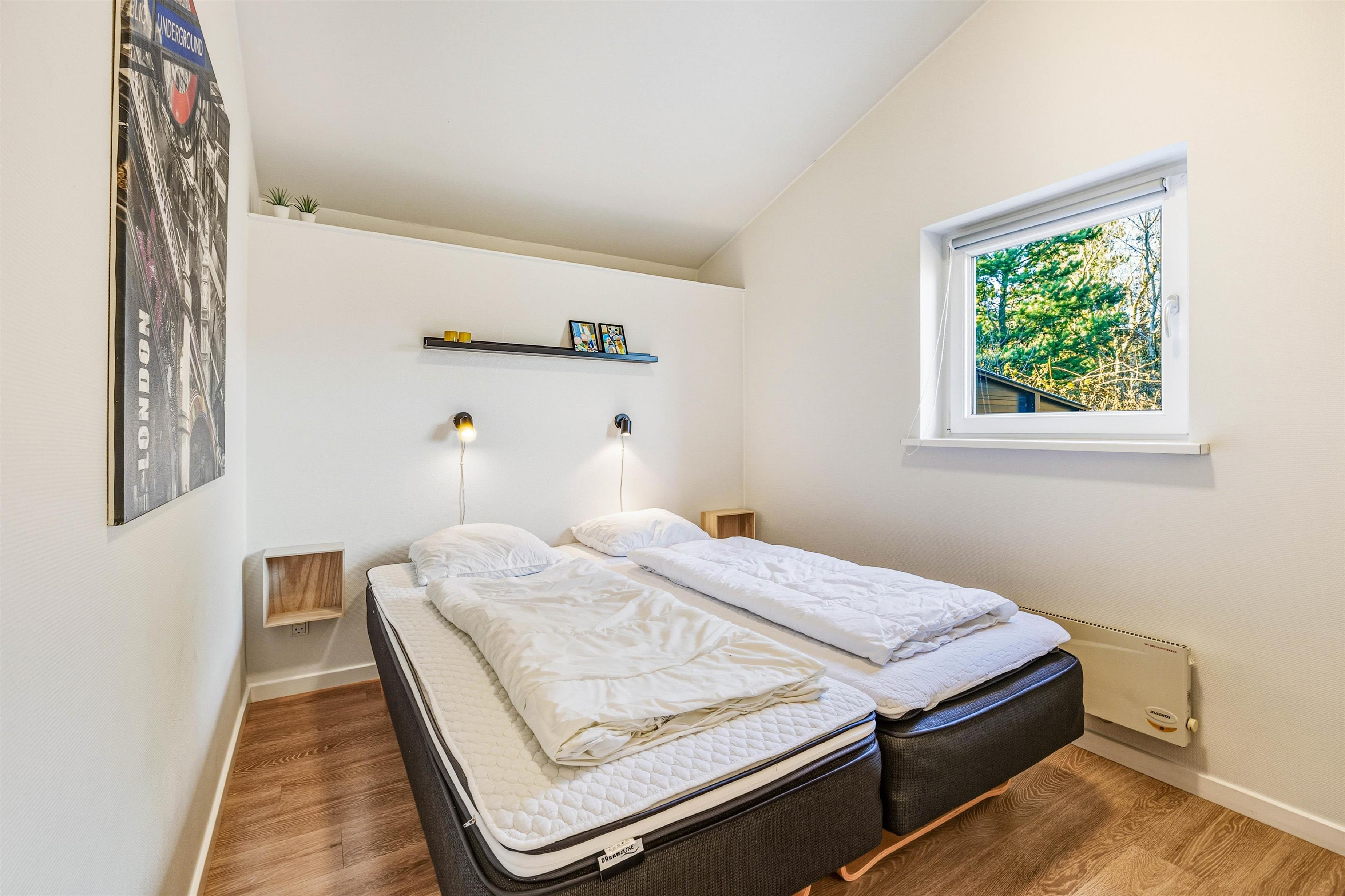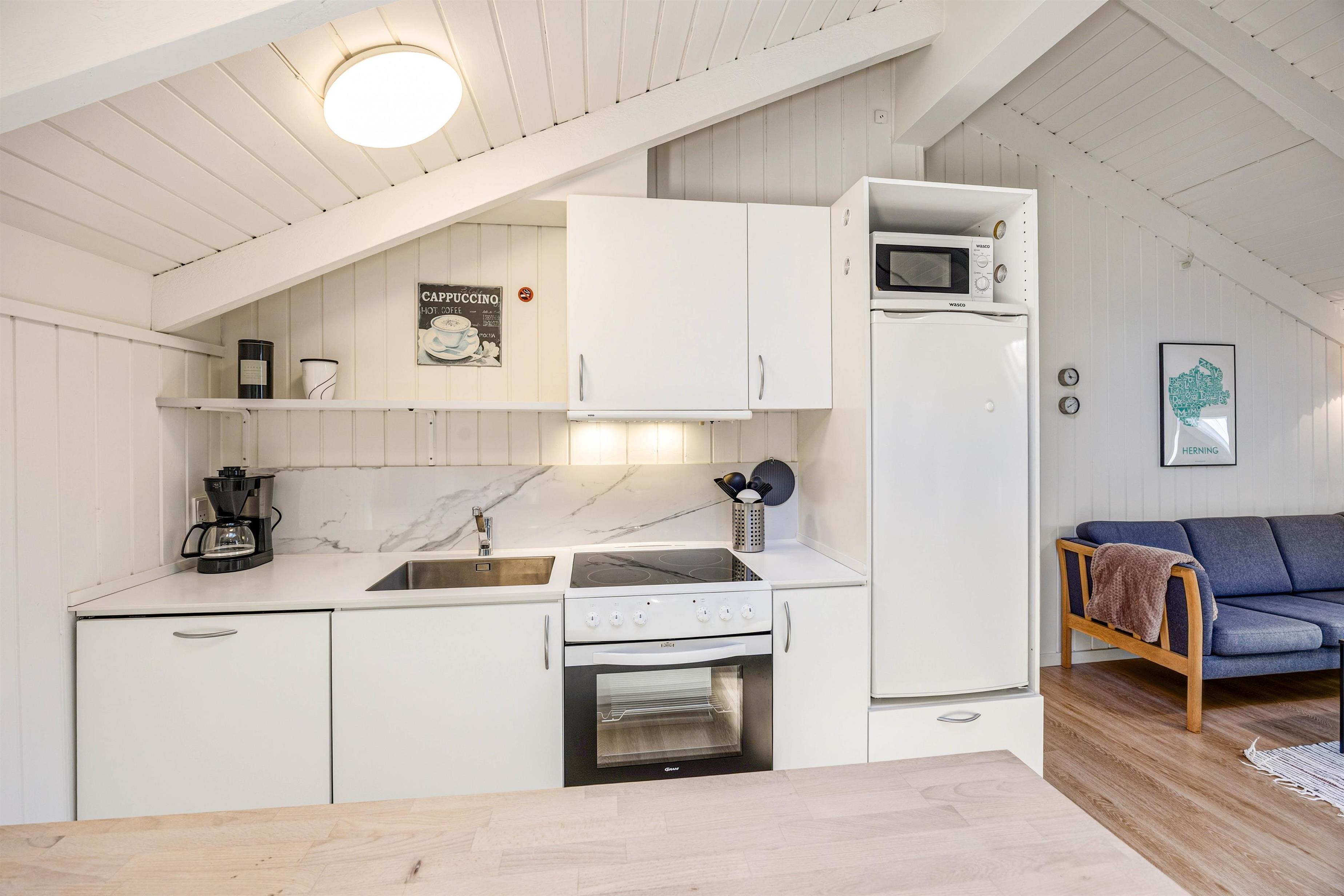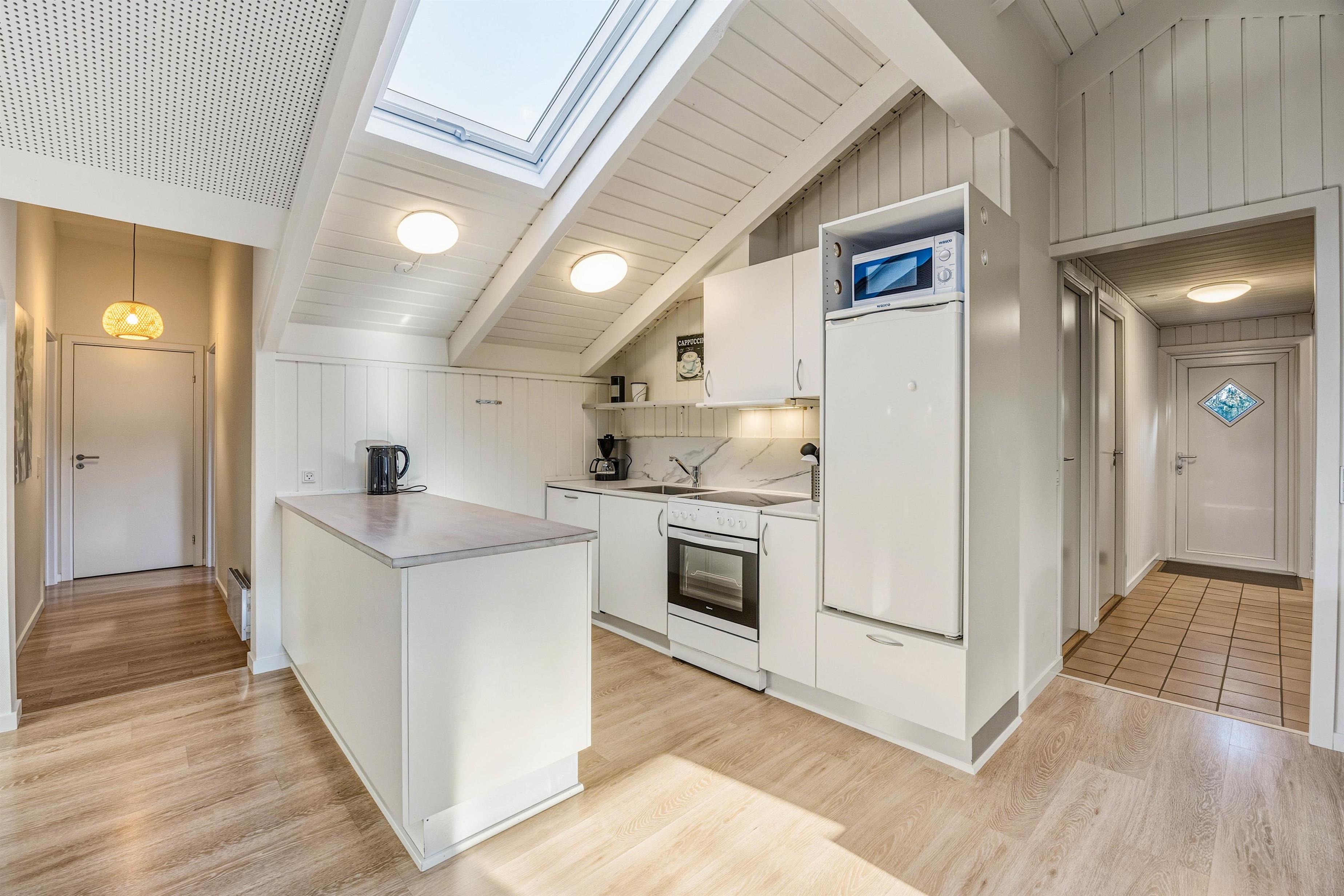 Feriehuset på Hvidbjergvej 9 har plads til 7 personer fordelt på 4 soveværelser. Her er 3 soveværelser med dobbeltsenge og et værelse med en enkeltseng, hvilket sikrer en god nats søvn for alle. Køkkenet står i åben forbindelse med stuen og er udstyret med mikroovn, opvaskemaskine og 100 liters separat fryser, så I nemt kan lave mad og opbevare jeres dagligvarer. Yderligere finder I både en vaskemaskine og en tørretumbler, så I kan tage jer af al praktisk vask.