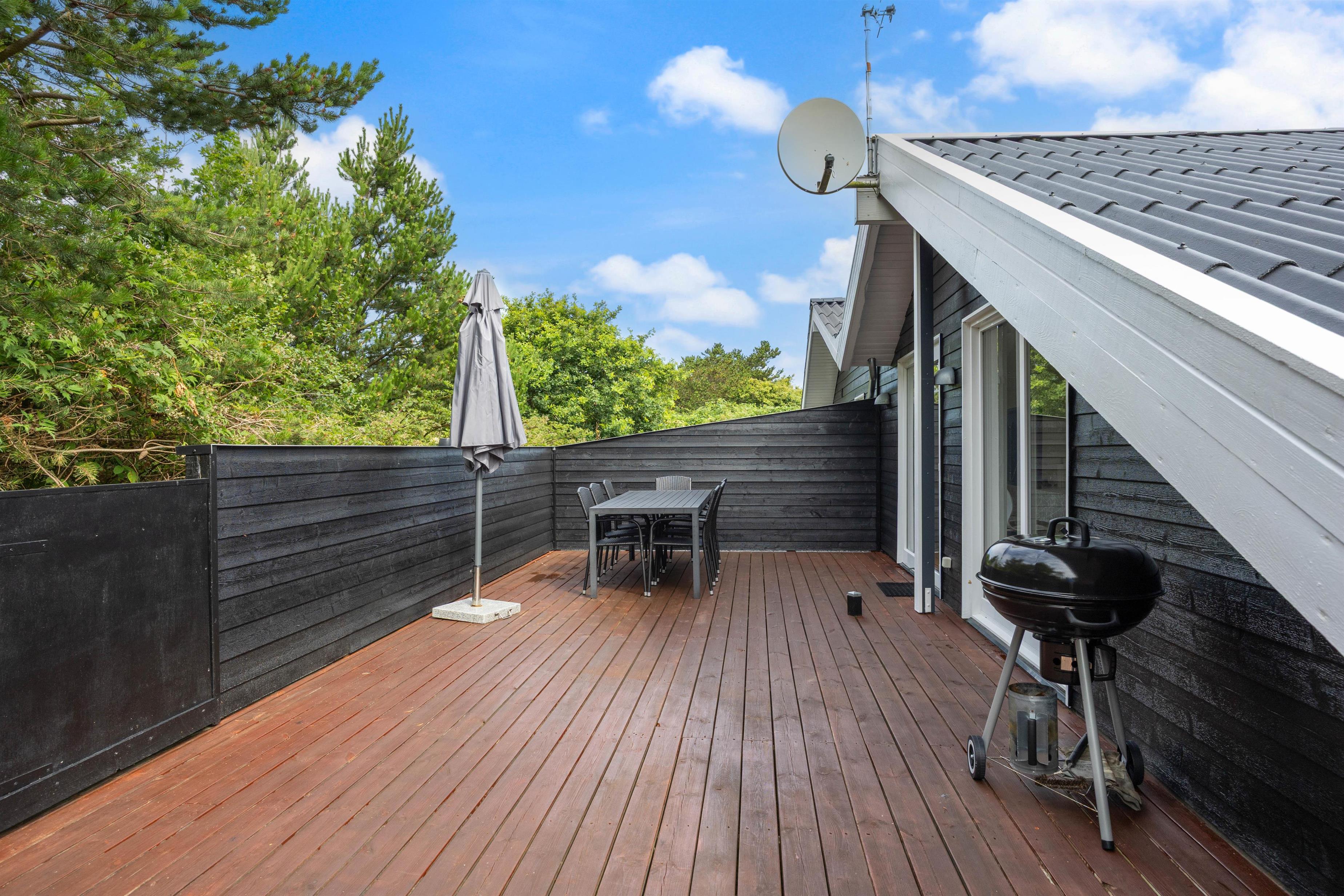 Sommerhuset har en indbydende lukket terrasse der vender mod syd og vest. Her er der naturligvis en tilhørende grill og havemøbler, perfekt til sommerens grillmiddage og hyggestunder med familie og venner. Den store naturgrund på 1200 kvadratmeter giver børnene rig mulighed for at lege og udforske, mens I nyder en afslappet dag i solen. Der er også tilladt at tage én hund med, så familiens firbenede medlem ikke behøver at blive efterladt derhjemme.