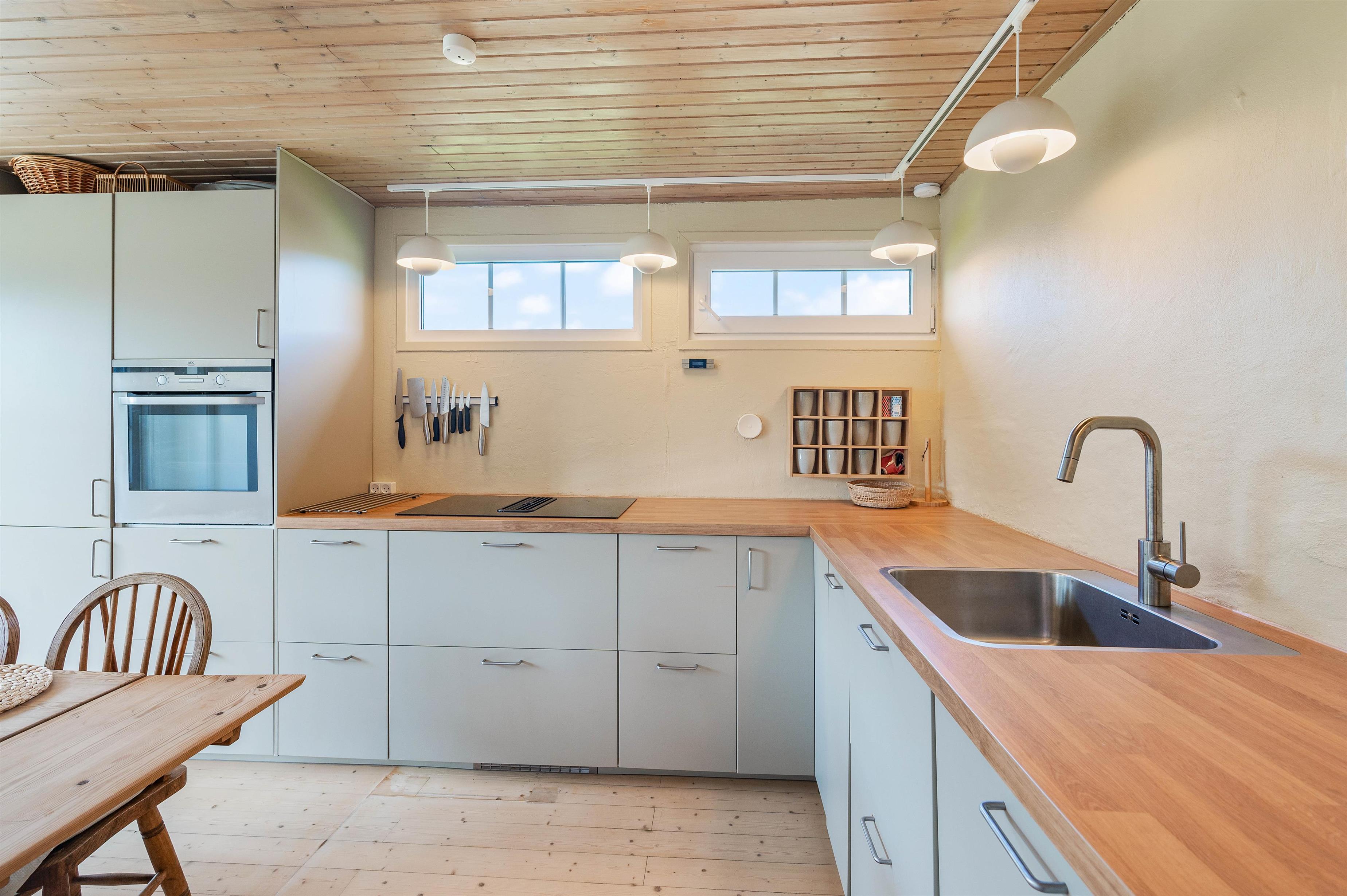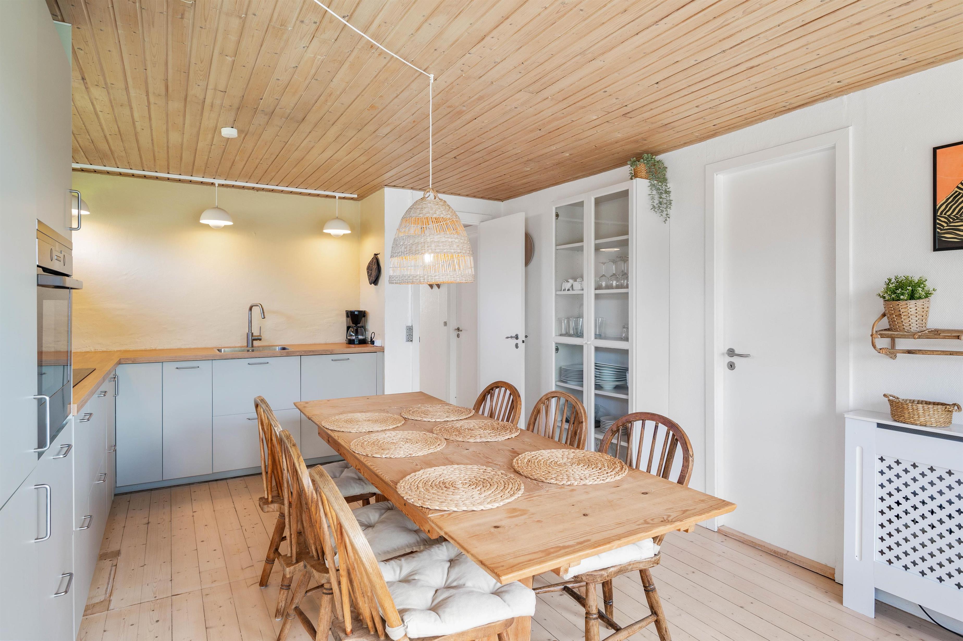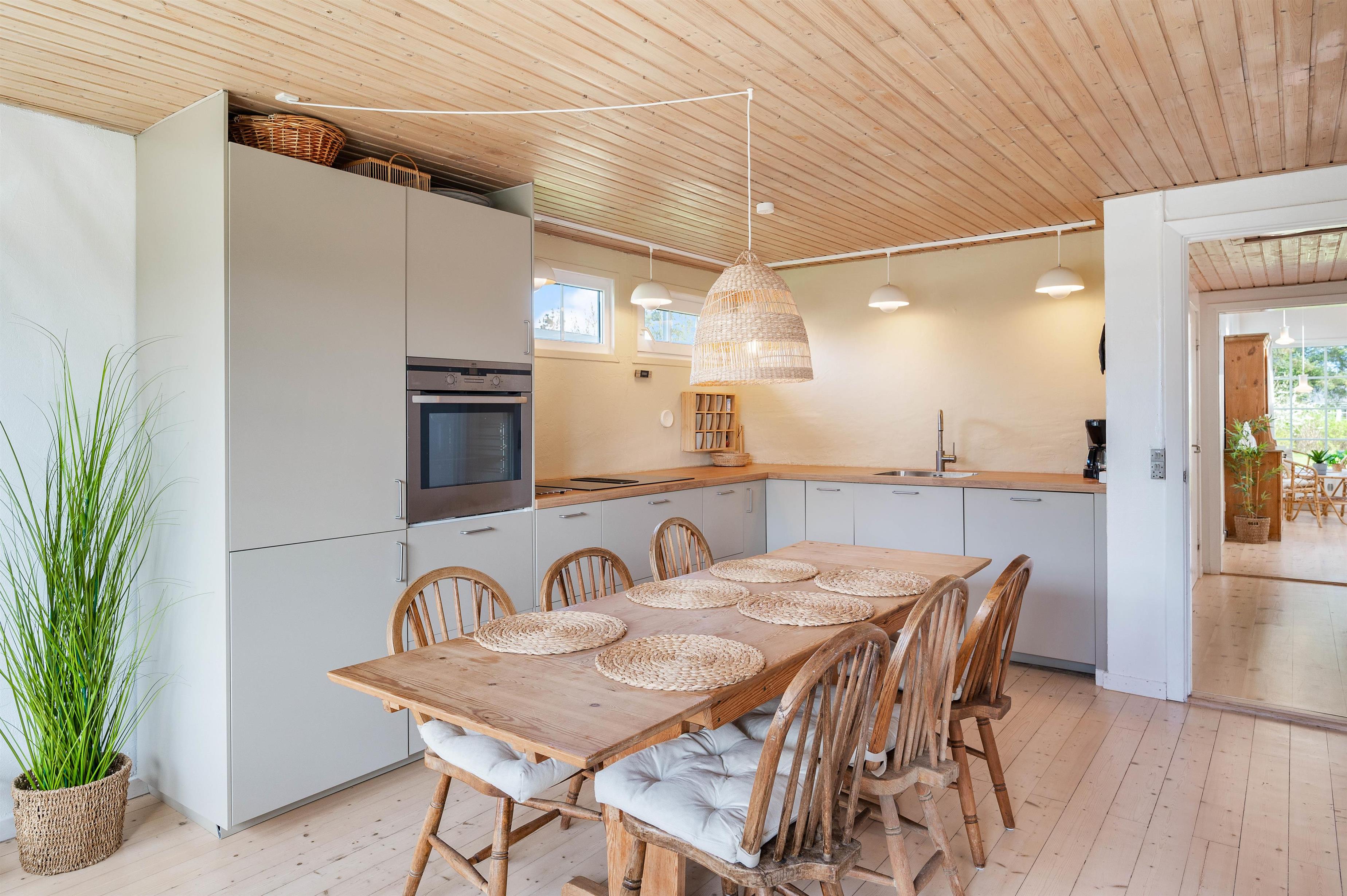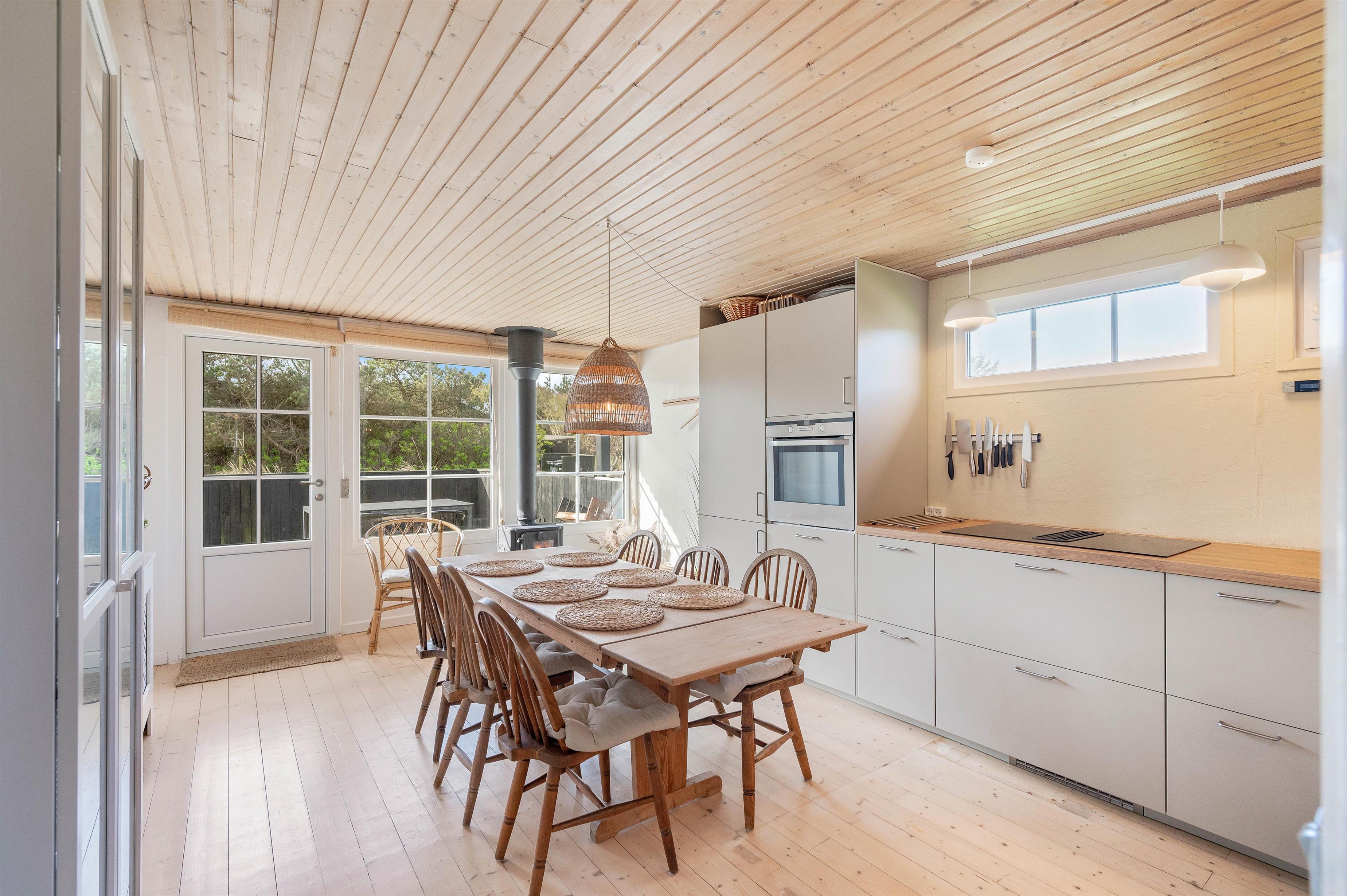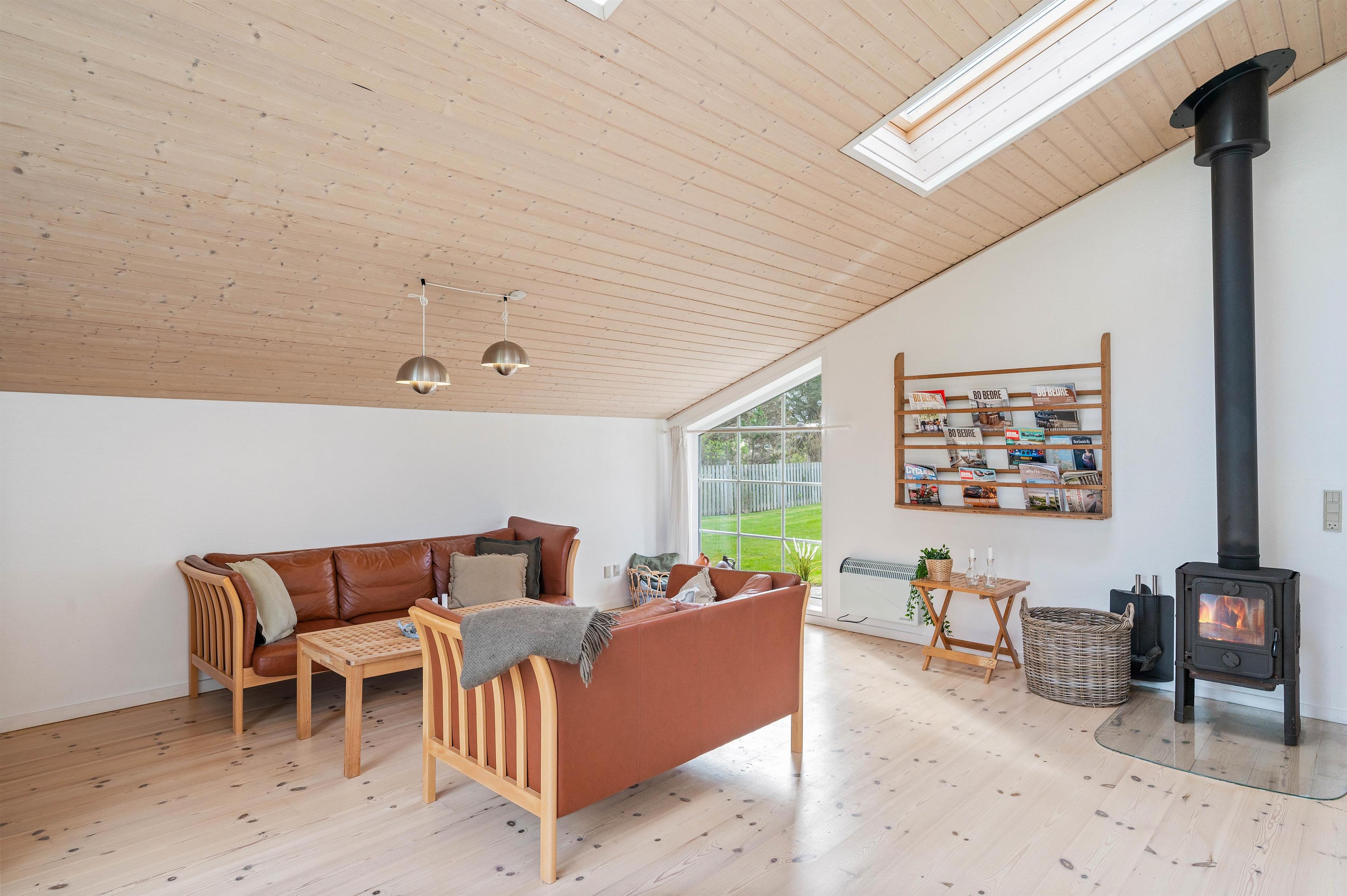 Når man træder ind i feriehuset, bliver man straks mødt af lyse farver og et virkelig godt lysindfald. Det træbeklædte loft skaber en klassisk sommerhusstemning. Køkkenet har en spiseplads separat fra opholdsstuen, så nogle kan se deres yndlingsserie i stuen, mens andre kan spille et spil kort ved spisebordet eller tilberede aftensmaden. På kolde og regnfulde dage kan man tænde op i brændeovnen og nyde den knitrende ild med en varm kop kakao. Der er installeret vaskemaskine, tørretumbler og opvaskemaskine i feriehuset, så I ikke behøver at bekymre jer om det huslige arbejde på ferien.