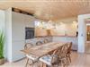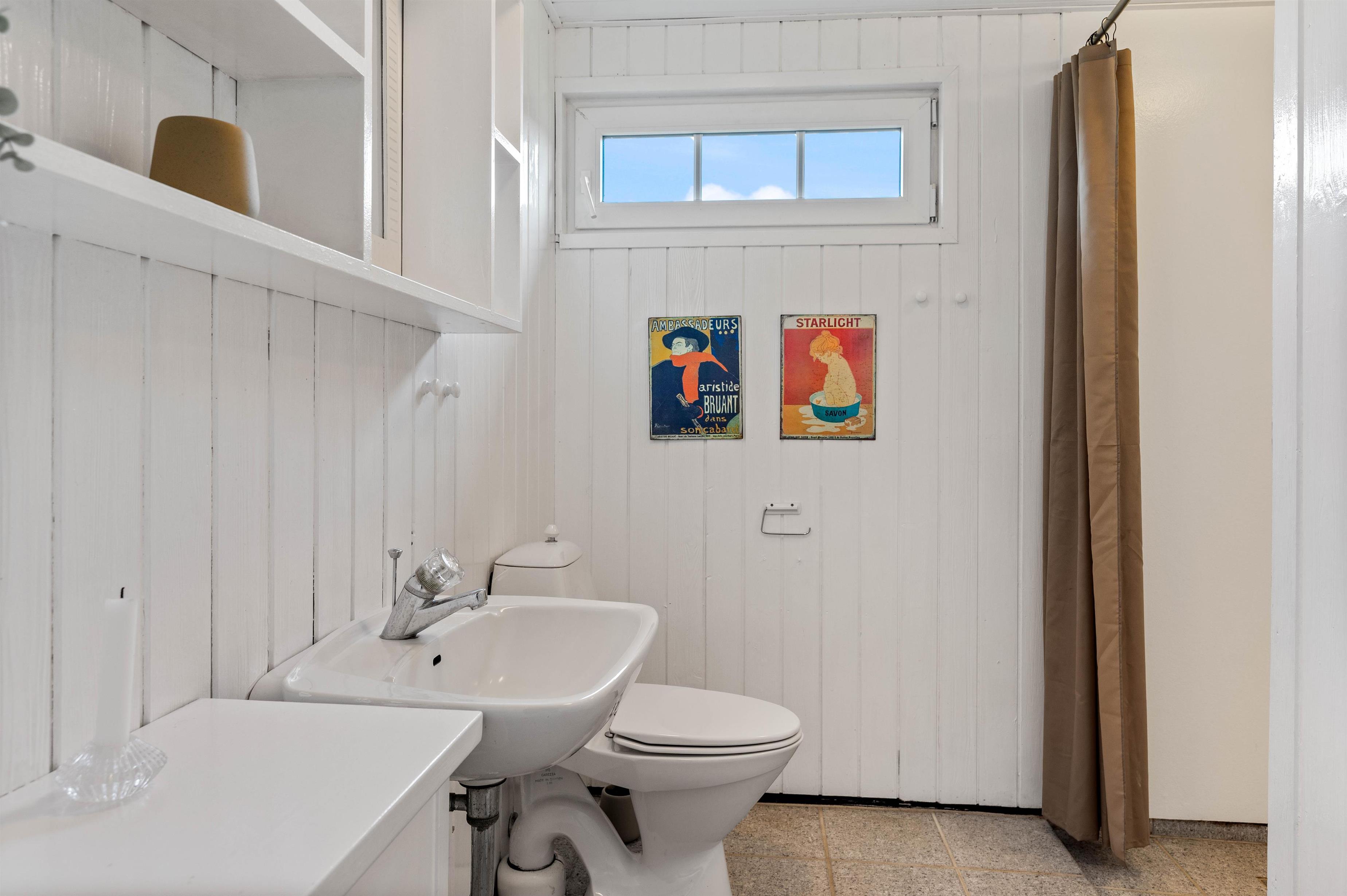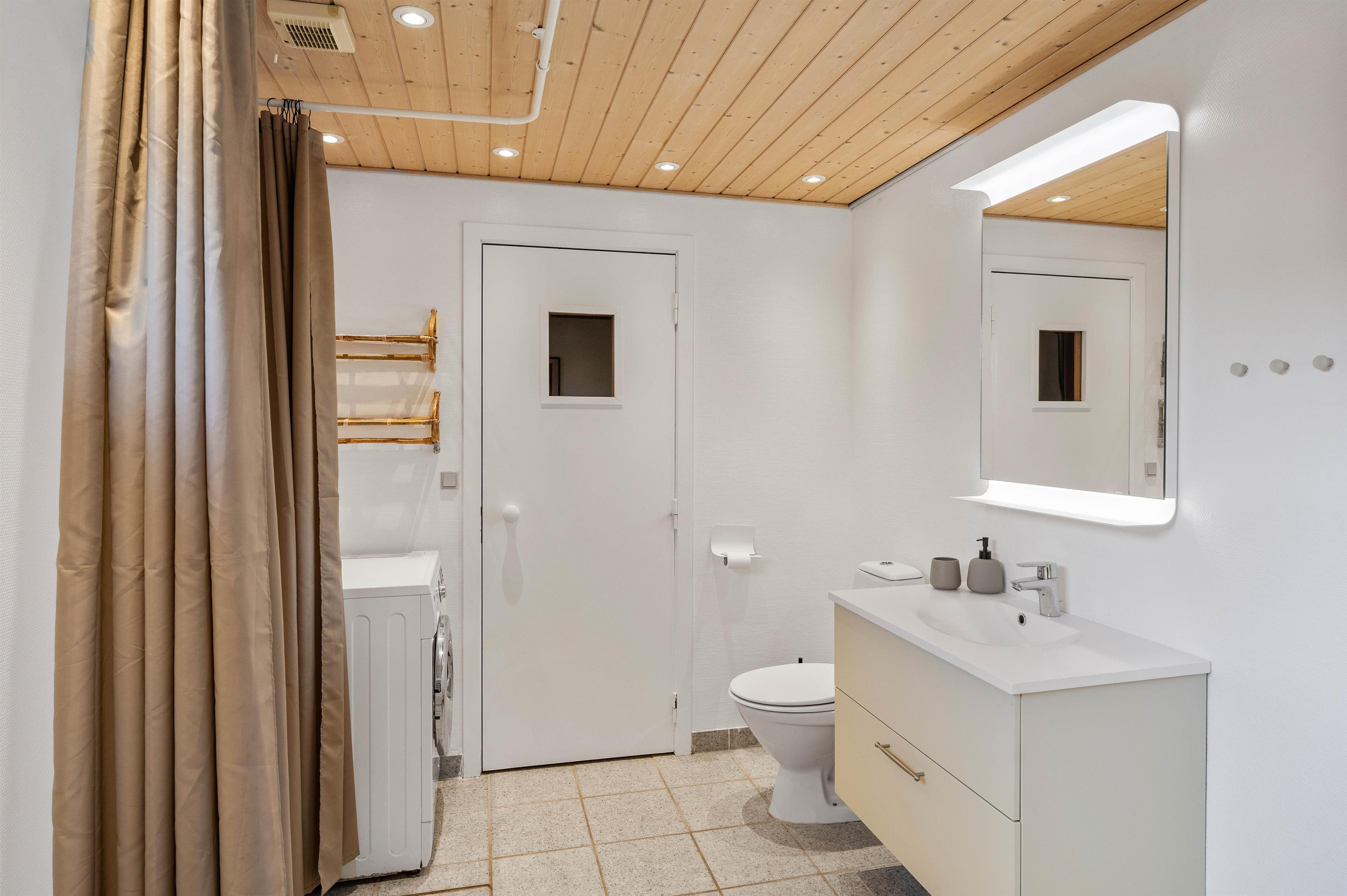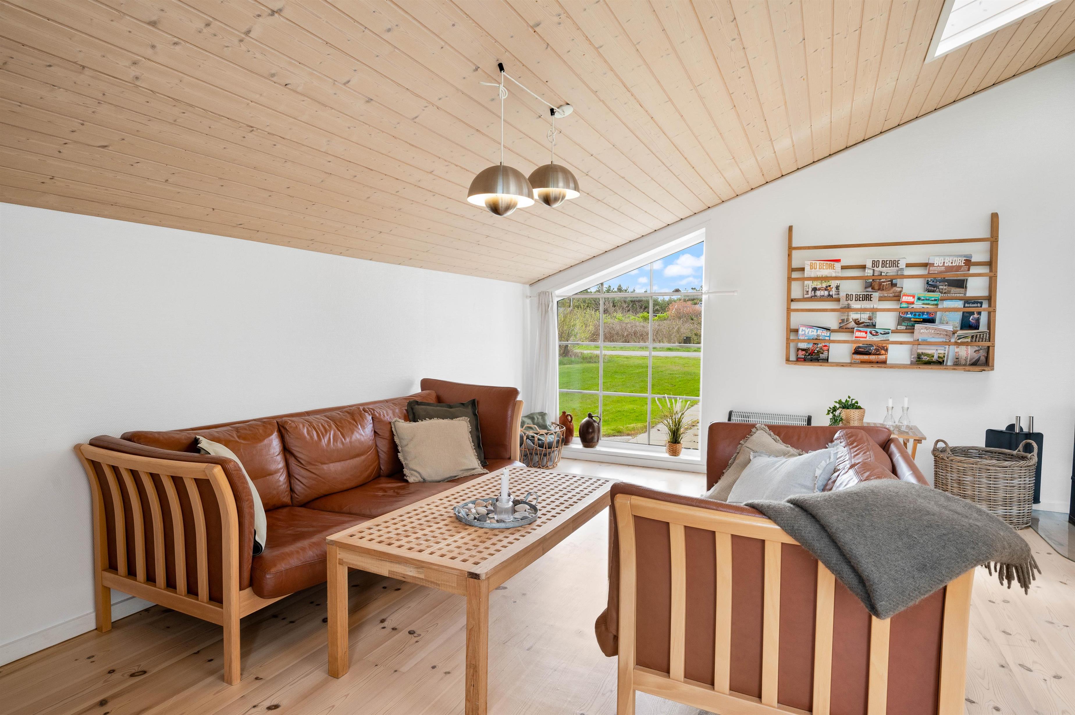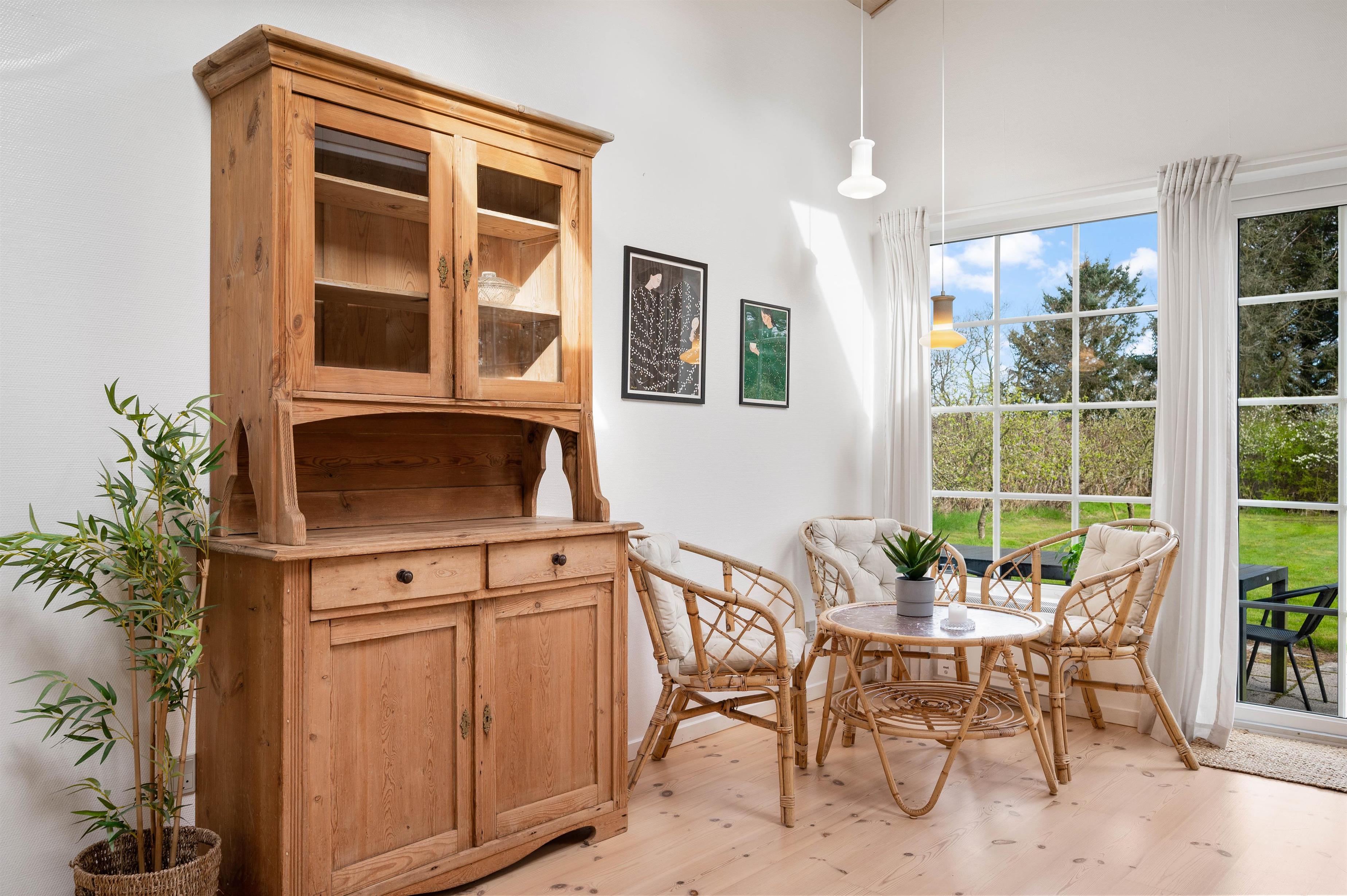Når man træder ind i feriehuset, bliver man straks mødt af lyse farver og et virkelig godt lysindfald. Det træbeklædte loft skaber en klassisk sommerhusstemning. Køkkenet har en spiseplads separat fra opholdsstuen, så nogle kan se deres yndlingsserie i stuen, mens andre kan spille et spil kort ved spisebordet eller tilberede aftensmaden. På kolde og regnfulde dage kan man tænde op i brændeovnen og nyde den knitrende ild med en varm kop kakao. Der er installeret vaskemaskine, tørretumbler og opvaskemaskine i feriehuset, så I ikke behøver at bekymre jer om det huslige arbejde på ferien.