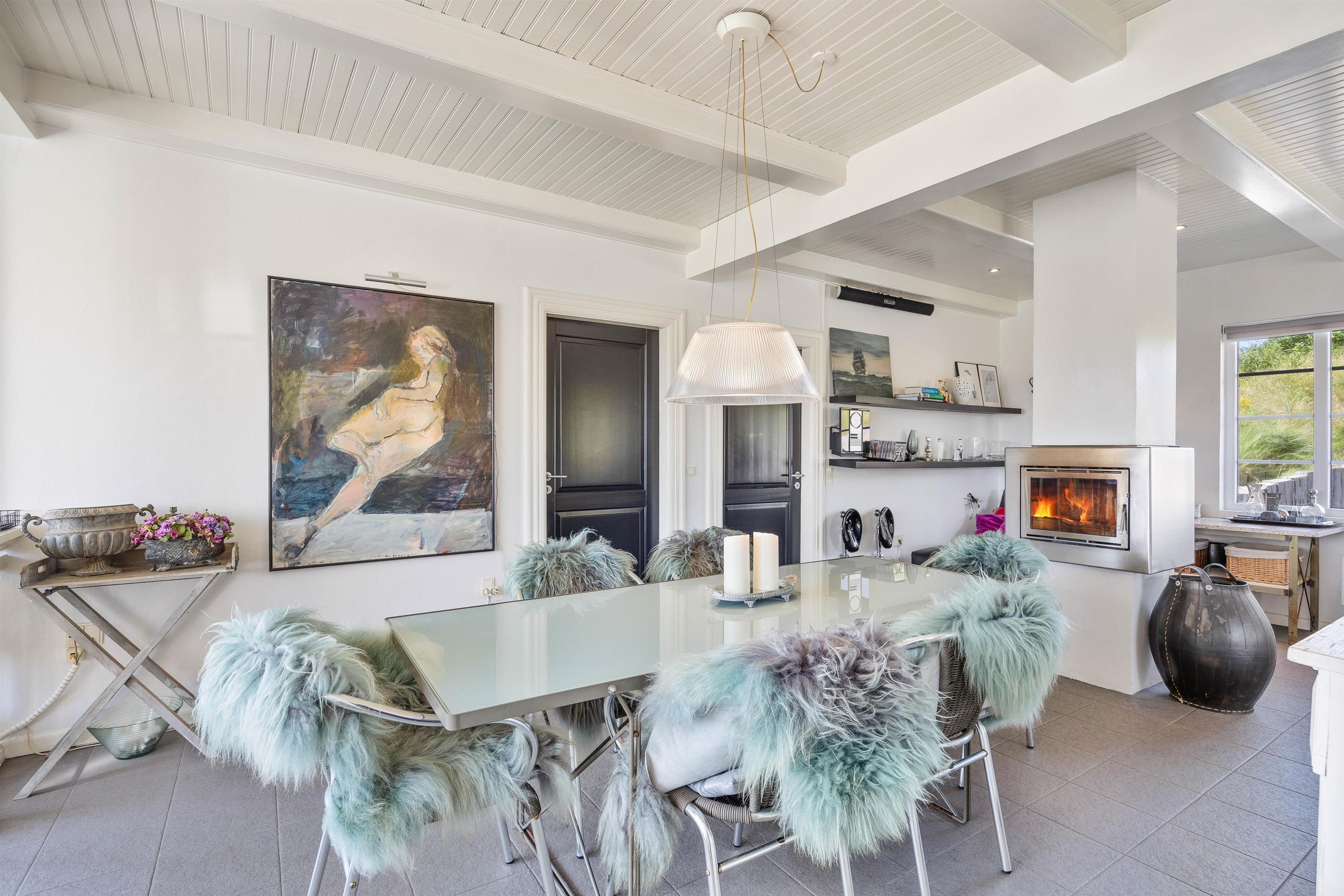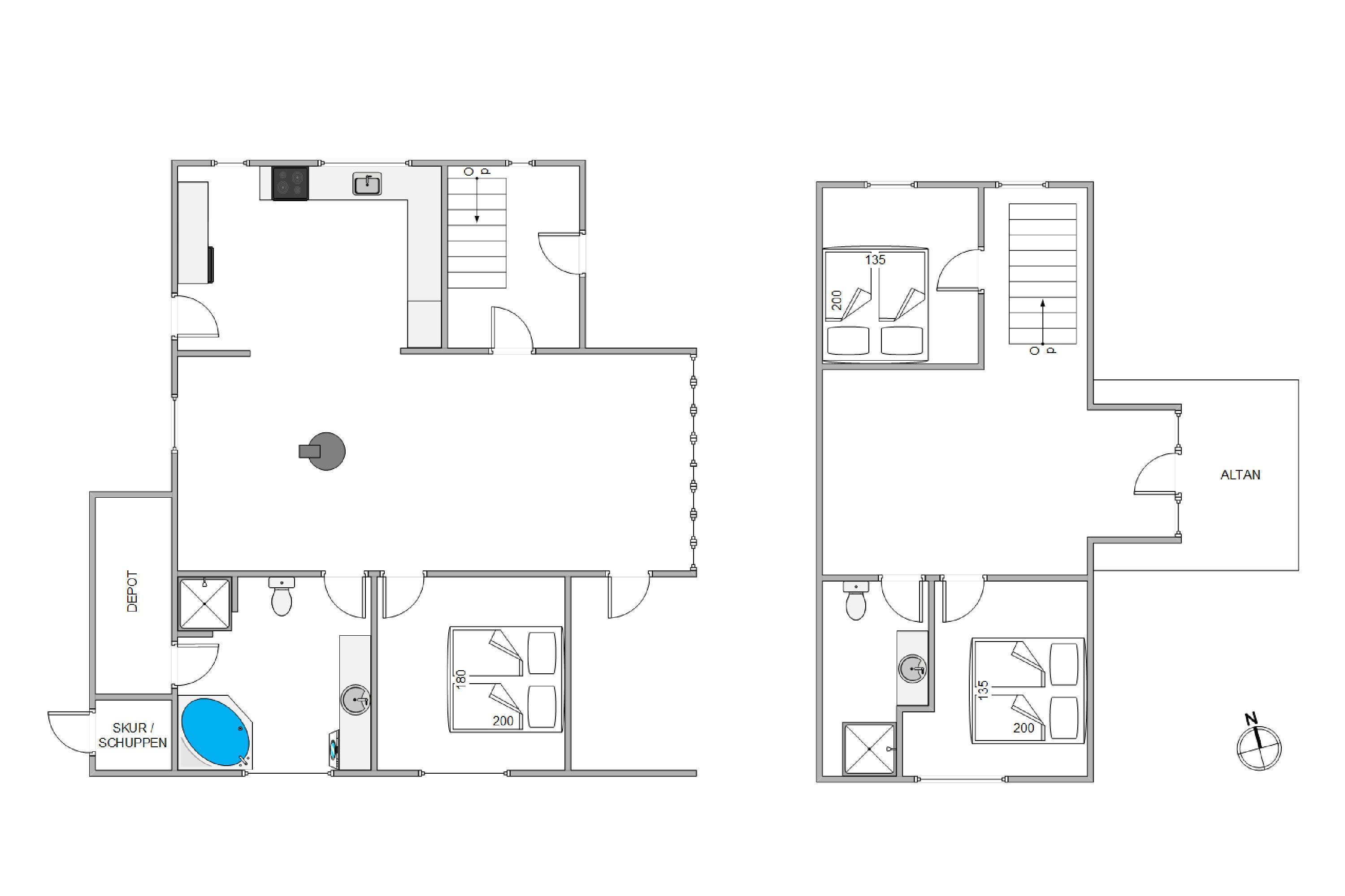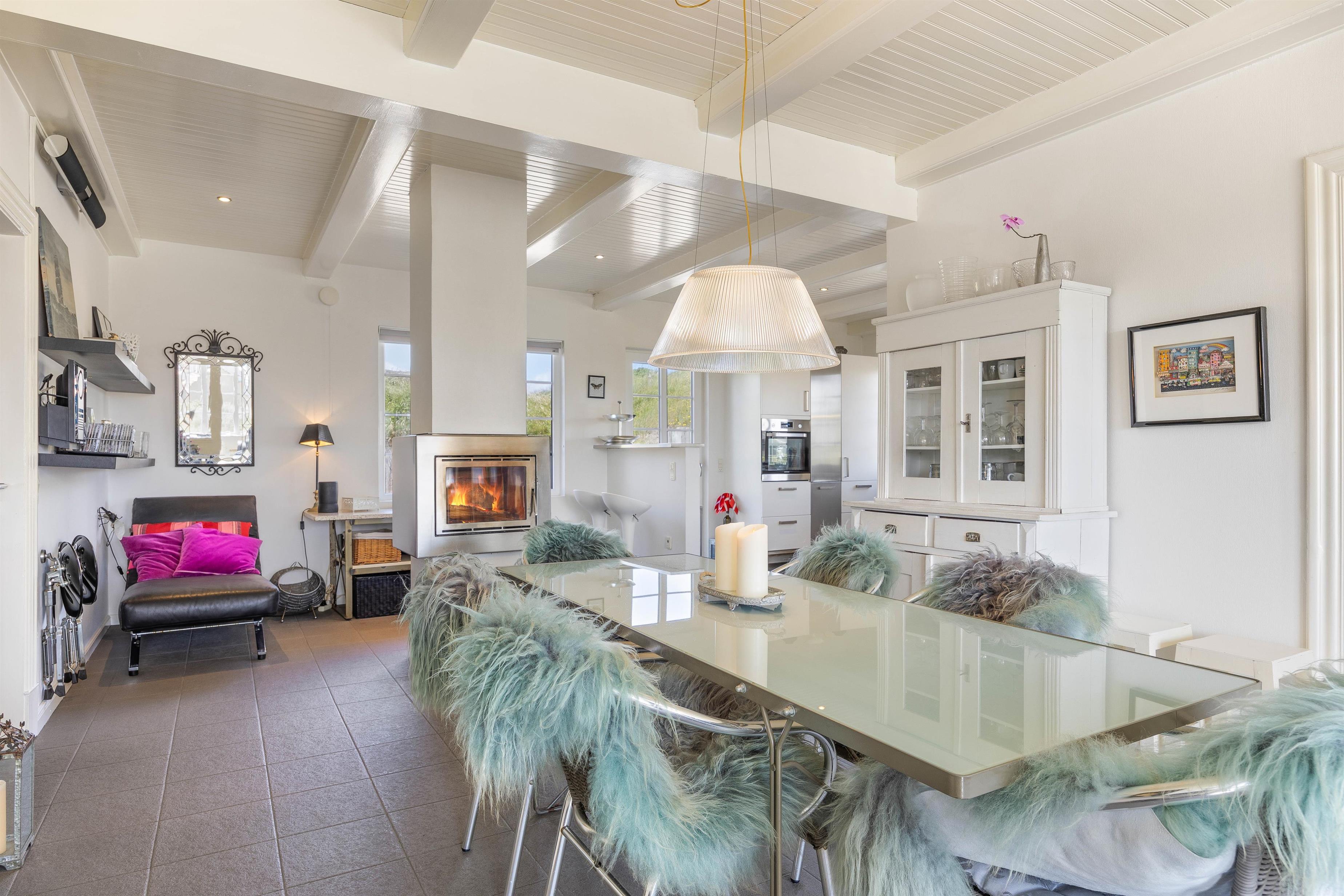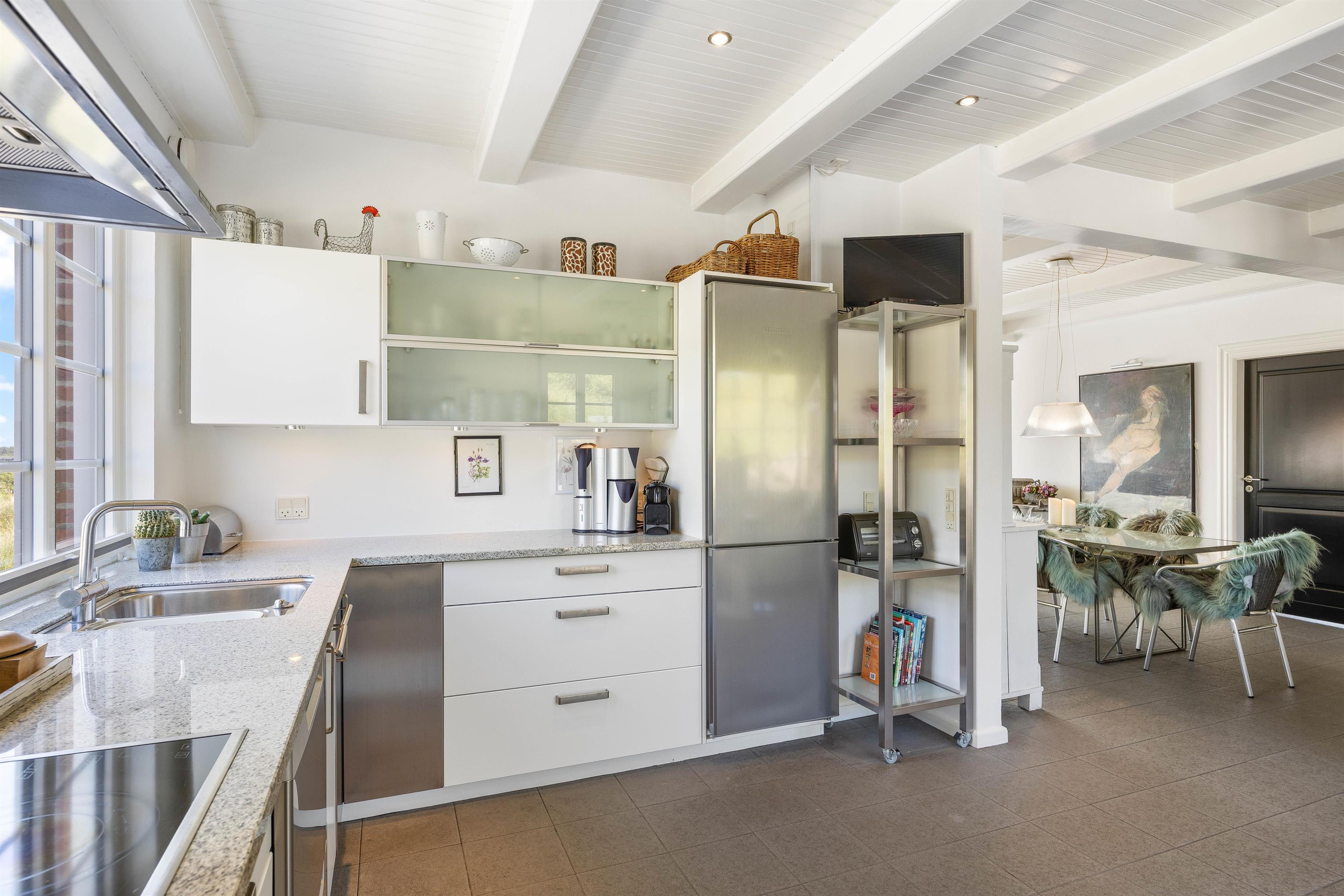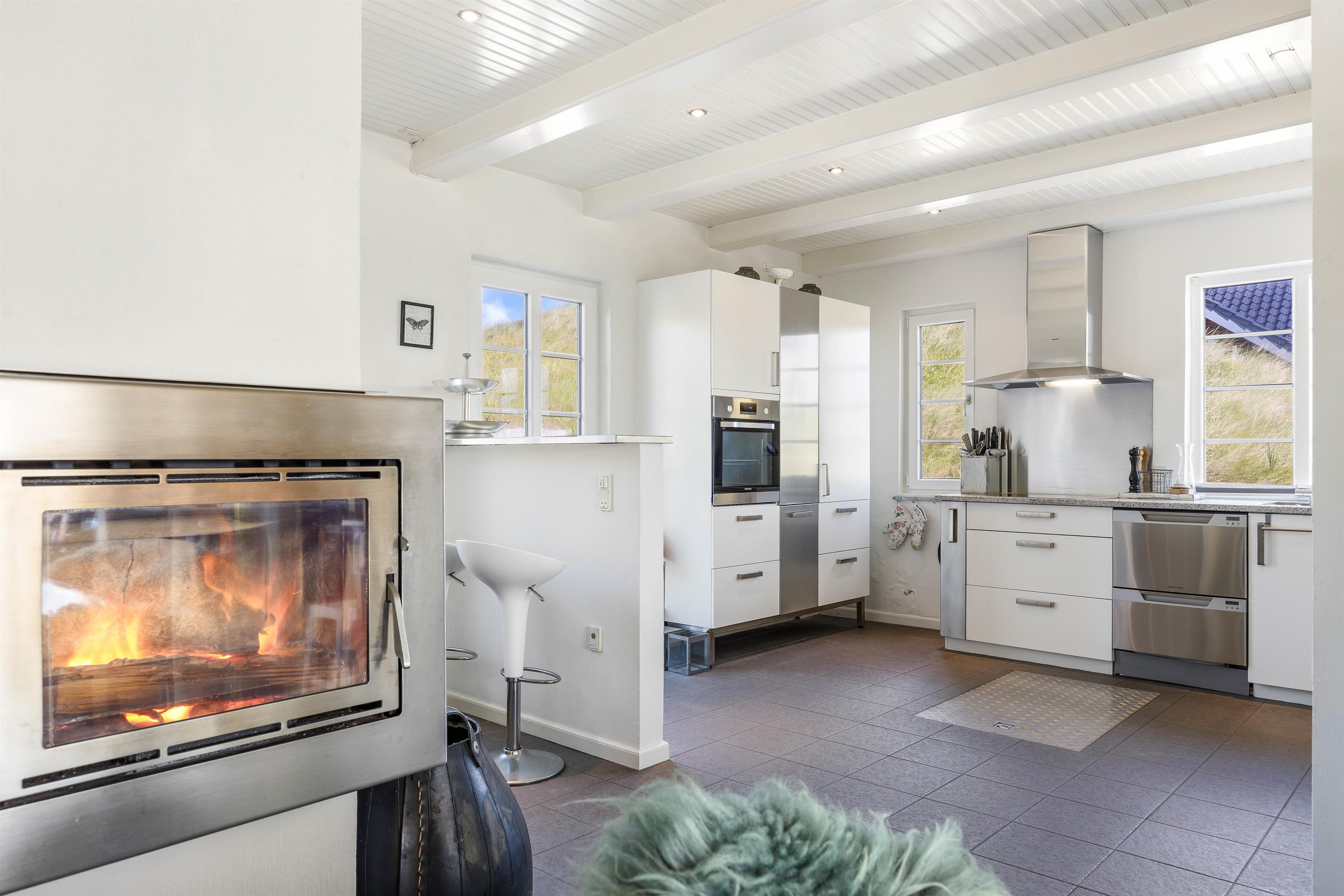 På nederste etage finder I et hyggeligt og rummeligt køkkenalrum, hvor hele familien har mulighed for at være samlet. Her kan I sammen have en samtale sammen, uanset om I står i køkkenet og tilbereder et lækkert måltid til hele familien, eller om I sidder i sofaen med en god bog og slapper af. På de lidt køligere dage, kan det klart anbefales at I tænder op for brændeovnen, som I også har til rådighed i det rummelige køkkenalrum. Hvis I ikke har gang i brændeovnen, bliver feriehuset opvarmet af elvarme og en energibesparende luft til luft varmepumpe.