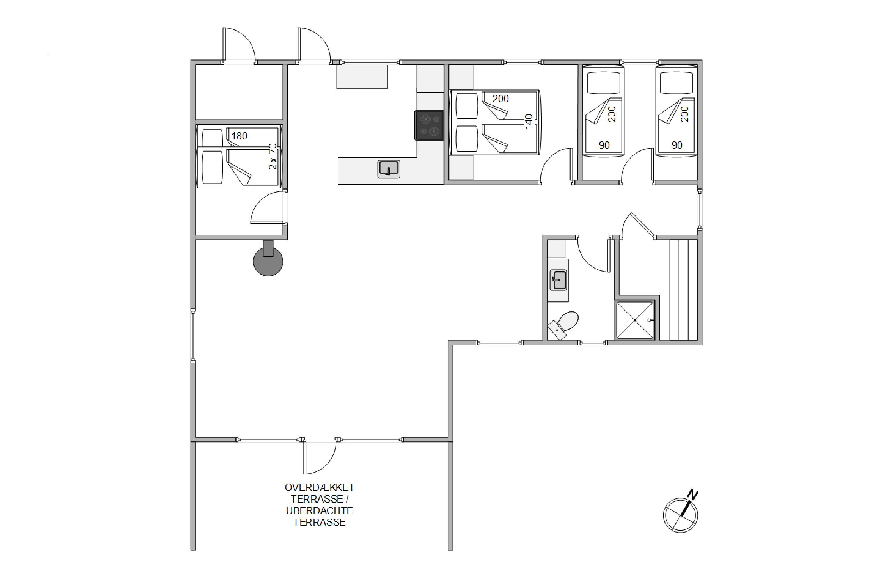 Sommerhuset er veludstyret med en række moderne faciliteter, der gør dit ophold både praktisk og behageligt. Køkkenet er flot og funktionelt, samt det ligger i åben forbindelse med stuen, så hele familien kan være samlet ved madlavningen. Hvis I elsker at lave mad, vil I helt sikkert sætte pris på det fuldt udstyrede køkken med opvaskemaskine, hvor du kan forberede lækre måltider med lokale råvarer. Direkte fra stuen er der udgang til en delvis overdækket terrasse, som vil være det naturlige samlingspunkt til grillaftenerne.