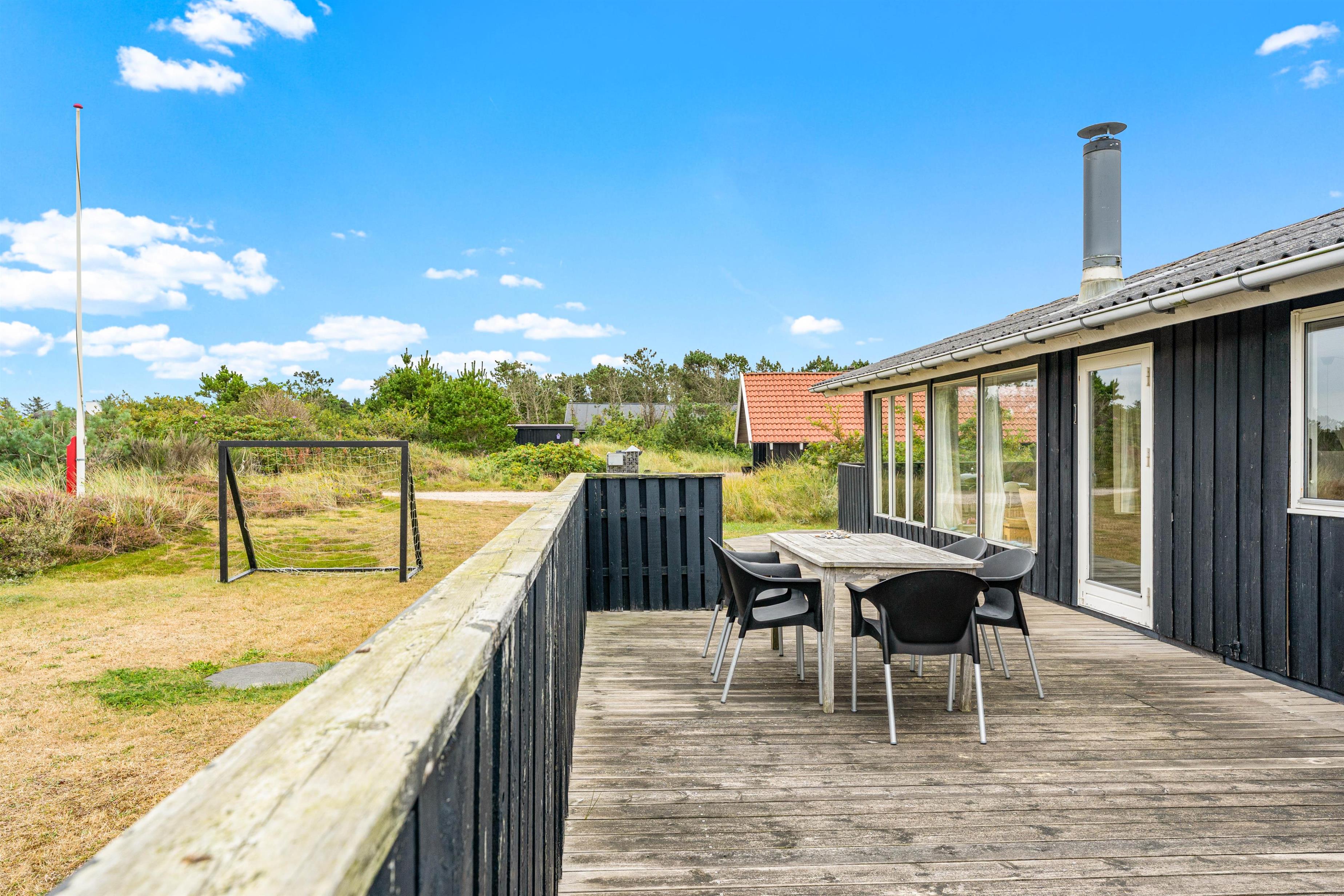 Næsten hele vejen rundt om huset går en dejlig, delvist overdækket og delvist lukket terrasse. Selv på de blæsende dage kan I finde en læfyldt plads i solen, og om sommeren kan I tage de nybagte rundstykker fra bageren i Søndervig med ud på terrassen.