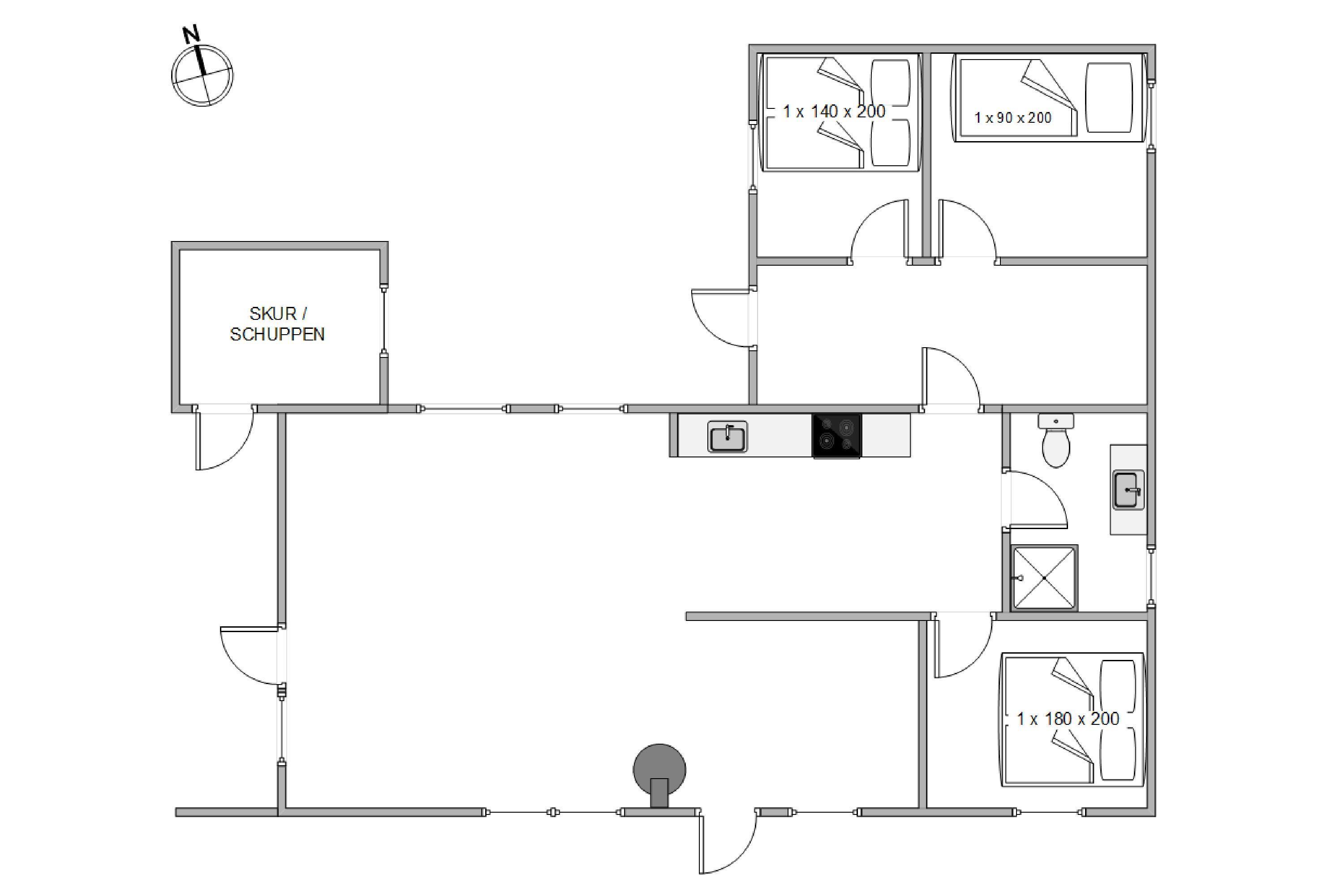 Sommerhuset kan huse op til fem feriegæster, fordelt på tre soverum, hvor to rum er med en dobbelseng (1 180x200 og 1 140x200), og det ene er med en enkeltseng.