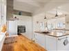 I samme plan finder I det åbne samtalekøkken i romantisk stil med koge-ø og spiseplads i den ene ende af lokalet. Under morgenmaden, middagen og lignende kan I nyde den skønne udsigt over den omkringliggende natur. Der er altså rig mulighed for, at I rigtig kan nyde hinandens selskab i disse skønne rammer. I stueetagen finder I også et lille toilet.