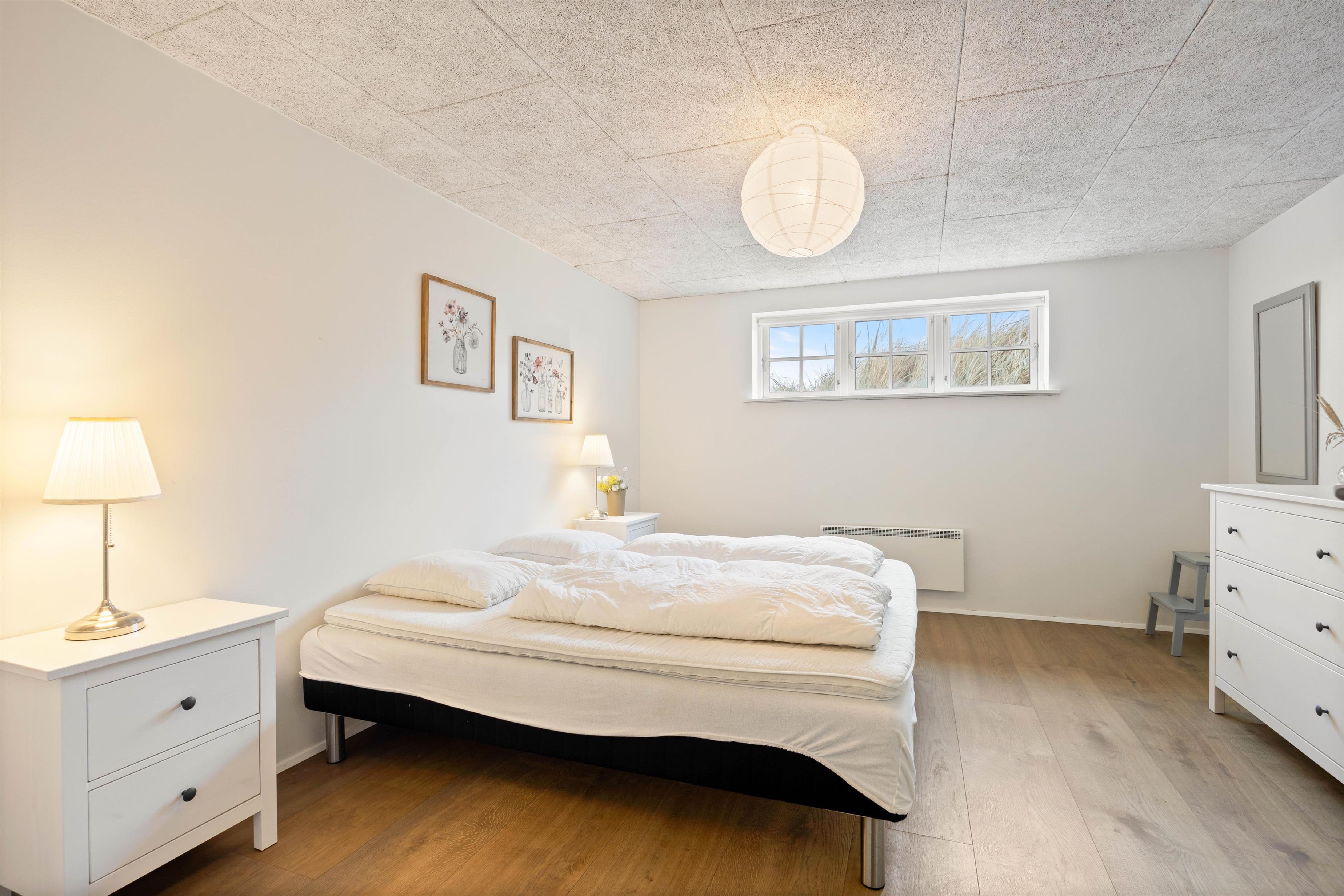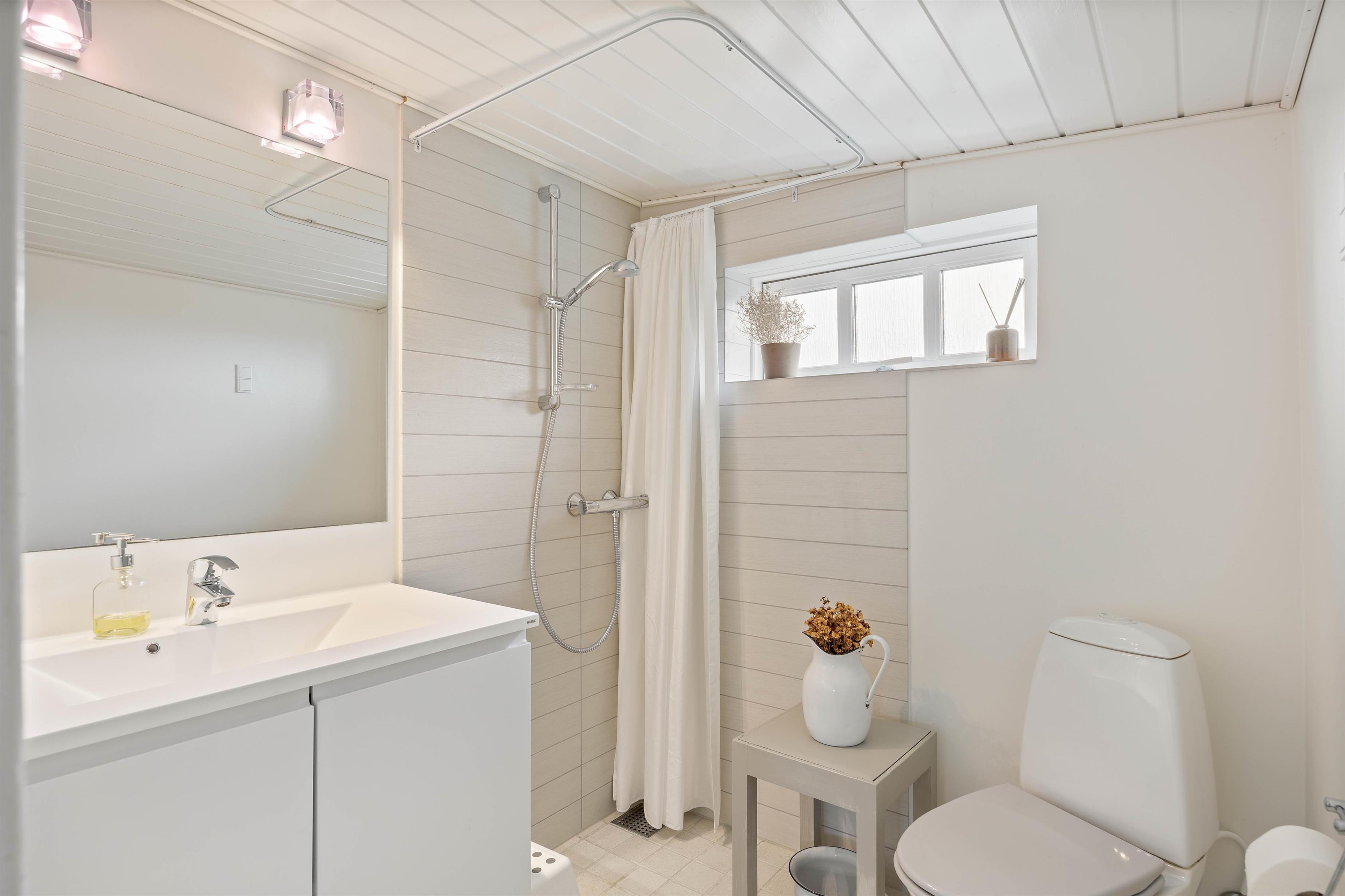 Kælderen til sommerhuset råder over et badeværelse og 2 soverum, hvor det ene råder over en køjeseng og en enkeltseng, og det andet soverum er udstyret med en dobbeltseng. Alle værelser i kælderen er udstyret med el-radiatorer. Desuden behøver I ikke bekymre jer om de praktiske gøremål, da sommerhuset har en kombimaskine med vaskemaskine og tørretumbler til rådighed, der klarer dette for jer.