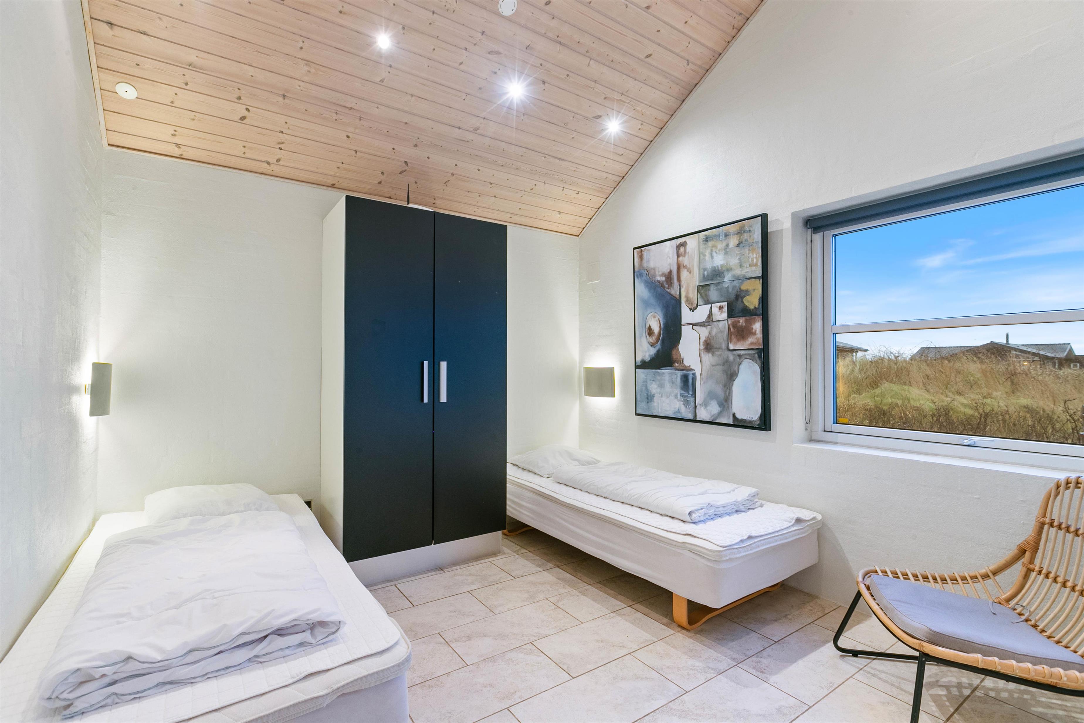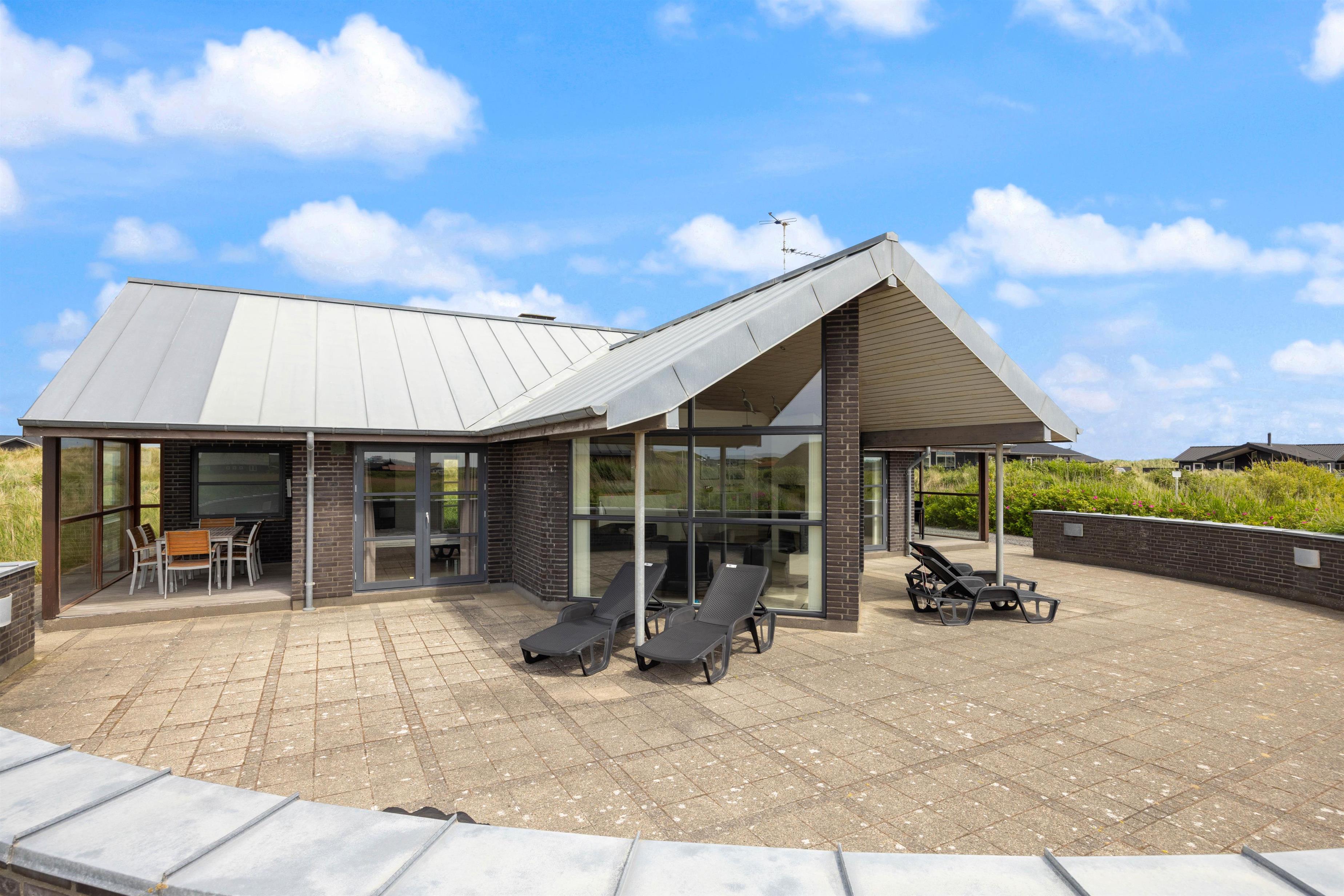 Her er tale om et virkeligt flot feriehus opført i de bedste materiale. Der er kræset for detaljerne og masser af flot lysindfald fra de store vinduespartier. Inventaret i køkkenet og de 2 badeværelser oser af kvalitet. Der er 3 skønne soveværelser, 2 med dobbeltsenge og 1 med 2 enkeltsenge. Fra to af værelserne er der direkte udgang til terrassen. I køkken/alrummet er der stige op til en stor hems. Et virkeligt skønt sted for børn.