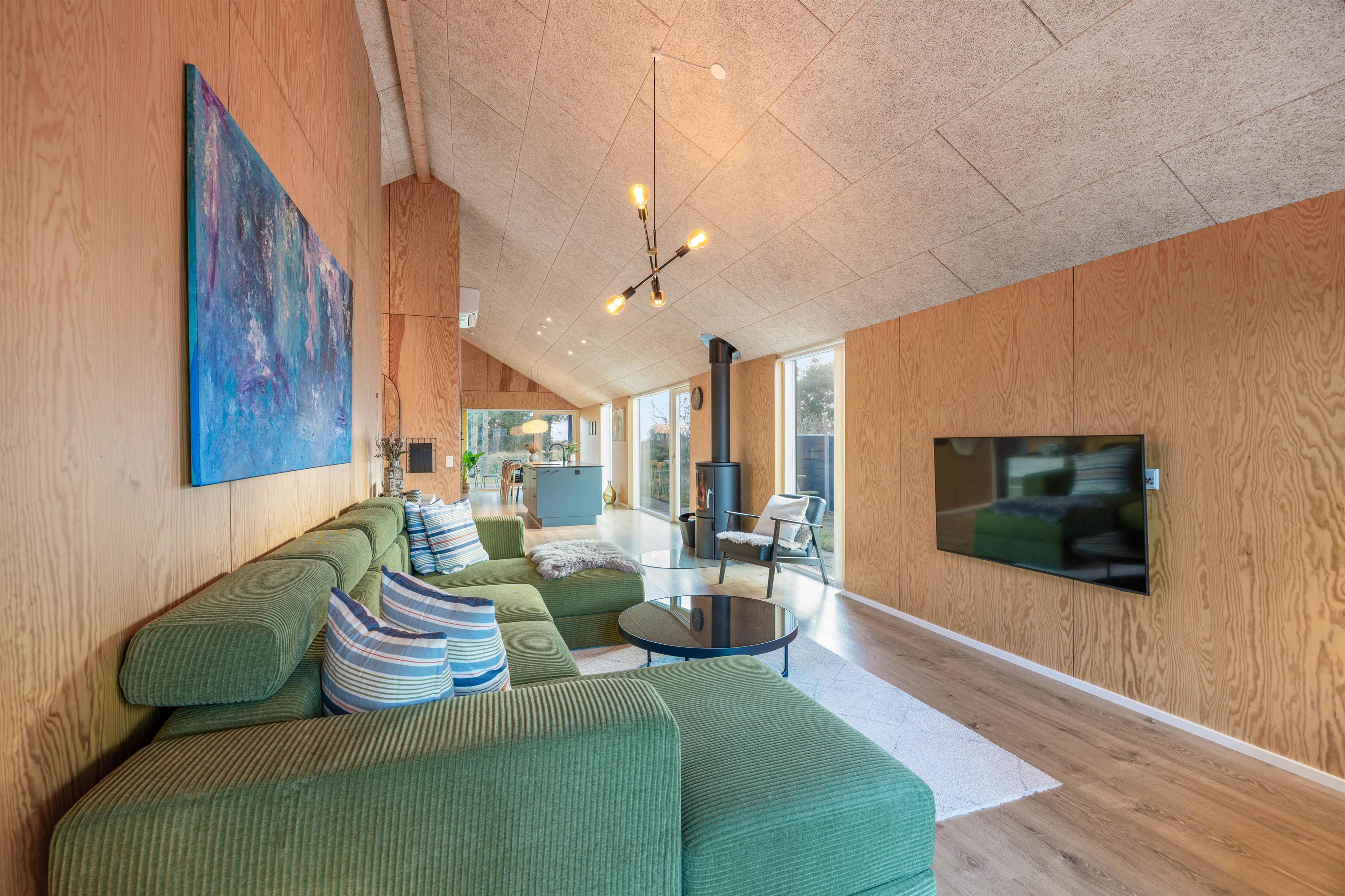 Hjertet i det 120 kvadratmeter store sommerhus er det store, lyse alrum, der danner rammen om mange hyggelige stunder i løbet af ferien. Mens I laver mad, spiller spil eller ser film i alrummet, fuldender brændeovnen den hyggelige stemning med sin knitren i baggrunden.