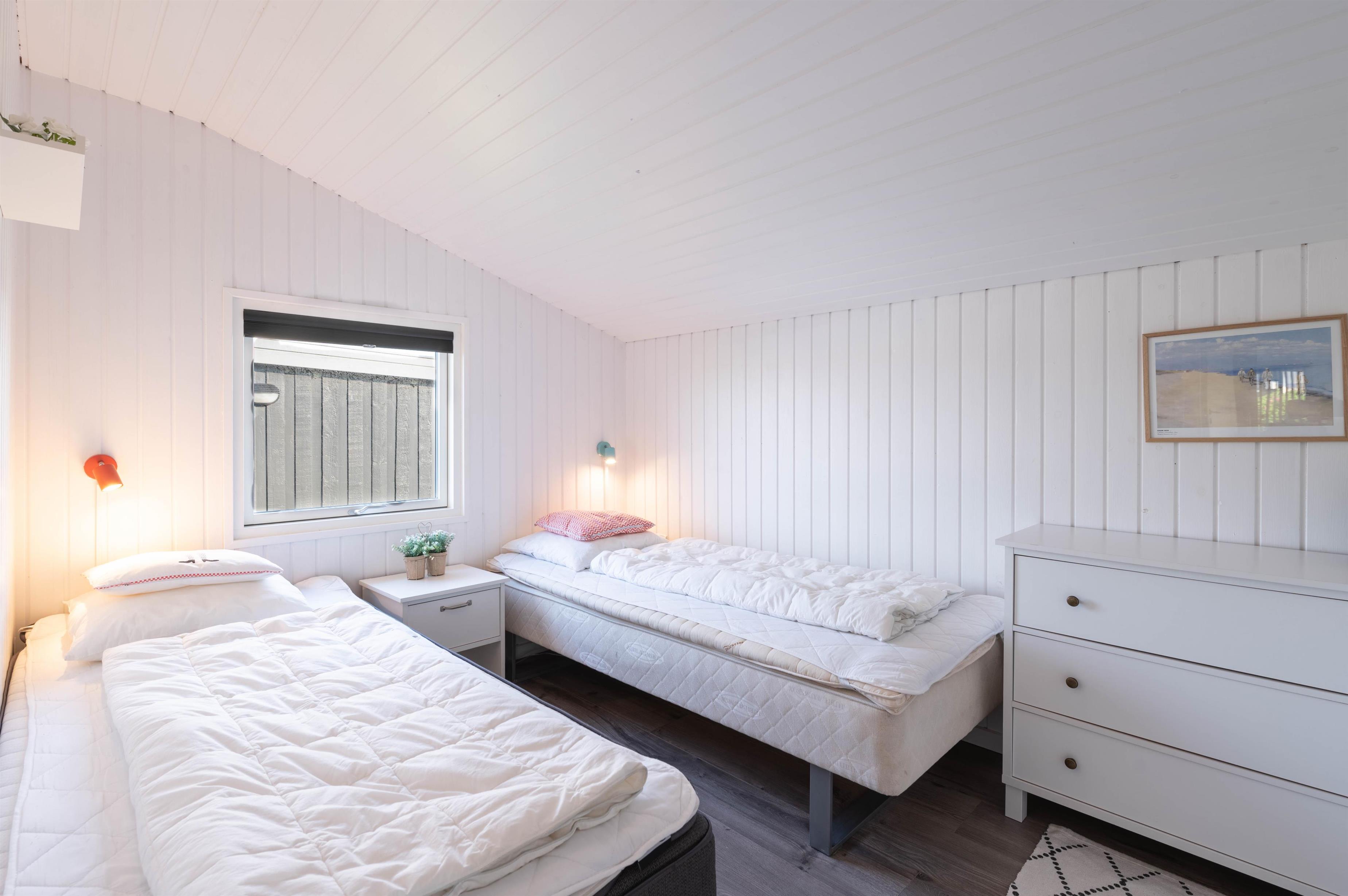 Feriehuset råder over to gode værelser, der er indrettet med henholdsvis dobbeltseng og to enkeltsenge. Derudover er der et pænt og lyst badeværelse med bruseniche, flisegulv og gulvvarme.