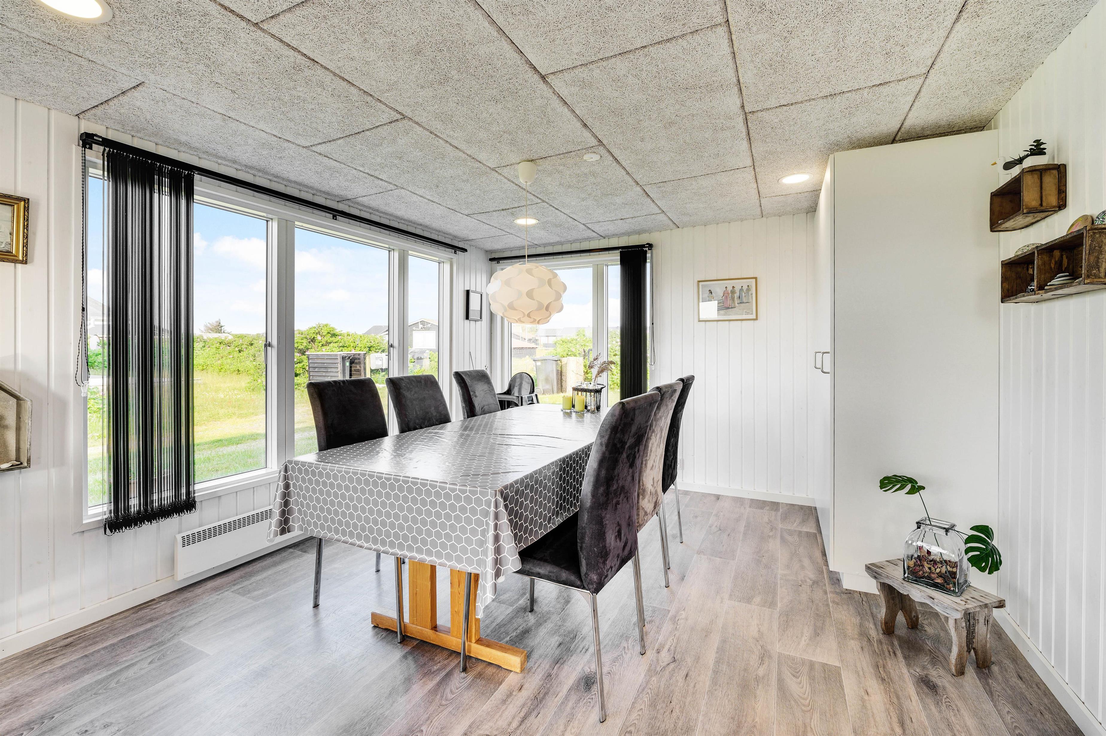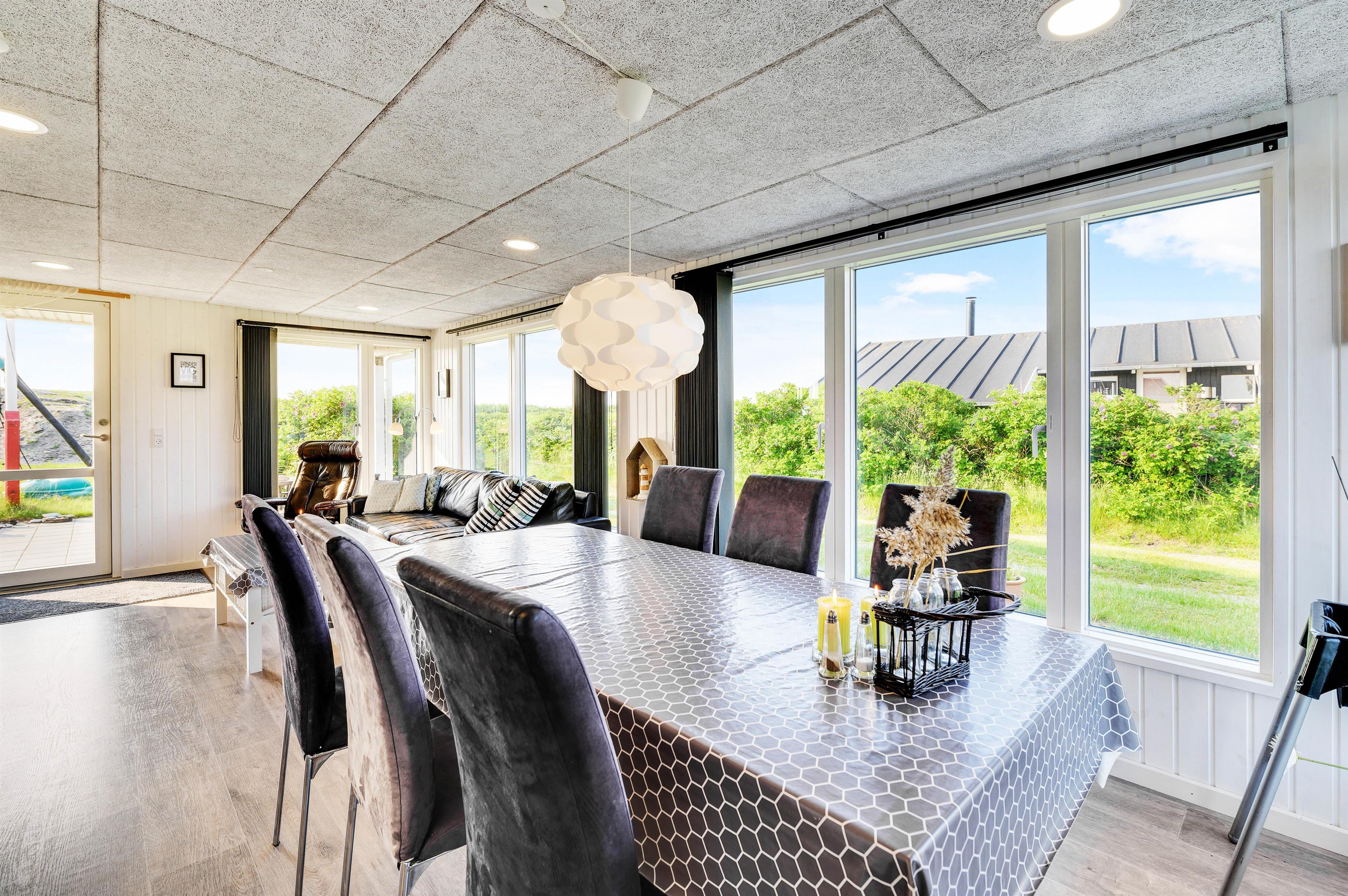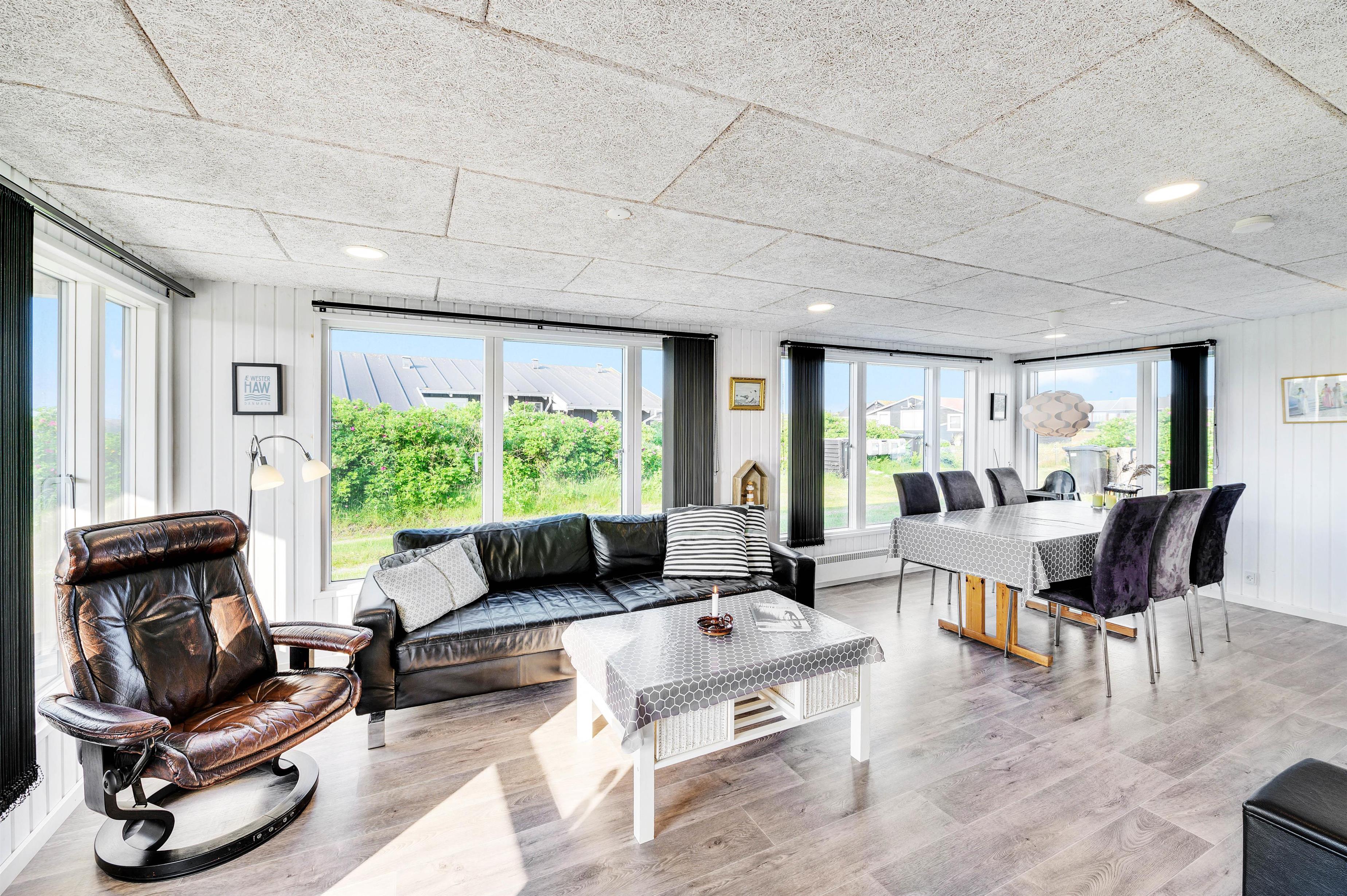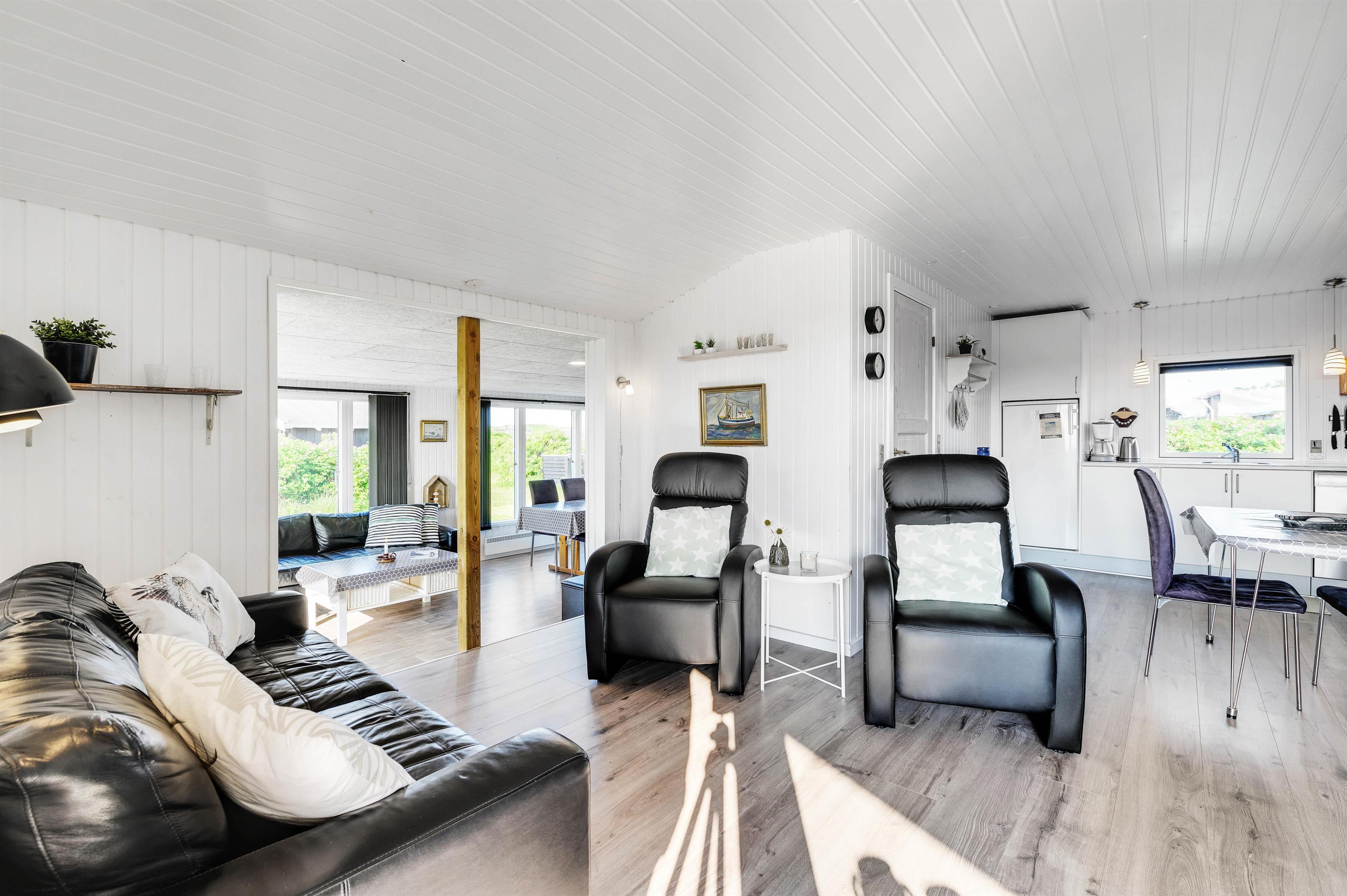 Sommerhusets hjerte er det store opholdsrum, der ligger i åben forbindelse med en nedsænket stue. Her kan feriedagene nydes i sofaen eller til en god middag omkring spisebordet. Køkkenet er pænt og godt udstyret med blandt andet køleskab med 25 liters frysekapacitet, mikroovn og opvaskemaskine, ligesom der er god plads til alle jeres kulinariske udfoldelser.