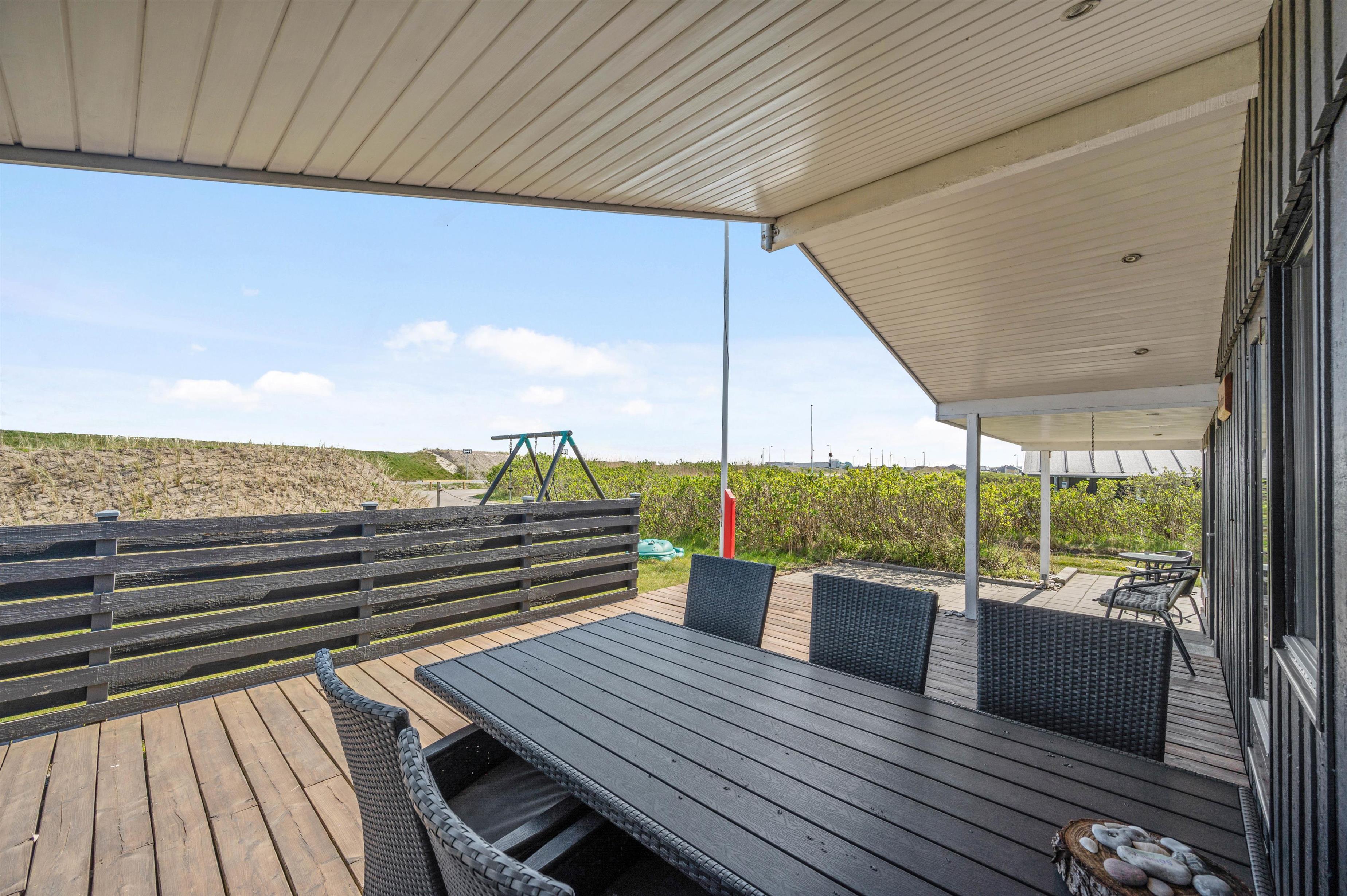 Sommerhuset ligger for enden af en blind vej på en stor, velholdt plænegrund. Mod øst er der en skøn overdækket terrasse med udsigt ud over den store plænegrund, hvor der er plads til børnenes leg i både sandkasse eller på gyngerne. På terrassen er der flere hyggelige kroge, I kan slå jer ned i. Og der er naturligvis både havemøbler, liggestole og grill til rådighed.