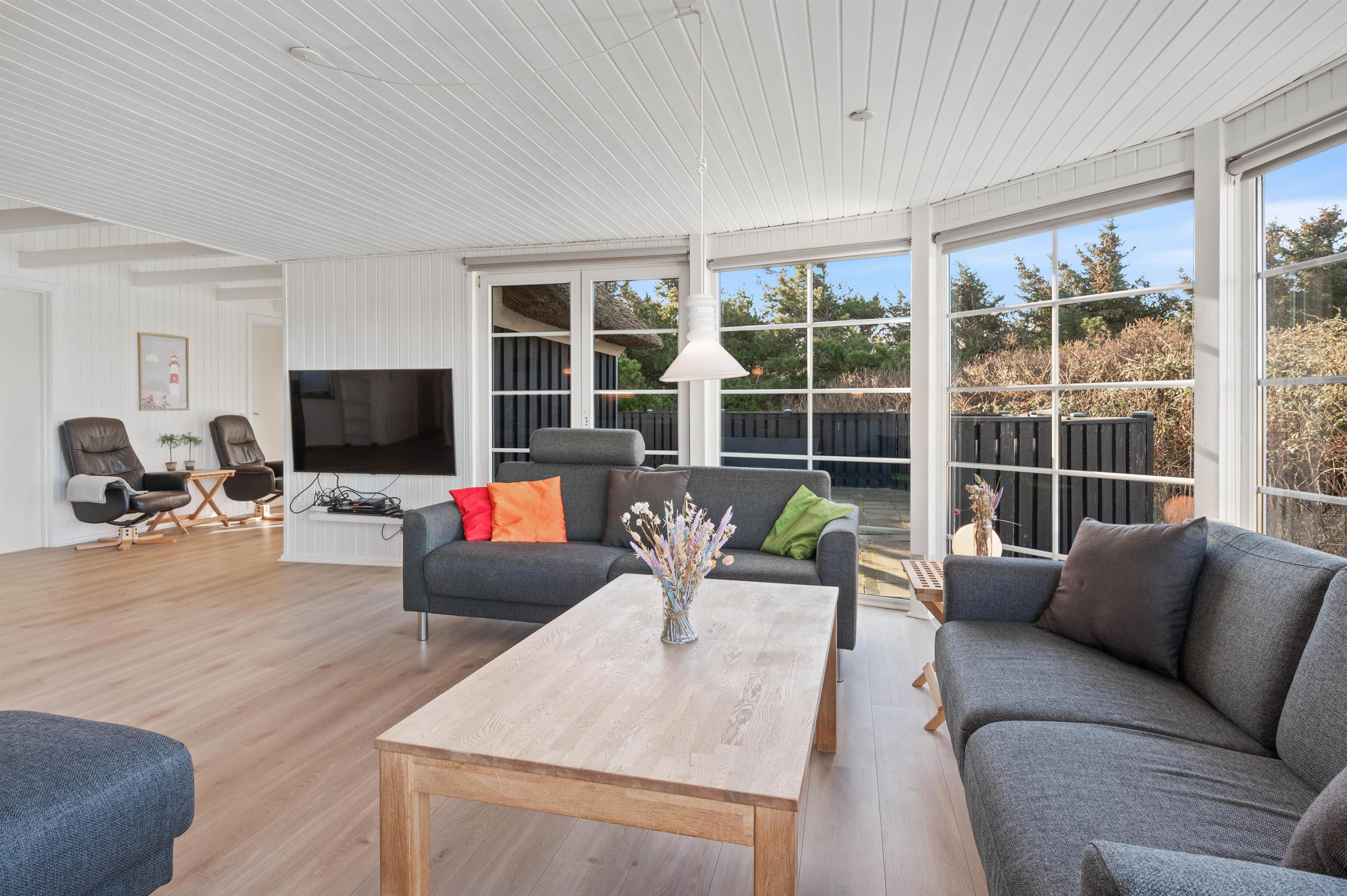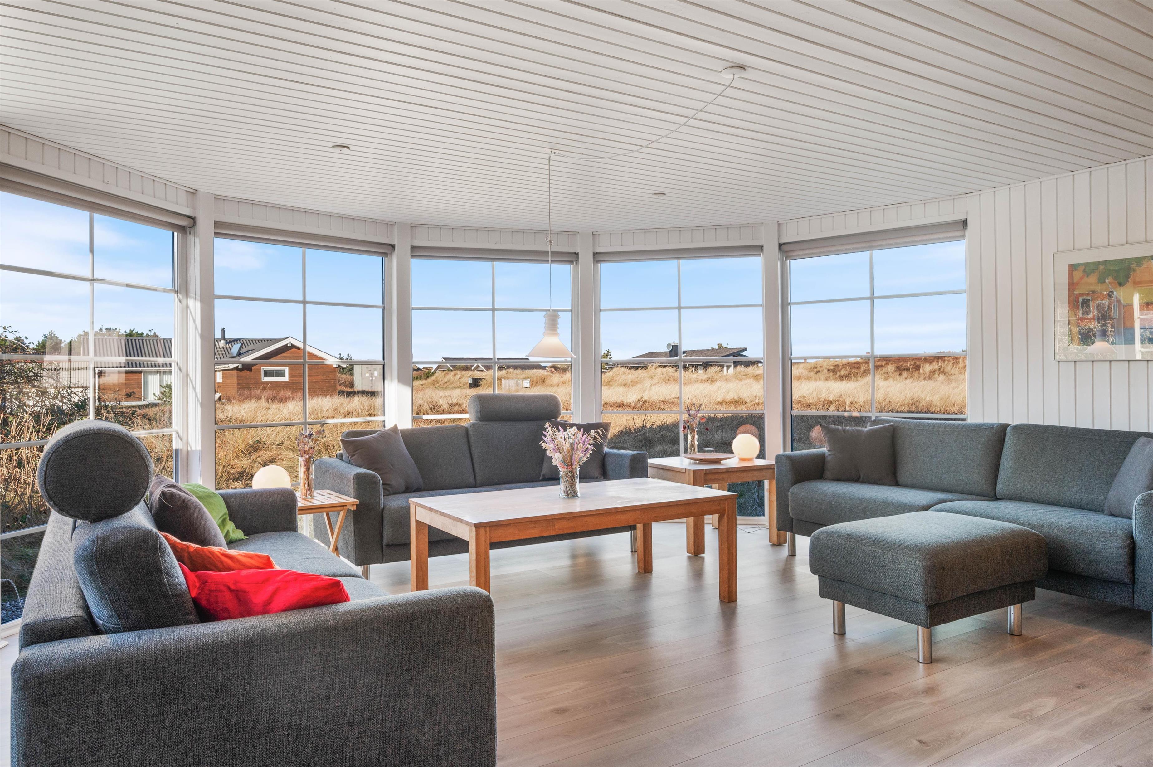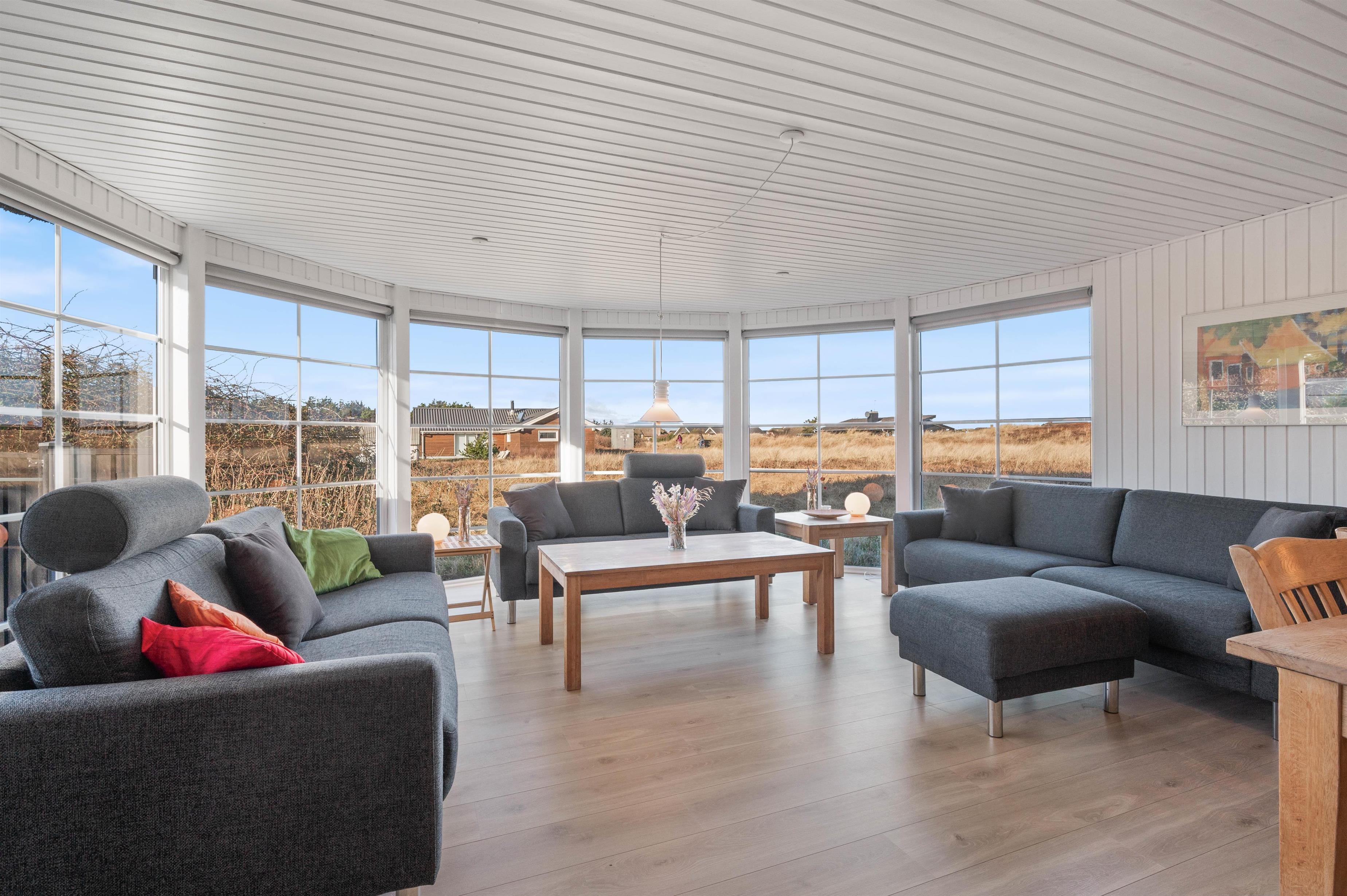Når I træder indenfor i sommerhuset på Jakob Bondes Vej 47, vil I blive mødt af et smukt lysindfald fra de store vinduespartier i karnappen. Det er svært ikke at føle sig bjergtaget af udsigten. Derfor vil I formentlig også få en akut trang til at slå jer ned i de behagelige flydersofaer og blot betragte de smukke udendørs omgivelser.