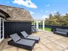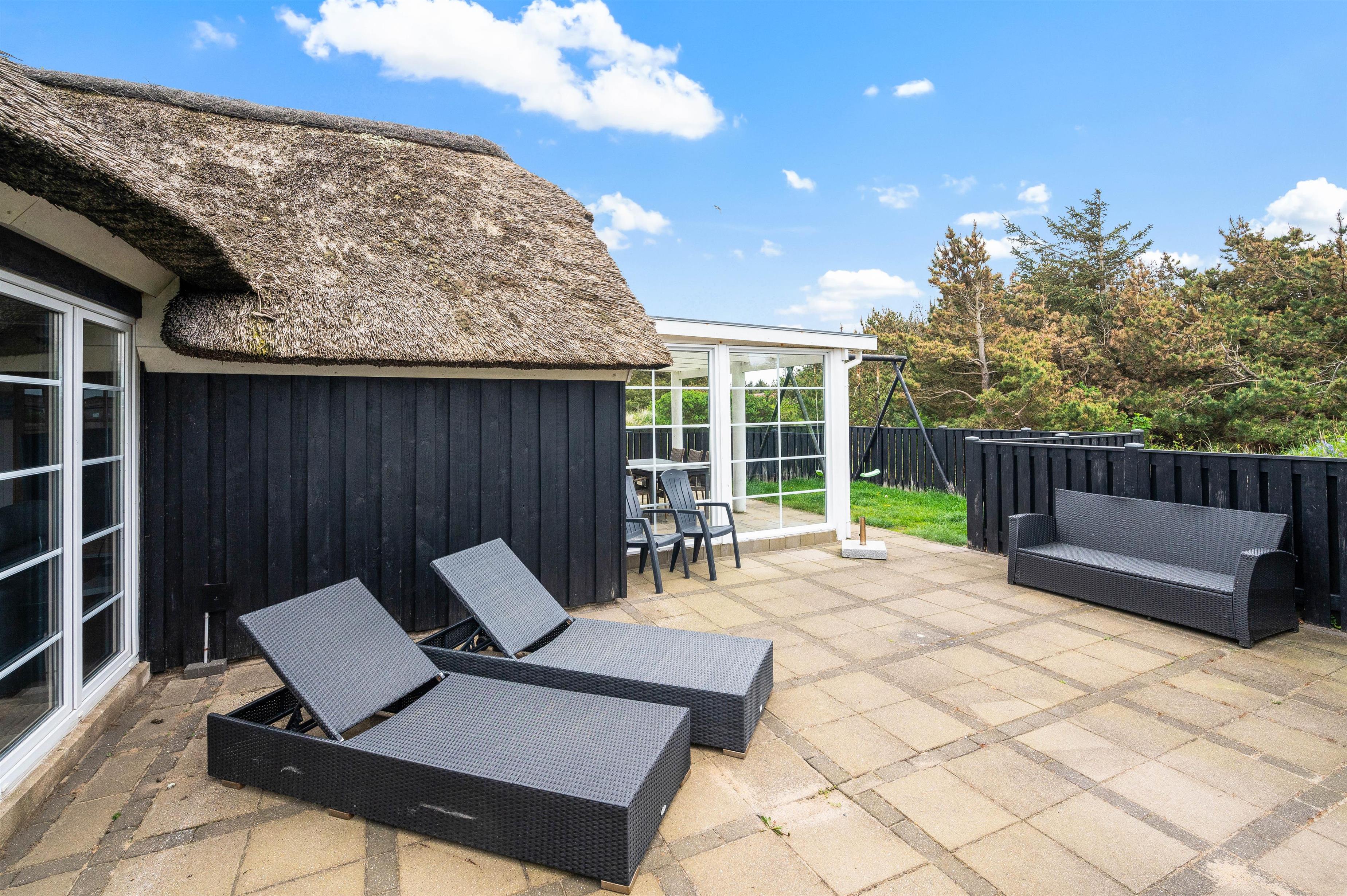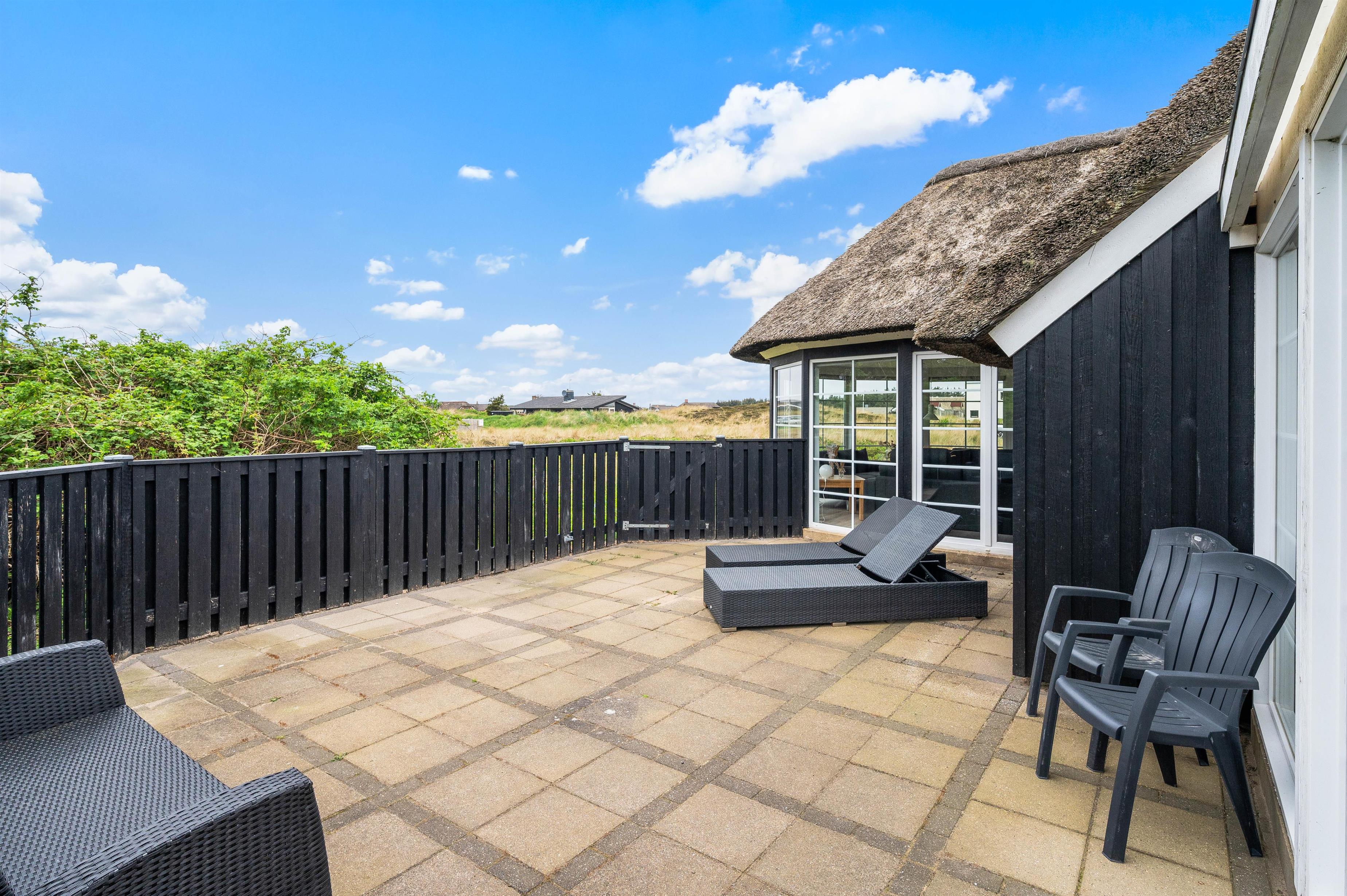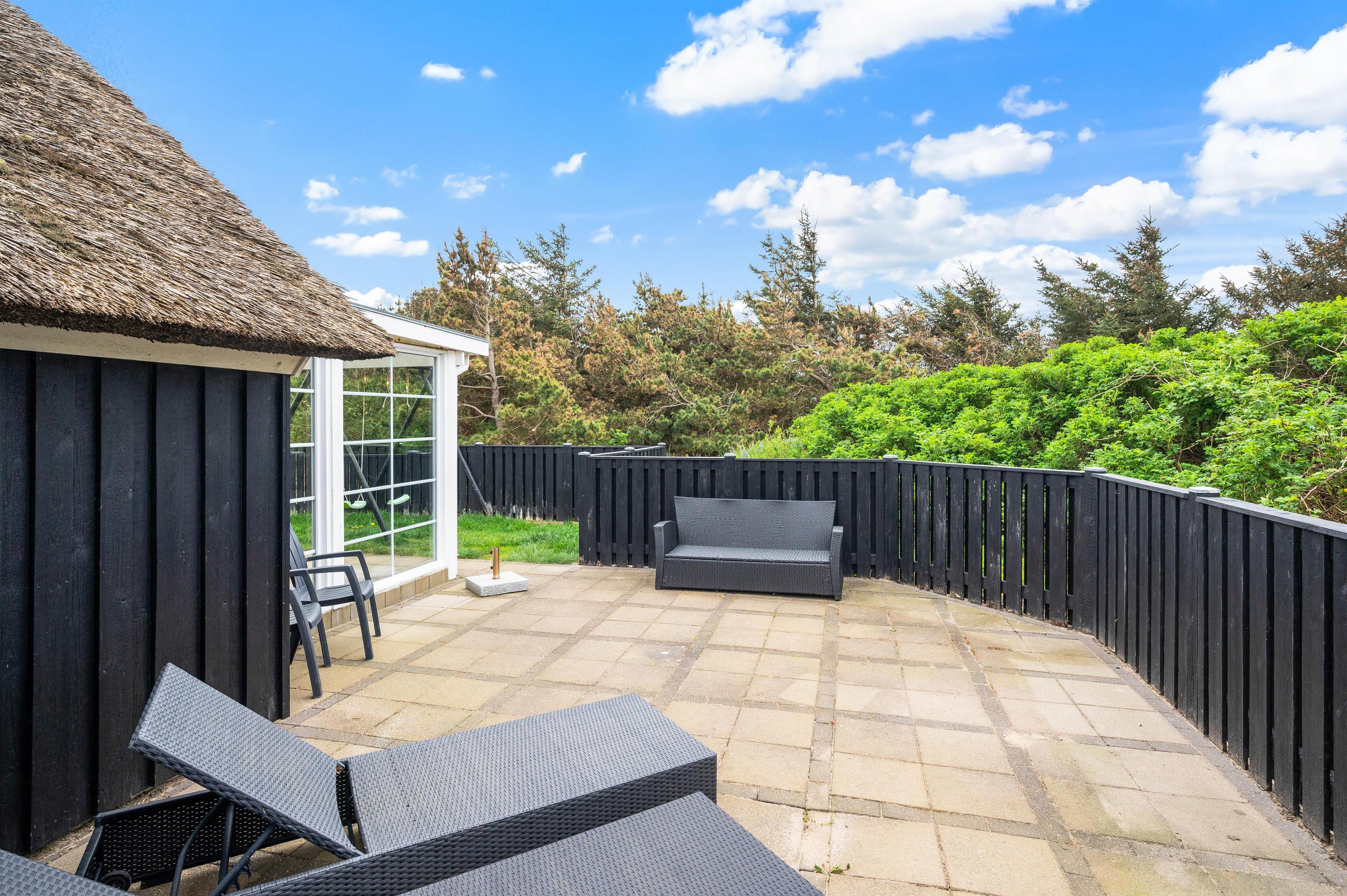 Terrassen løber fra syd – hvor den er delvist overdækket – og hele vejen mod vest. Alt efter hvor vinden kommer fra, er der altid en god mulighed for at finde en hyggelig krog i læ for vind og vejr.