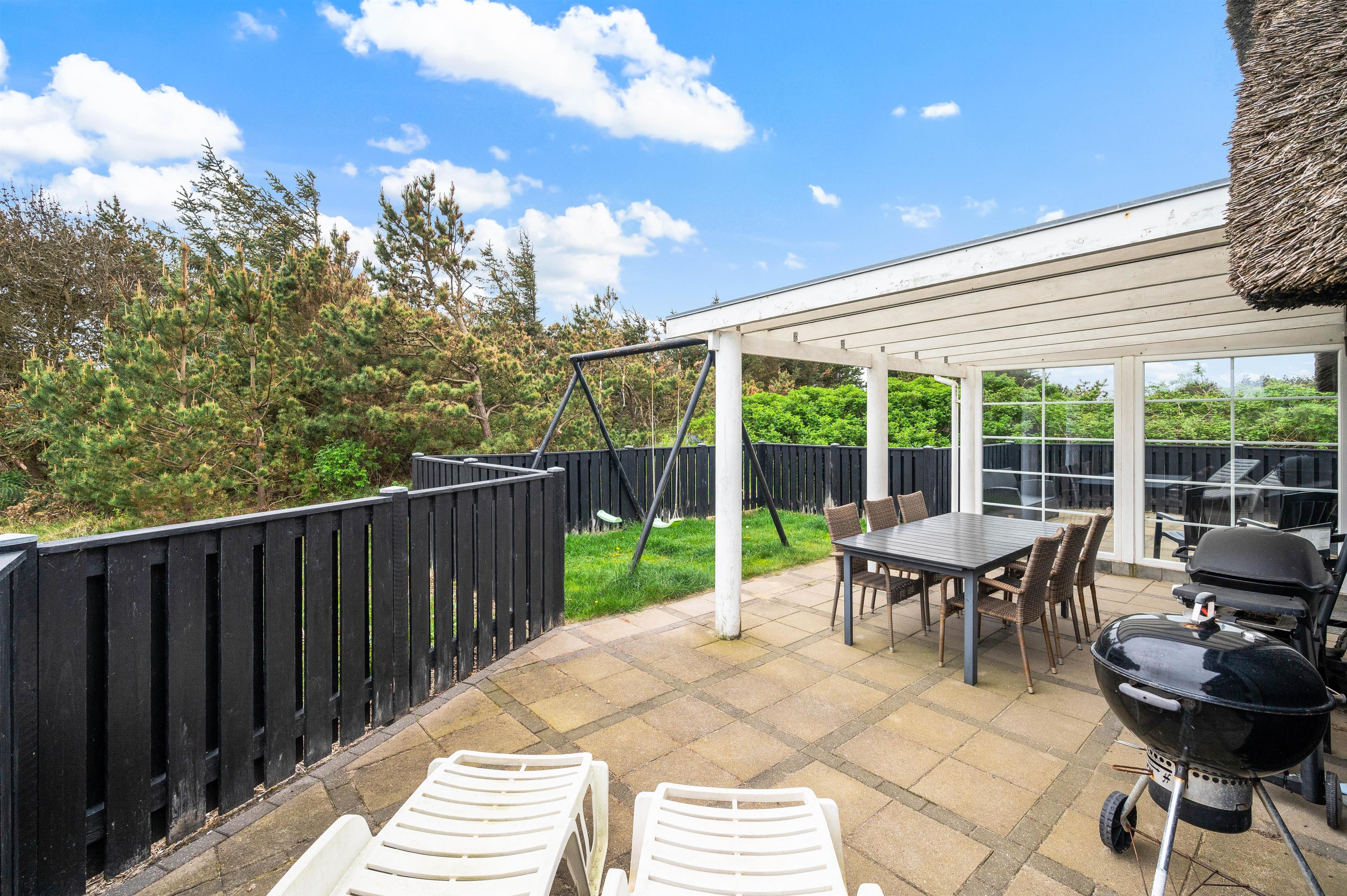 På den store terrasse kan I virkelig gå sommeren i møde på allerbedste manér. Den er nemlig udstyret med gode havemøbler, liggestole og kuglegrill. Terrassen er fuldkommen lukket, så I kan med ro i sjælen lade både hunde og børn lege frit på området. Faktisk er gyngestativet rykket ind i det indhegnede område, så børnene kan lege fuldkommen ugeneret.