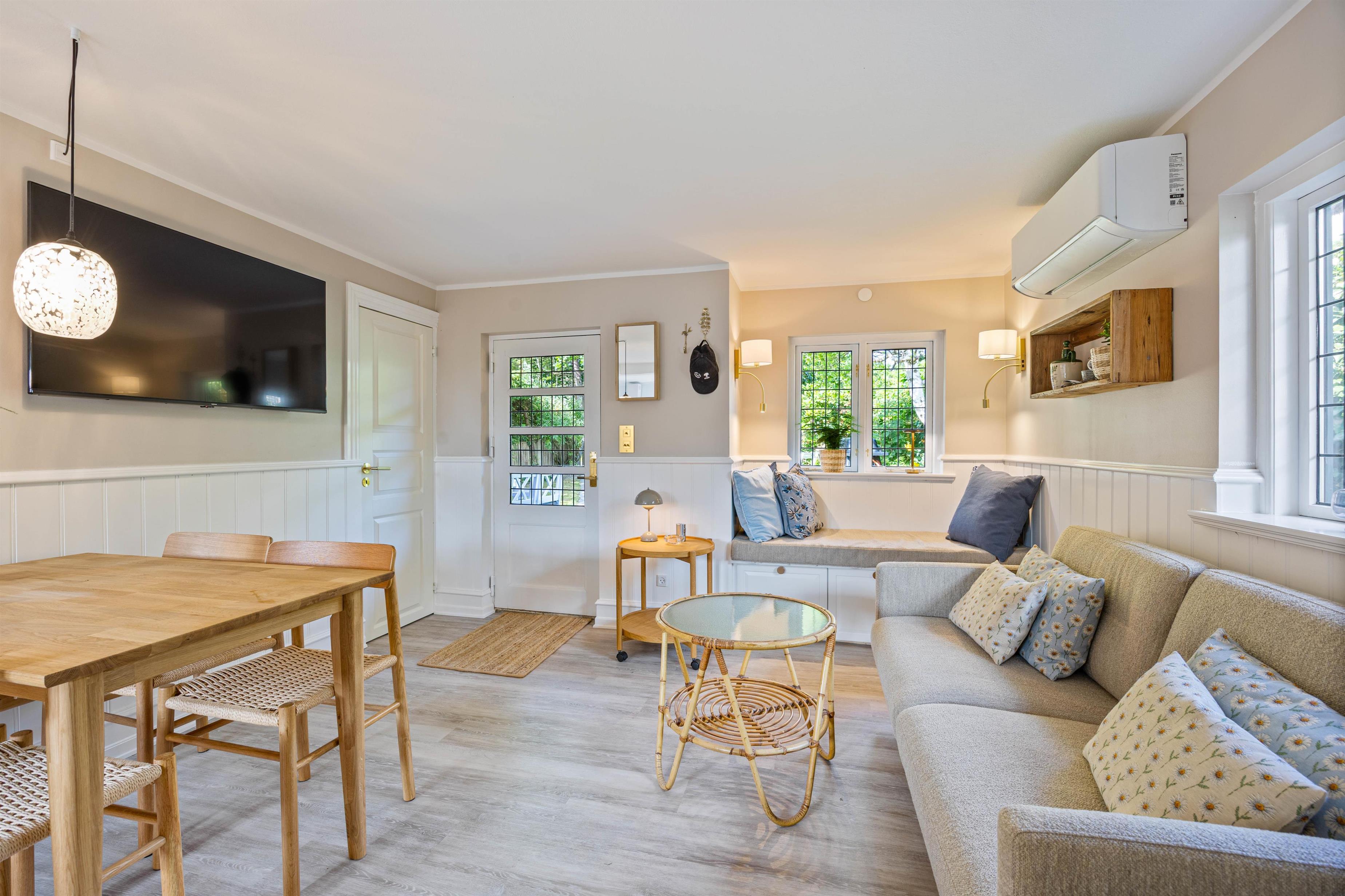 Her kan I opleve dansk hygge. Der er blevet skabt det skønneste indemiljø, og hele indretningen er gennemført og så nydelig. Feriehuset byder jer velkommen med et åbent opholdsrum, hvor I kan tilbringe meget tid sammen. Huset er stilfuldt opført med flotte vægpaneler og tapet, hvilket er med til at skabe en dejlig badehotels-atmosfære. Køkkenet er udstyret med et gaskomfur, hvilket helt sikkert vil begejstre amatørkokke. Opvaskemaskinen tager sig af den kedelige opvask, så I kan sidde og hygge jer sammen og lægge planer for de kommende dage. På køligere dage sørger den energibesparende luft-til-luft-varmepumpe for et behageligt og konstant indeklima i opholdsstuen.