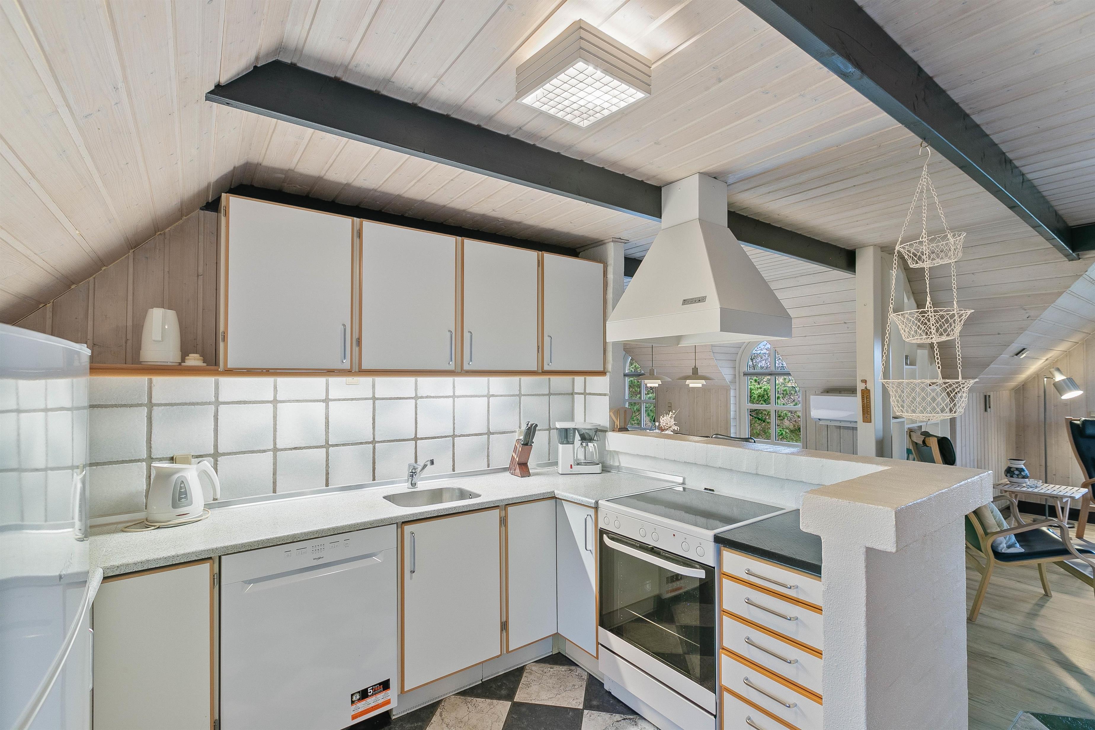 Den klassiske feriehusstemning fortsætter, når I træder ind i sommerhuset, men dog med et moderne twist, som sørger for en god og komfortabel standard i feriehuset. De sorte loftsbjælker skaber en god kontrast og dybde i indretningen, som inviterer til hyggestunder sammen med familien. Uanset om I opholder jer i den hyggelige tv-stue, som ligger i åben forbindelse med køkkenet, eller i spiseområdet, så er der plads til, at hele familien kan være samlet. Sommerhuset har 3 gode soverum med plads til 6 personer. Sommerhuset er selvføgelig komfortabelt indrettet med opvaskemaskine, tørretumber og vaskemaskine.