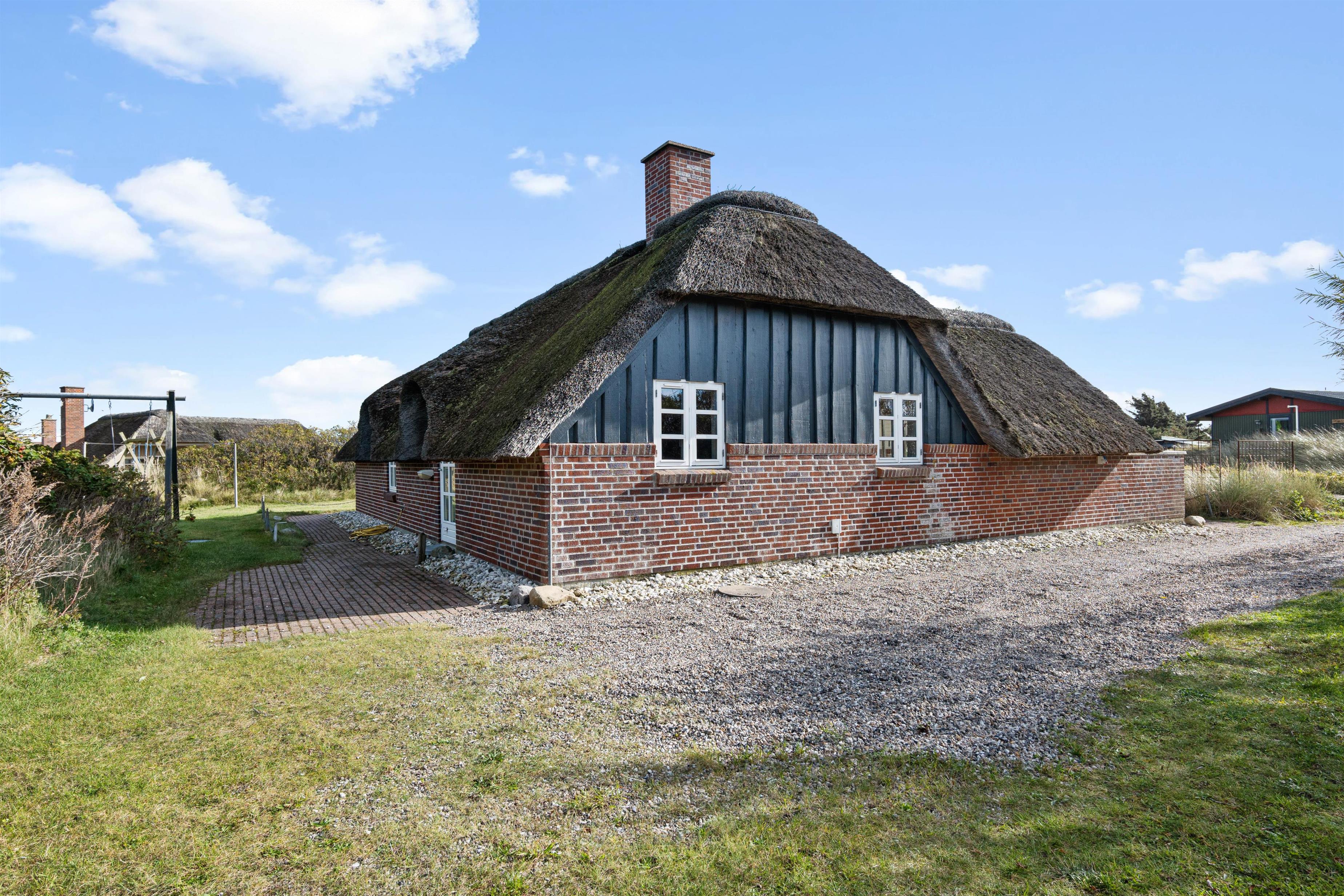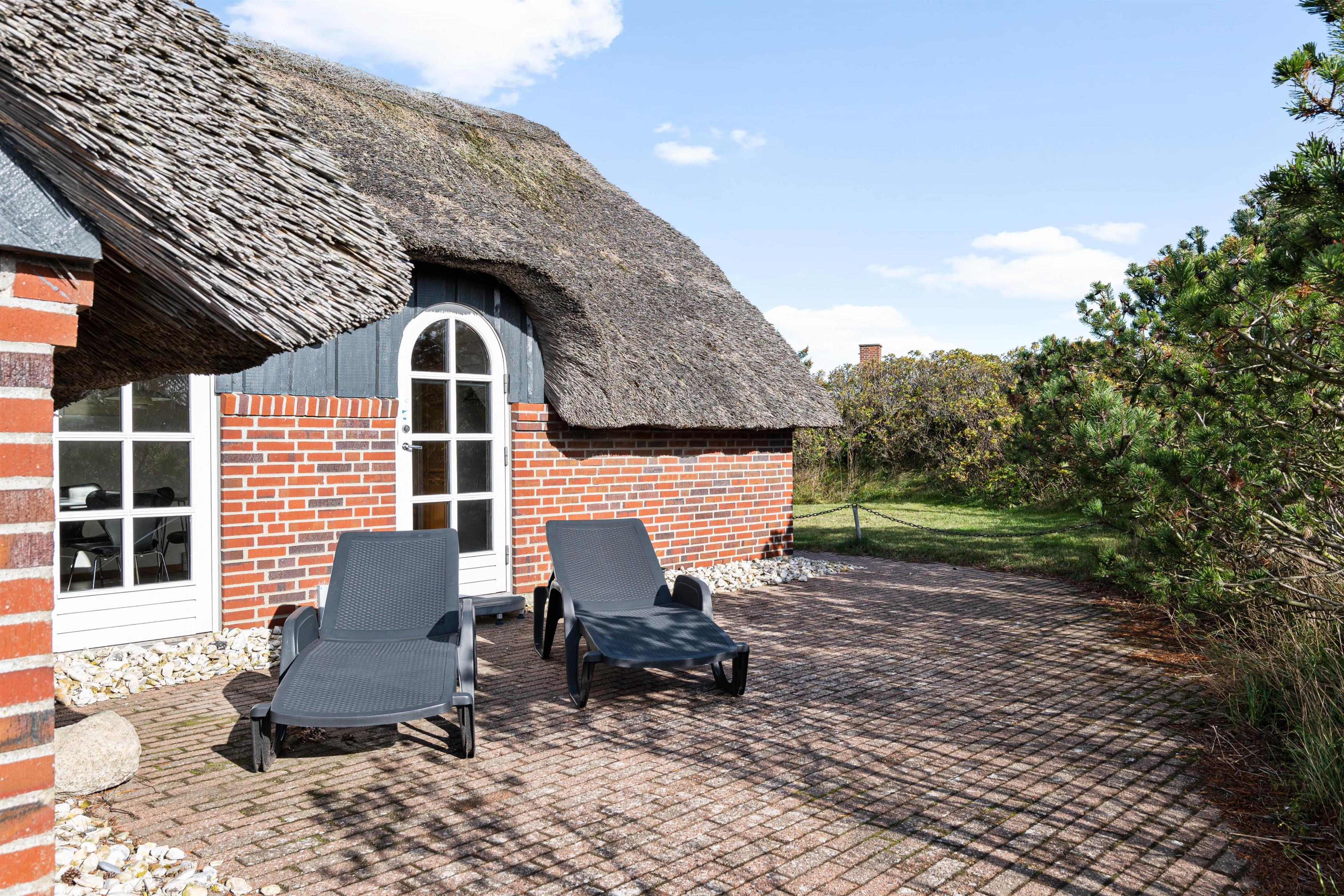 Feriehuset på Nordsøvej 81 emmer af dansk sommerhusstemning både ude og inde. Det flotte stråtag får feriehuset til at smelte sammen med omgivelserne. Fra stuen har I direkte adgang til den primære terrasse, som er afskærmet i begge sider og delvist overdækket. Det betyder, at I kan sidde på terrassen helt ugeneret. Den delvist overdækkede terrasse sørger samtidig for, at I kan siddde ude lidt længere – selv når aftensolen er gået ned, og duggen er faldet. Terrassen er derfor oplagt til hyggelige grillaftener på dejlige, lune sommeraftener. Dine hunde vil nyde de lange gåture i den friske natur, at slappe af i skyggen på terrassen og selvfølgelig at være sammen med jer.