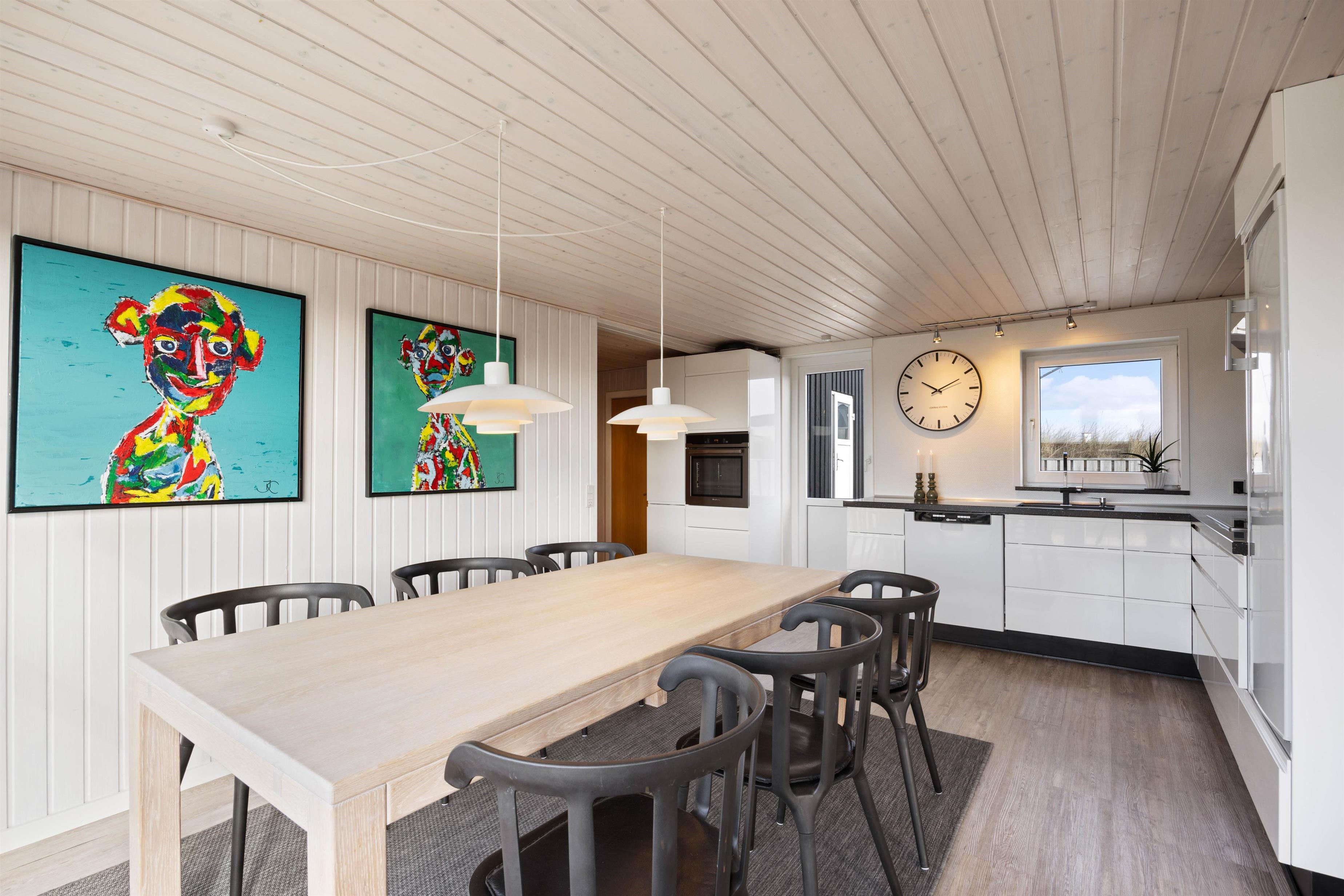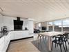 Sommerhuset er hyggeligt indrettet med et varmt og indbydende interiør, der får dig til at føle dig hjemme fra det øjeblik du træder ind ad døren. Det er også praktisk, da det er udstyret med alt hvad du har brug for til en komfortabel og bekvem ferie, herunder et veludstyret køkken, rummelige værelser og moderne badeværelser. Spisebordet er direkte placeret ved køkkenet, som gør det nemt at være sammen og hygge under madlavningen.