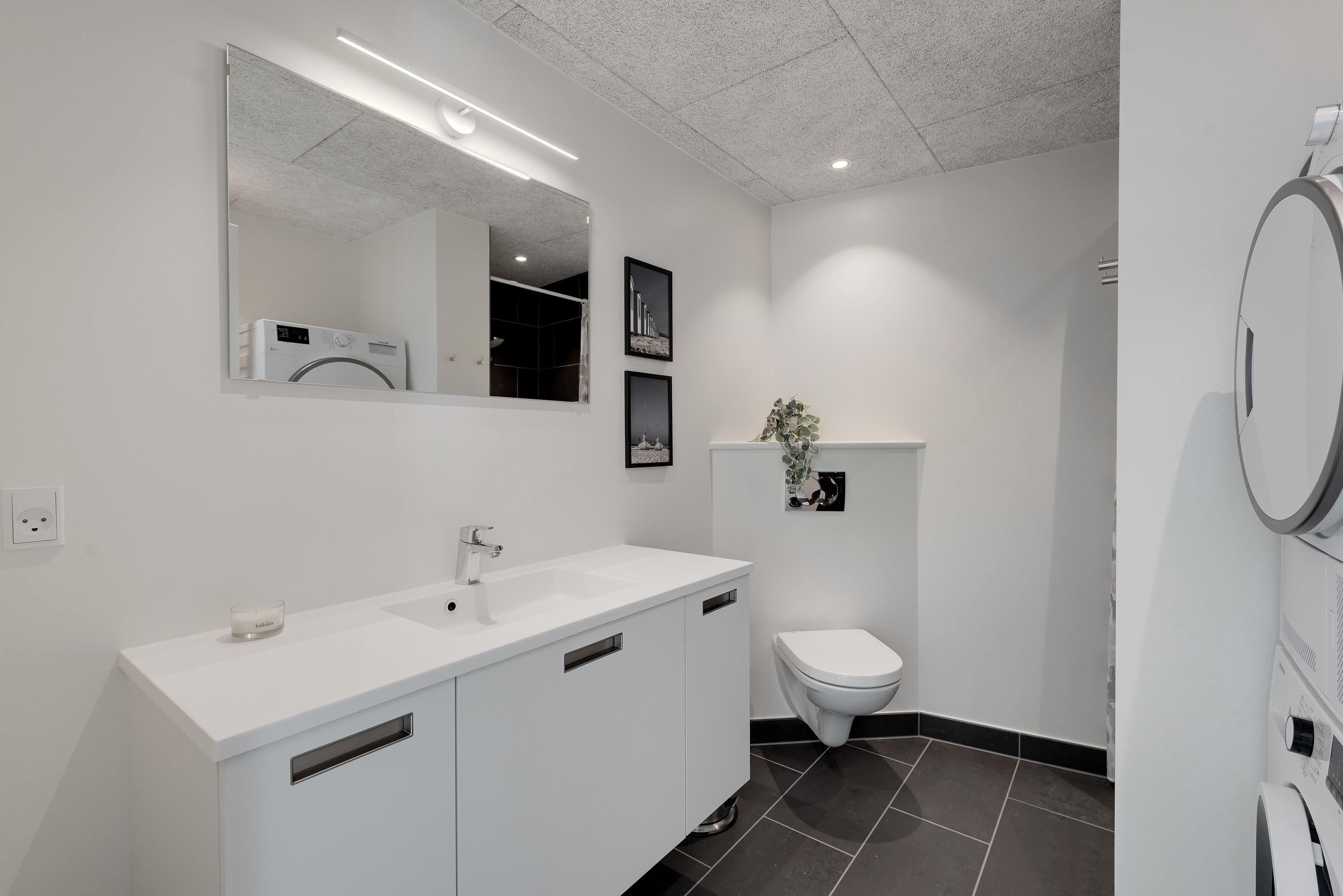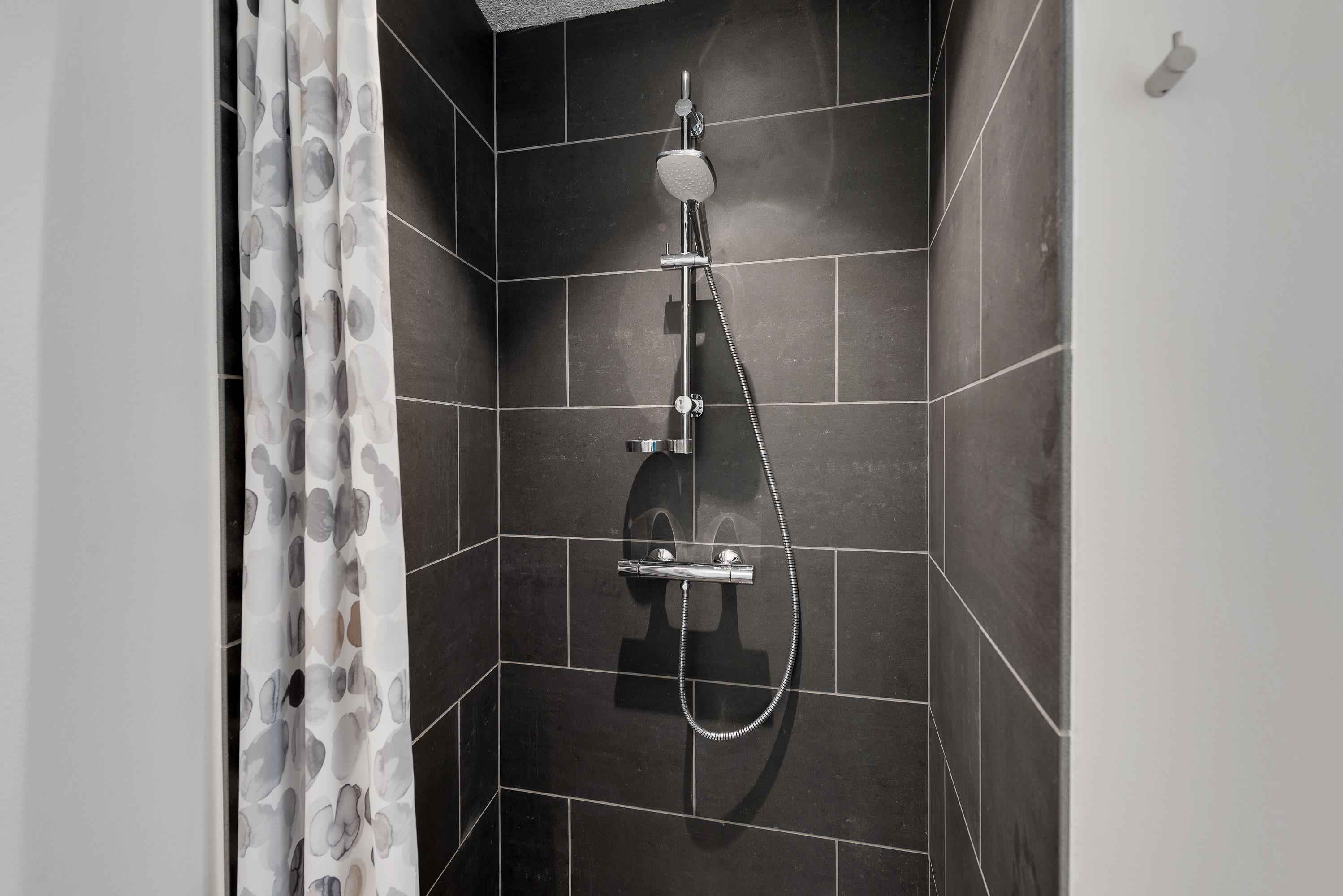 Der er to smagfulde soveværelser med gulvvarme. I det ene soveværelse finder I en dobbeltseng og i det andet værelse befinder der sig to enkeltsenge. Det funktionsdygtige badeværelse med gulvvarme rummer også en vaskemaskine og tørretumbler, som I frit kan benytte jer af.
