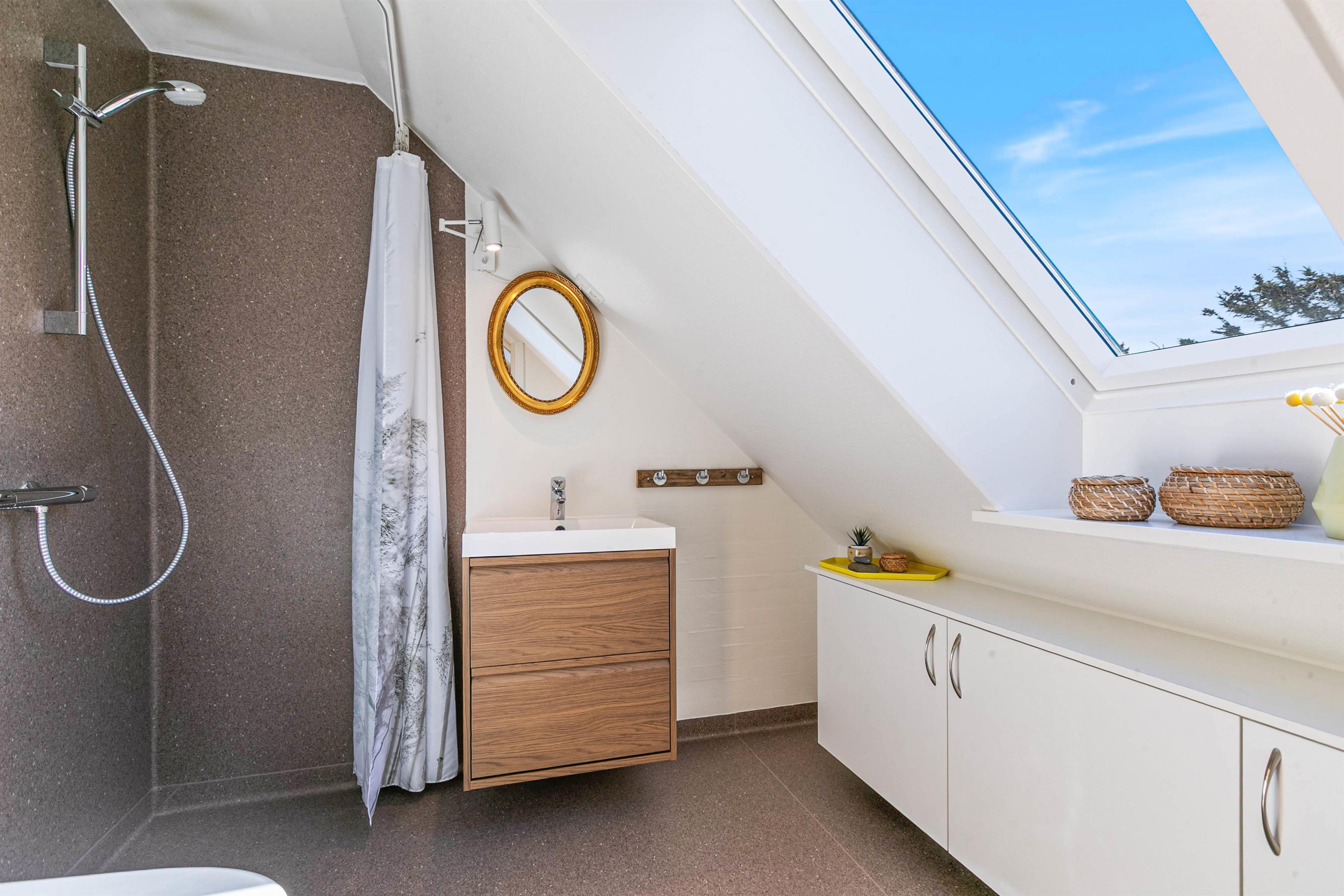 På ferielejlighedens første sal finder I de sidste to soveværelser og endnu et badeværelse. Så skal I ikke tænke på at gå ned ad trappen om natten.