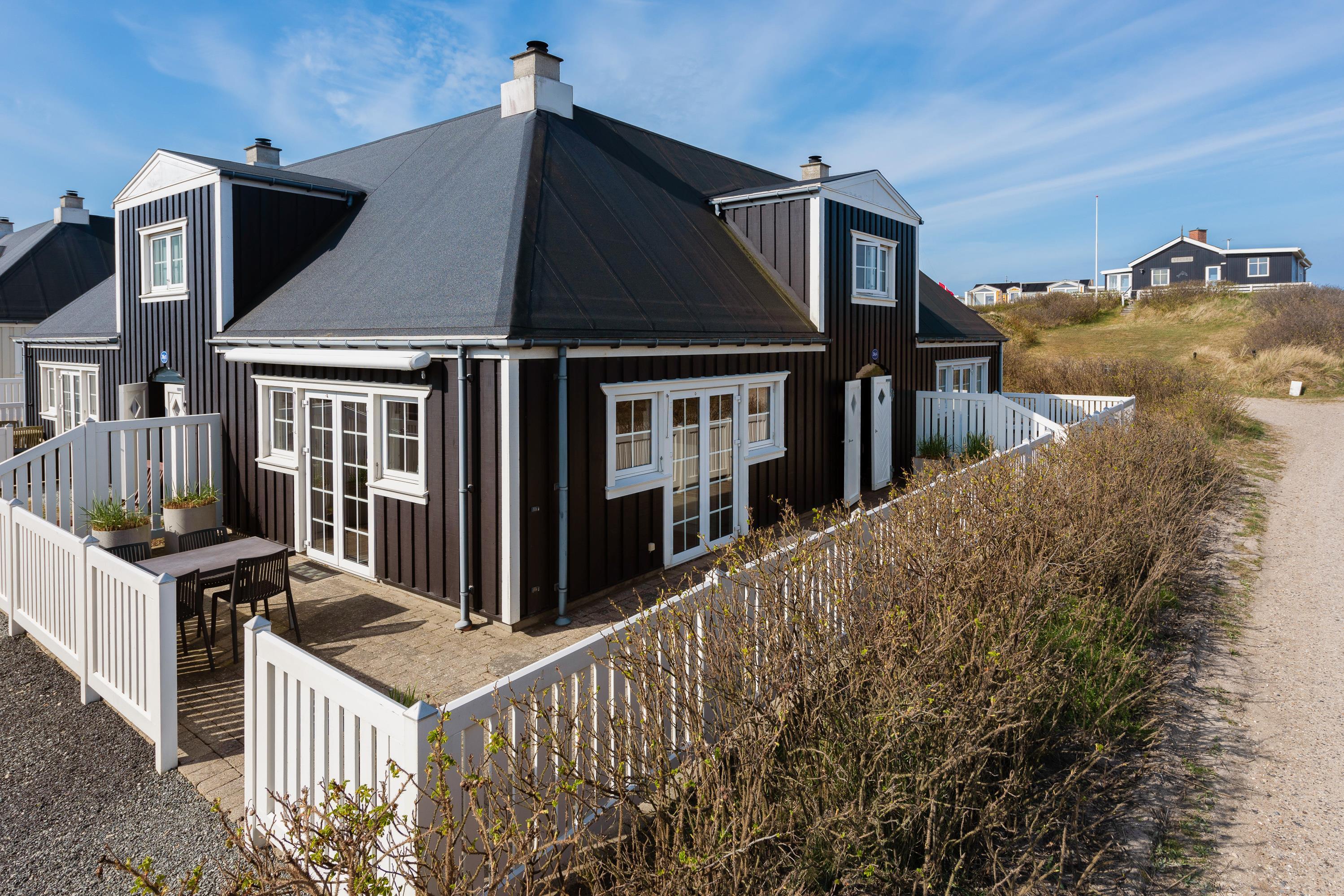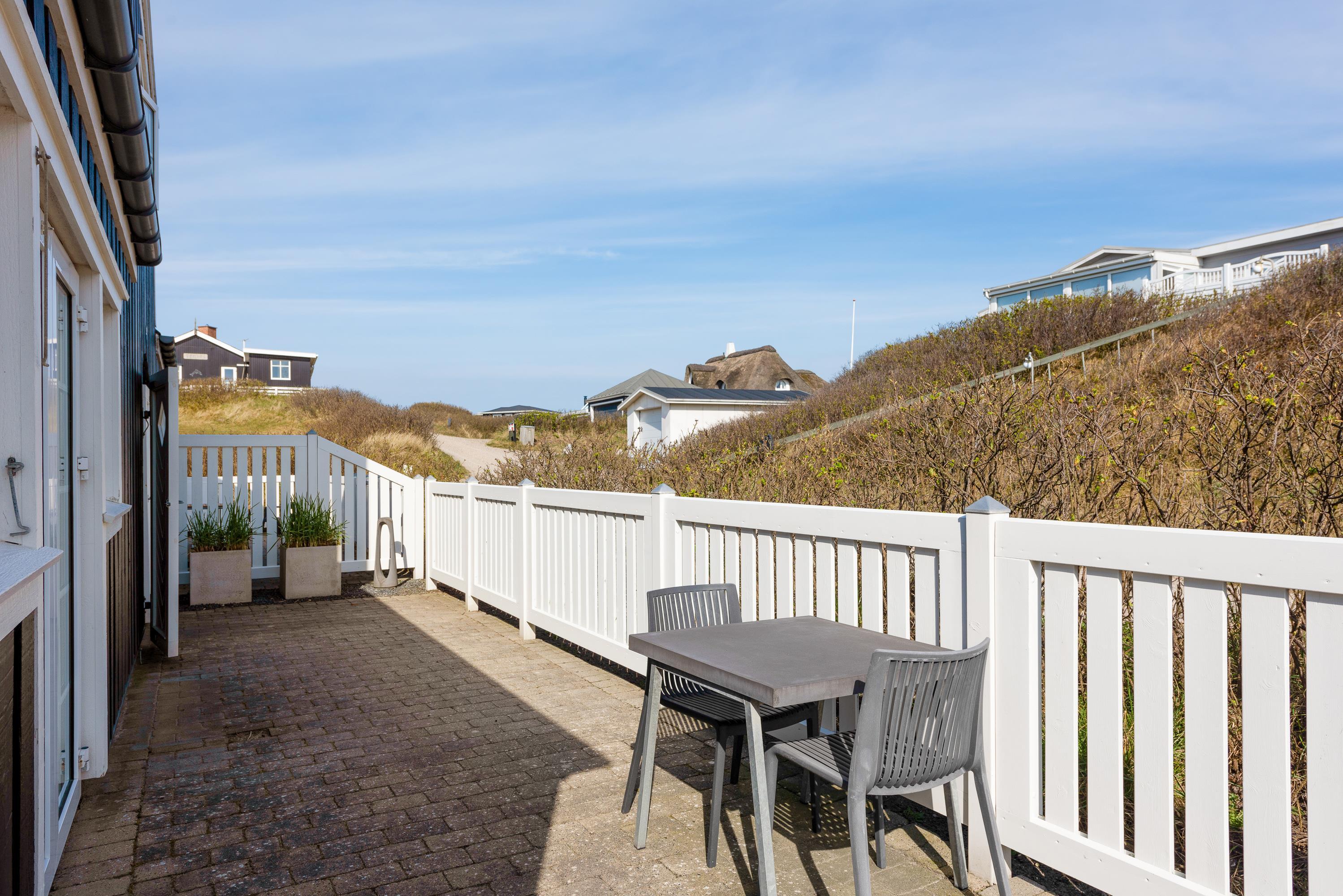 Fra stuen er der to udgange til den afskærmede terrasse med udsyn til Søndervigs skønne klitlandskab. Havemøbler, liggestole og grill står klar til at gøre de varme sommerdage endnu bedre med solbadning og hyggelige grillaftener. En markise giver mulighed for overdækning.