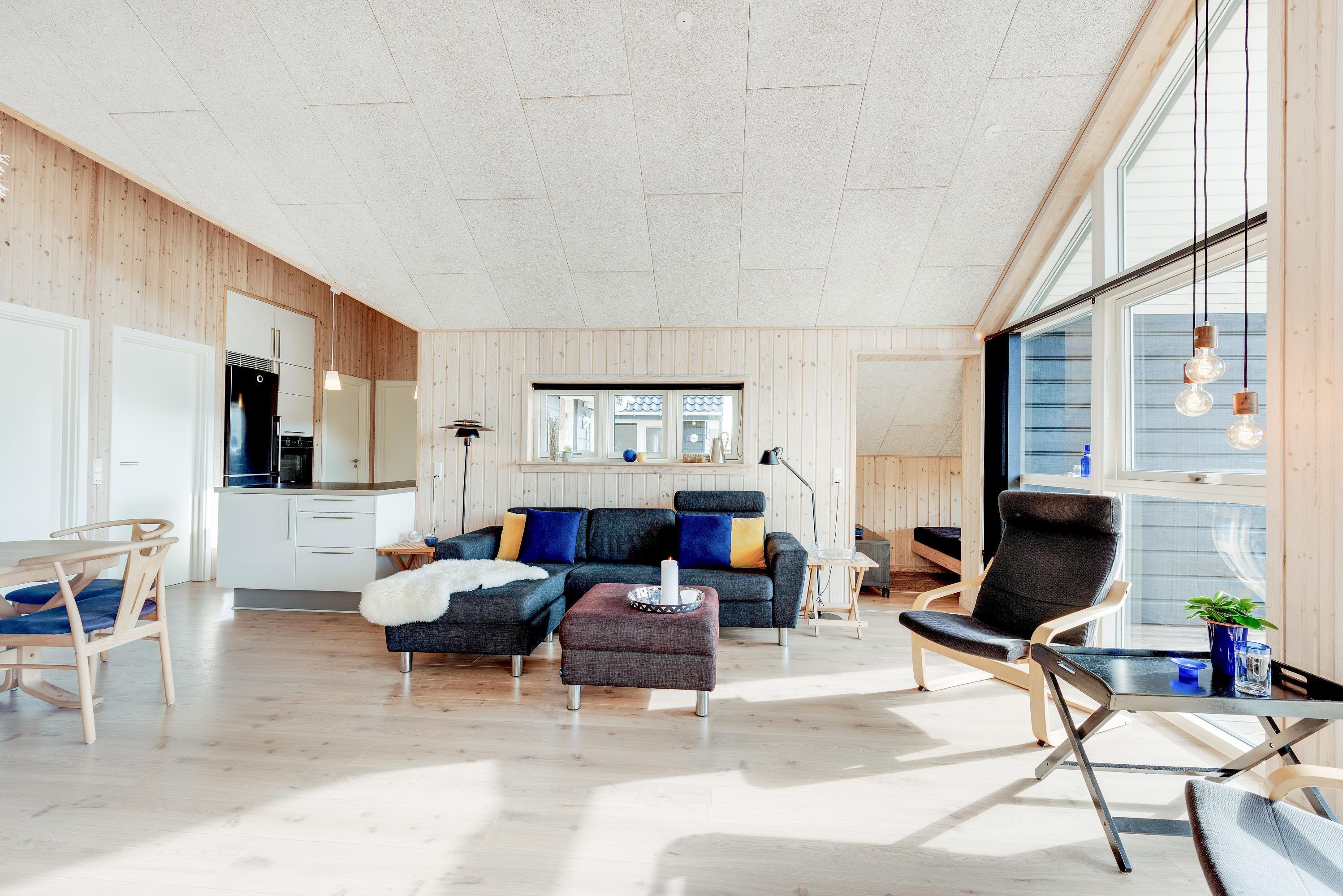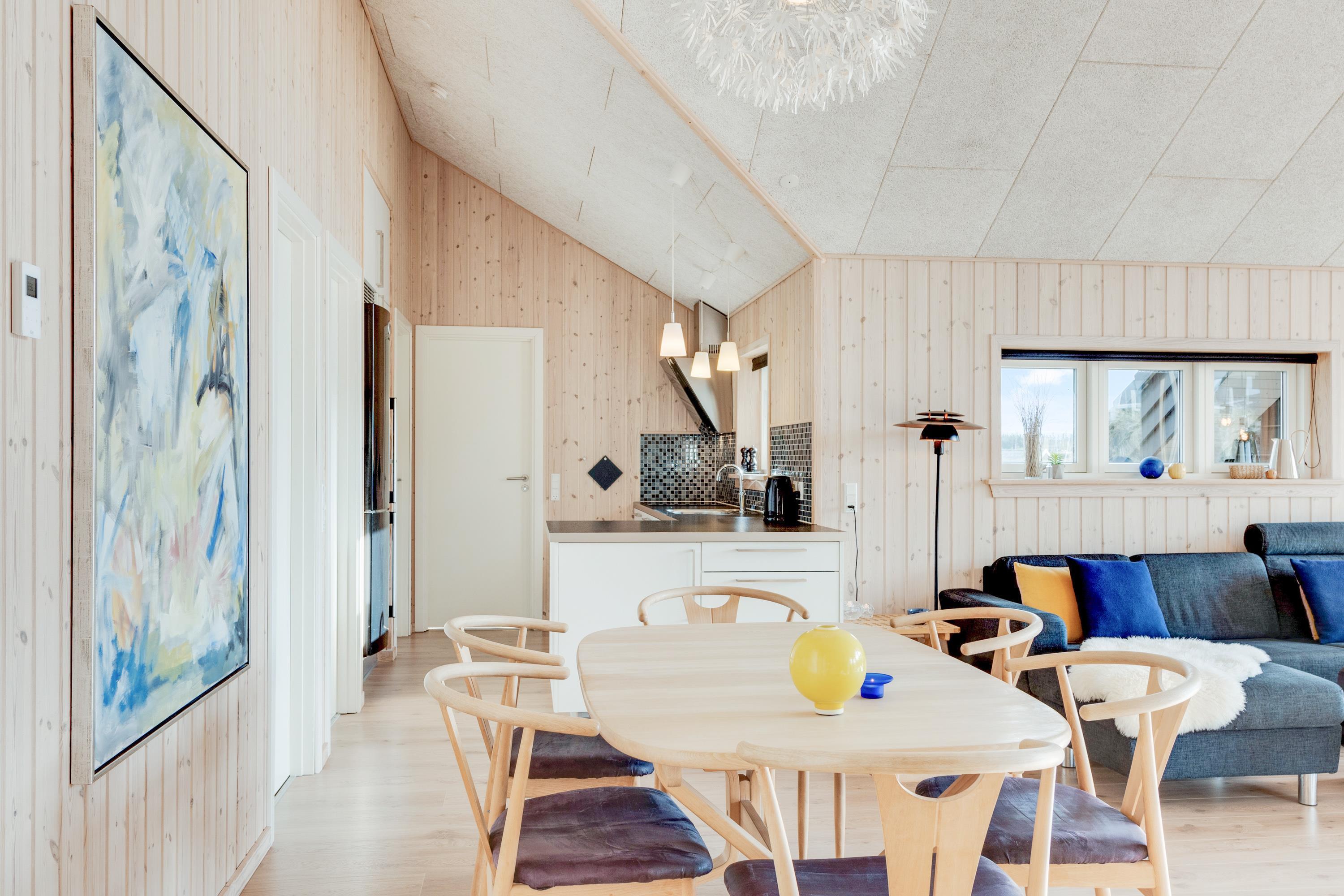 I hele opholdsrummet og i værelserne går loftet hele vejen til kip med synlige egetræsbjælker, hvilket er med til at skabe en god stemning og et hyggeligt twist i husets indretning. Hvis I er vilde med brændeovnshygge, kan I også opleve det her i feriehuset. I kan nemt tænde op i brændeovnen og nyde al den varme og hygge som den spreder