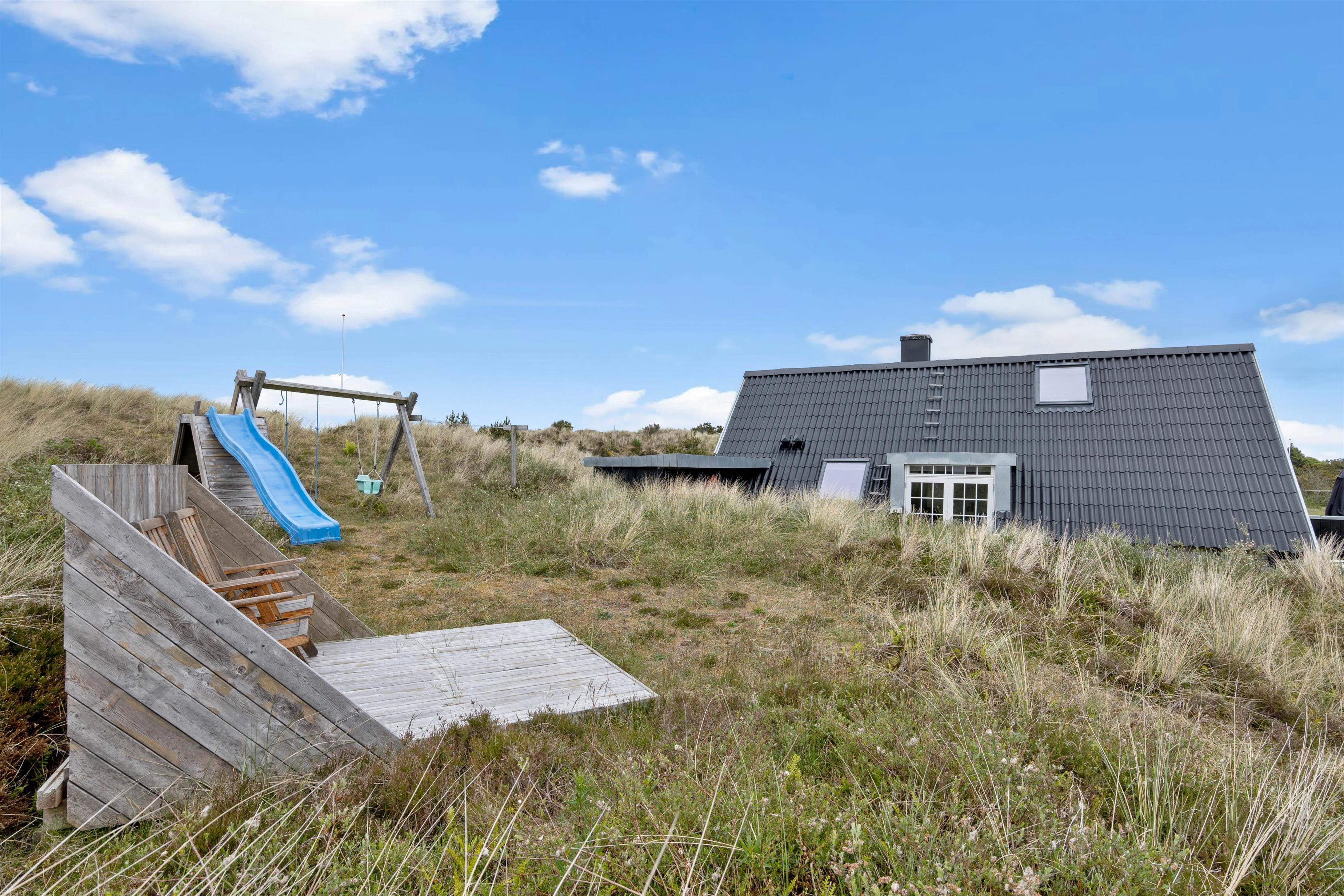 Det hyggelige sommerhus sætter rammerne for en enkel og afslappende ferie i smukke omgivelser, og fra balkonen på første etage kan I nyde udsigten ud over det unikke, klitbeklædte sommerhuslandskab.