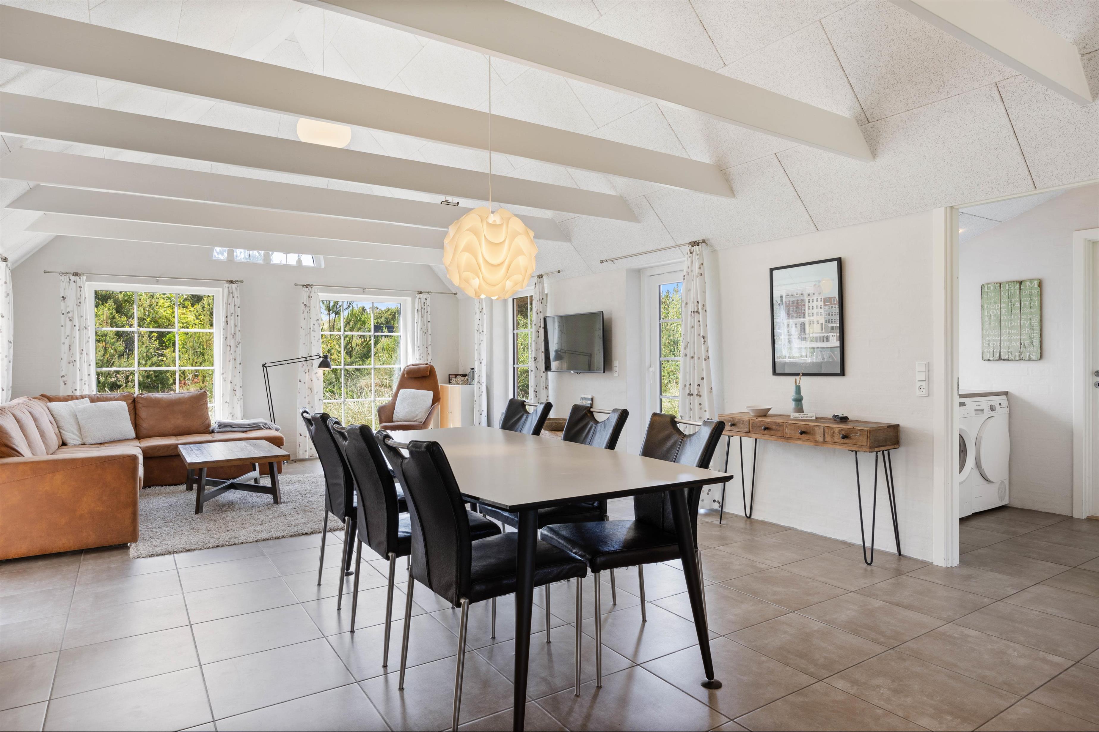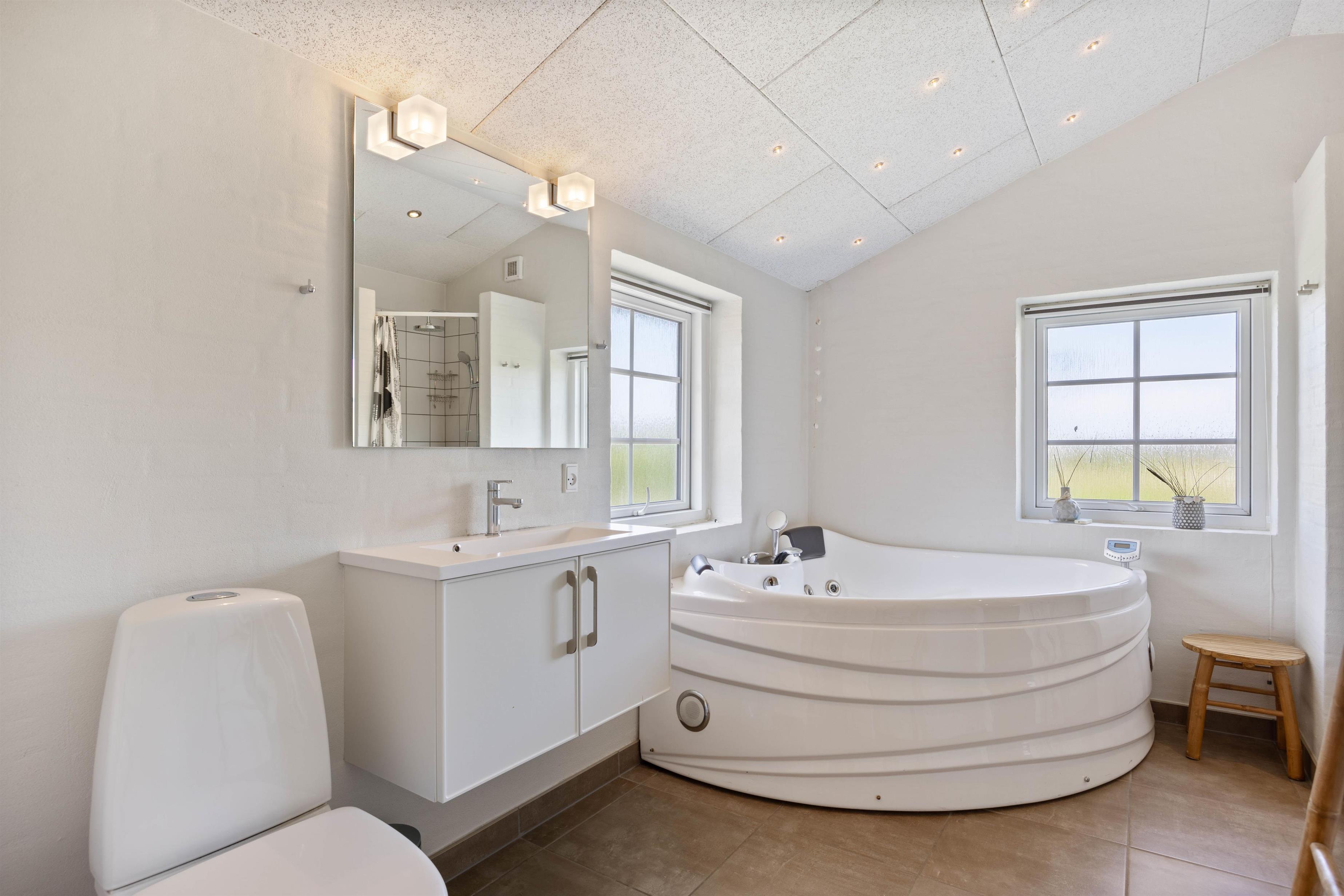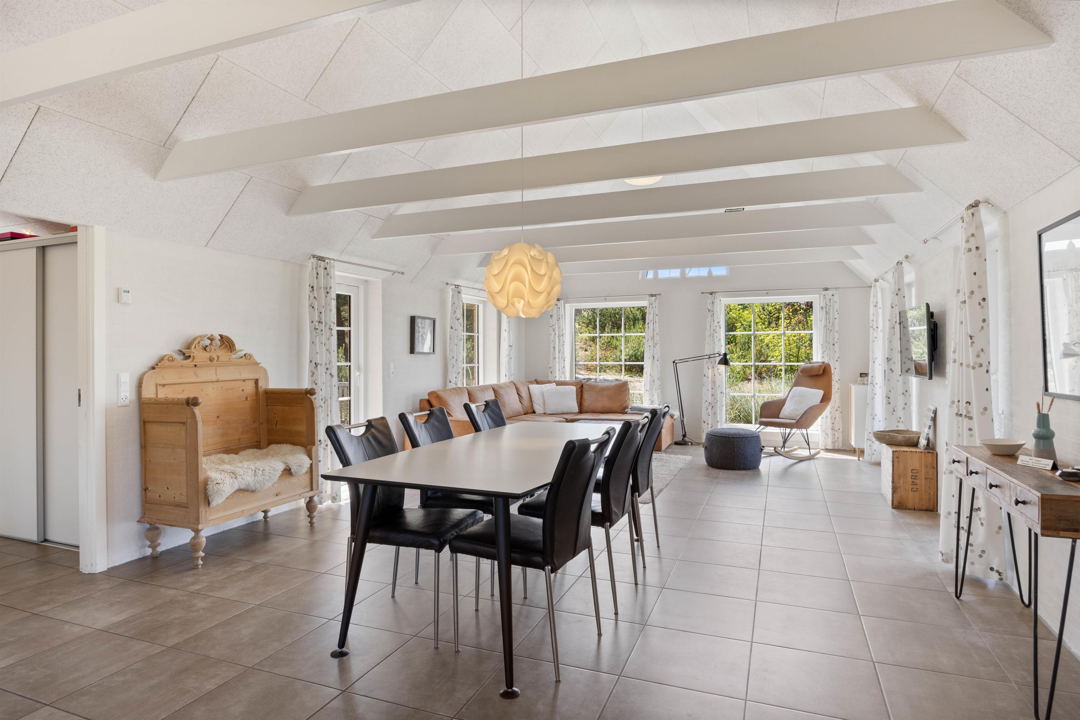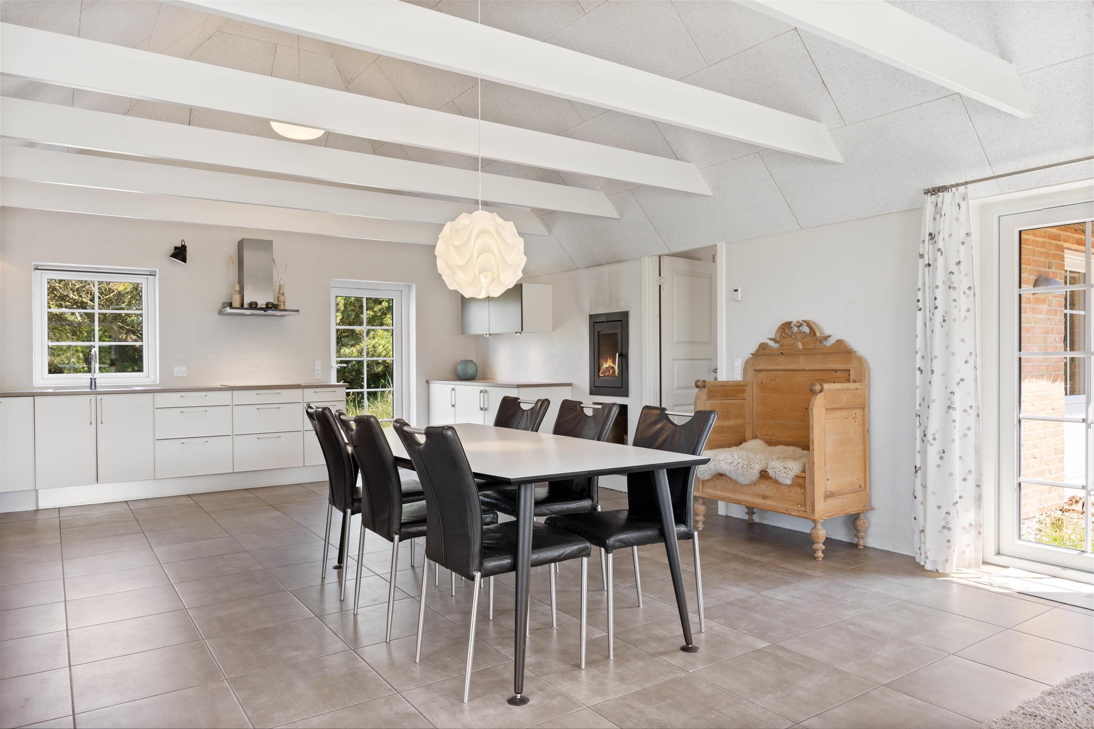 Sommerhusets hjerterum er uden tvivl det dejlige, lyse køkken hvor I også finder brændeovnen. Køkkenet er i direkte forbindelse med opholdsstuen og stuen, hvor I kan samles og hygge jer mens der laves mad eller spilles spil alt imens brændeovnen skaber ægte sommerhushygge. Sommerhuset har hele 2 badeværelser, så der ikke opstår kø om morgenen for jer ved den daglige morgenrutine. Det ene badeværelse har både sauna og spa og giver følelsen af velvære og wellness på ferien. Her vil I uden tvivl komme til at tilbringe mange dejlige feriestunder.