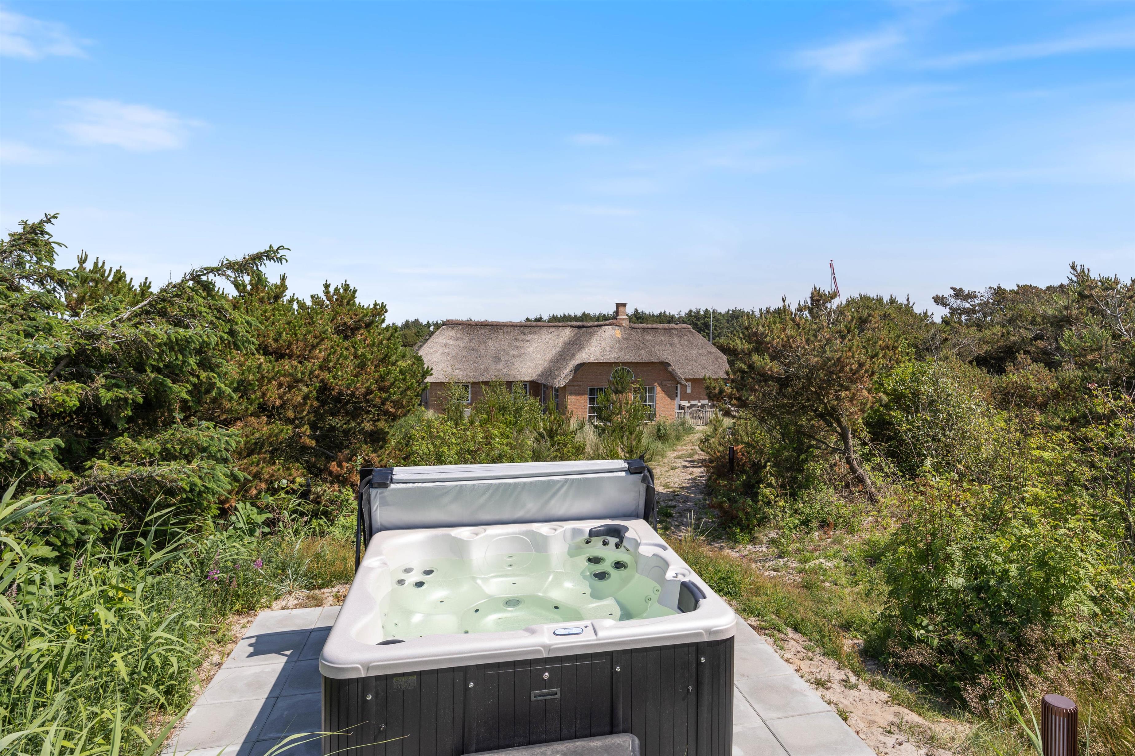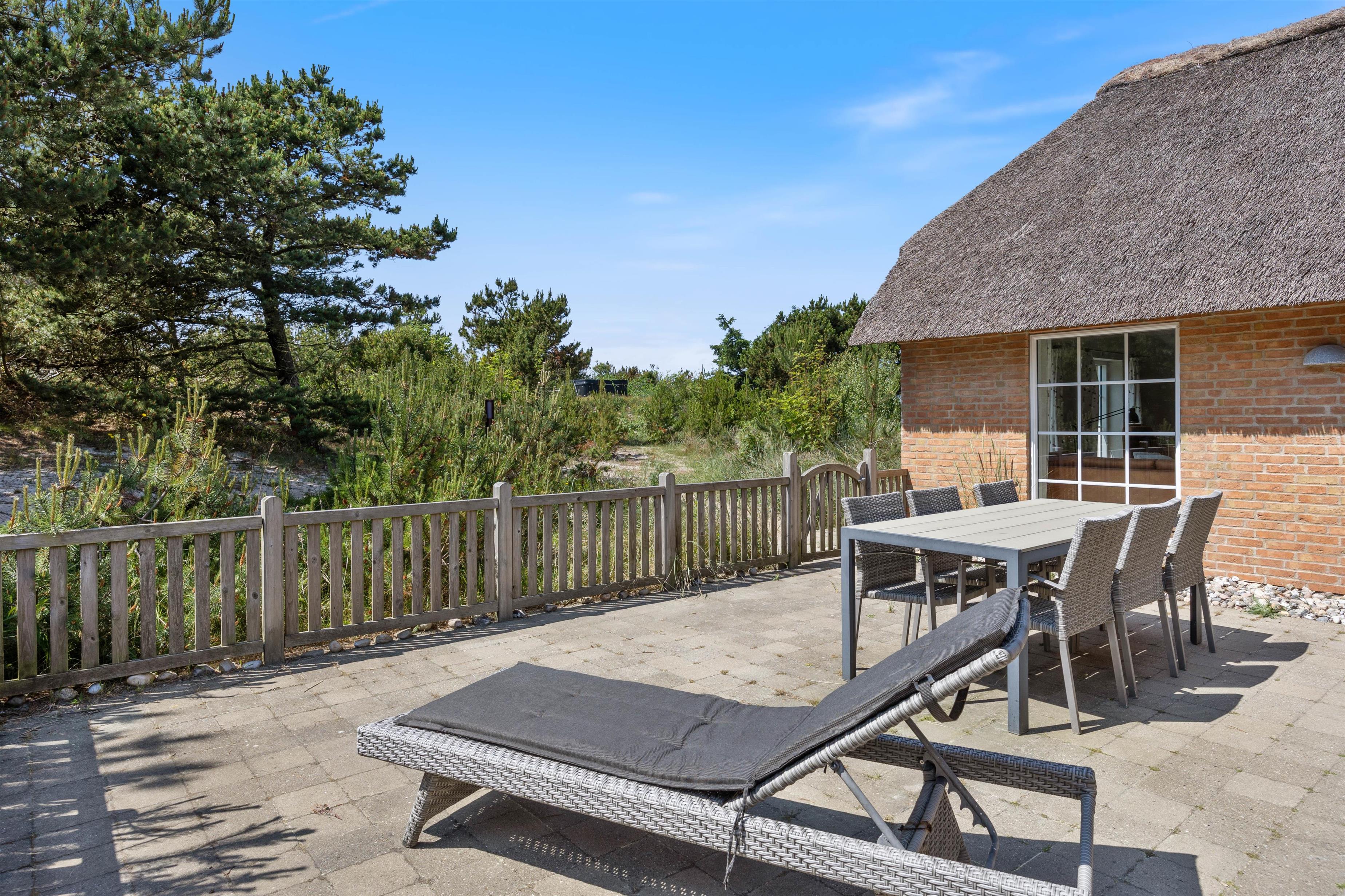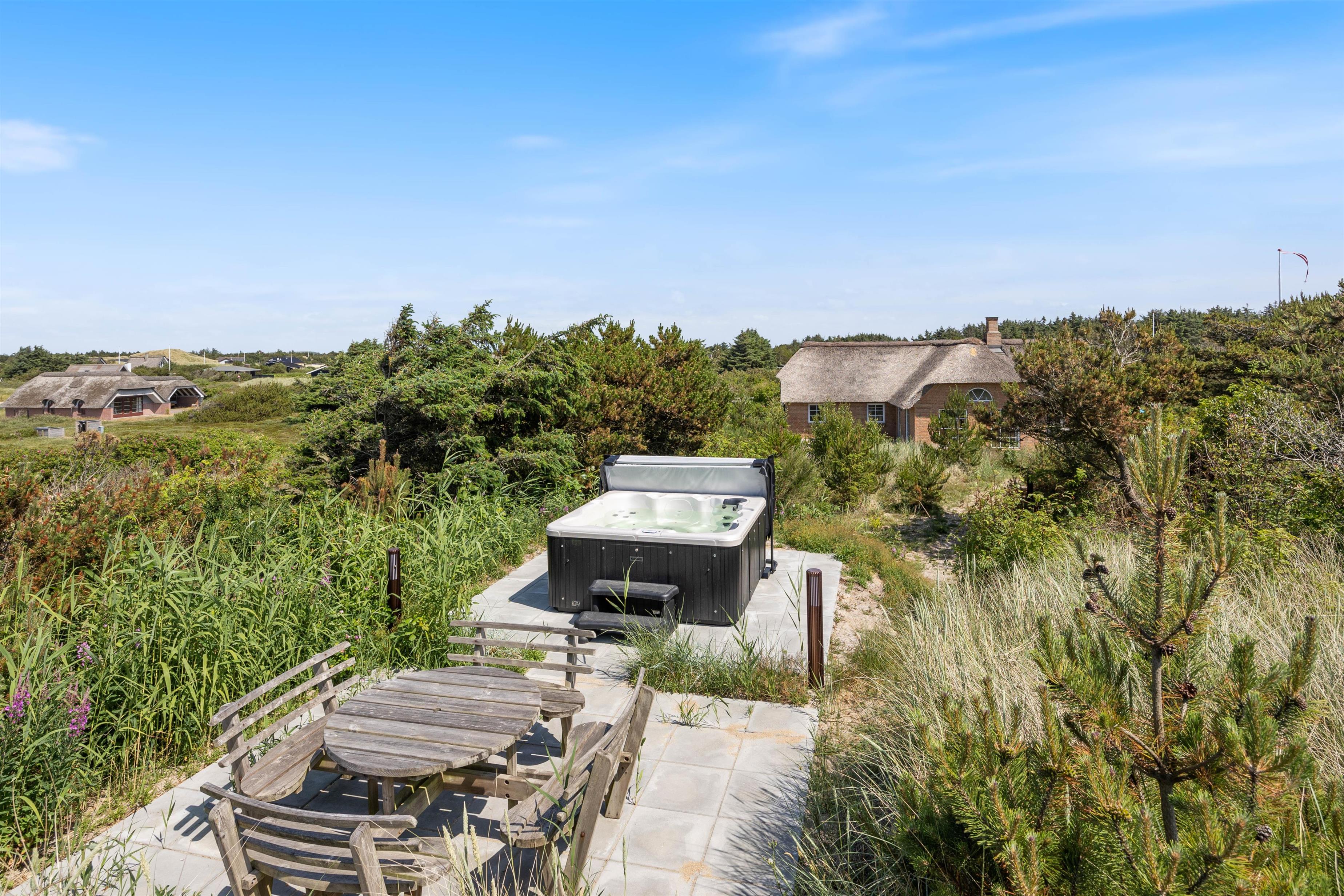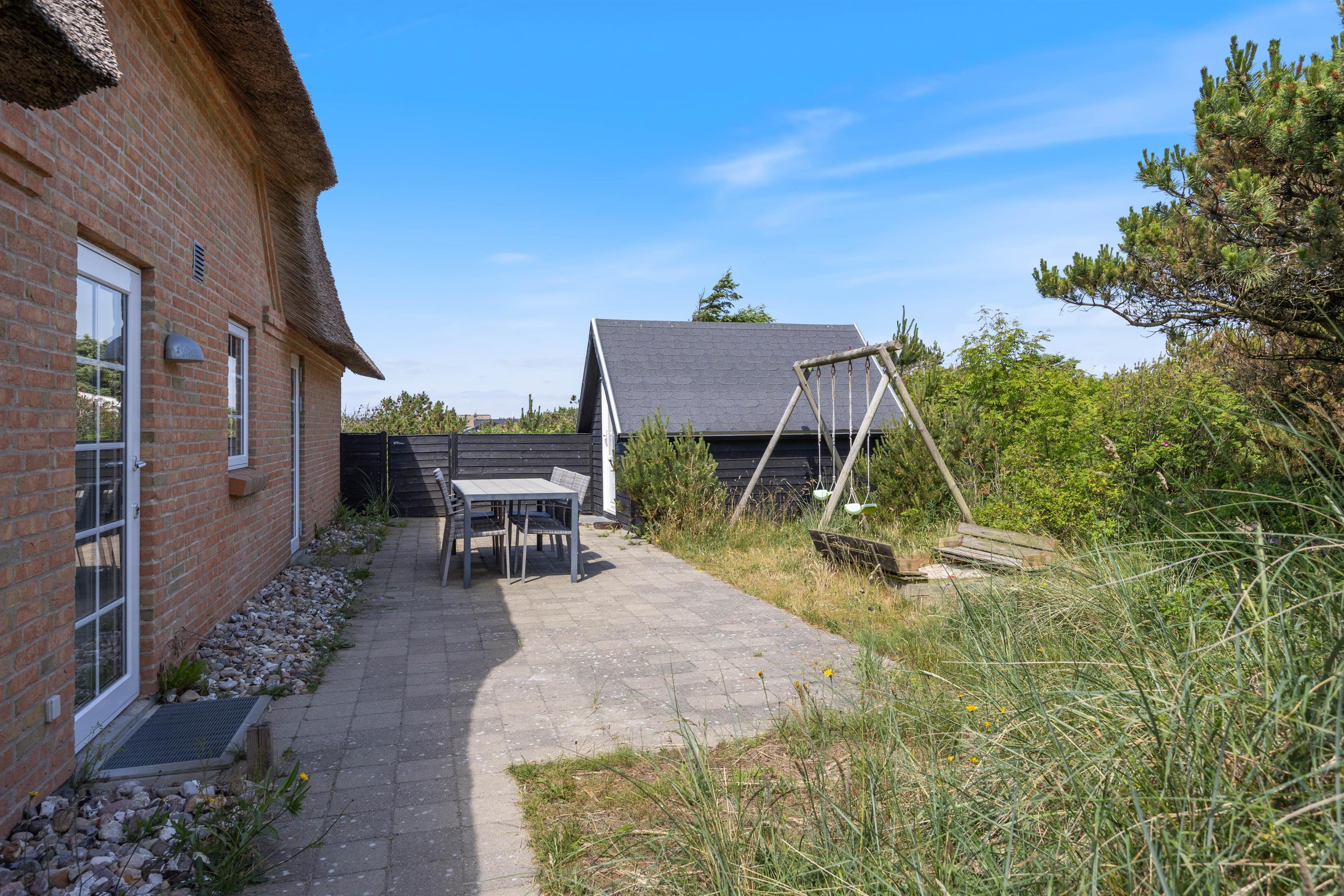 På solrige dage kan I slænge jer i havemøblerne på en af de dejlige terrasser der omgiver huset. For de mindste er der også gynger og sandkasse, som helt sikkert vil være et hit. På den ene terrasse finder I også udendørsspaen, der har plads til 6 personer. Eller hvad med et forfriskende skyl under udebruseren? Hvor I kan skylle sandet af efter en gåtur langs havet.