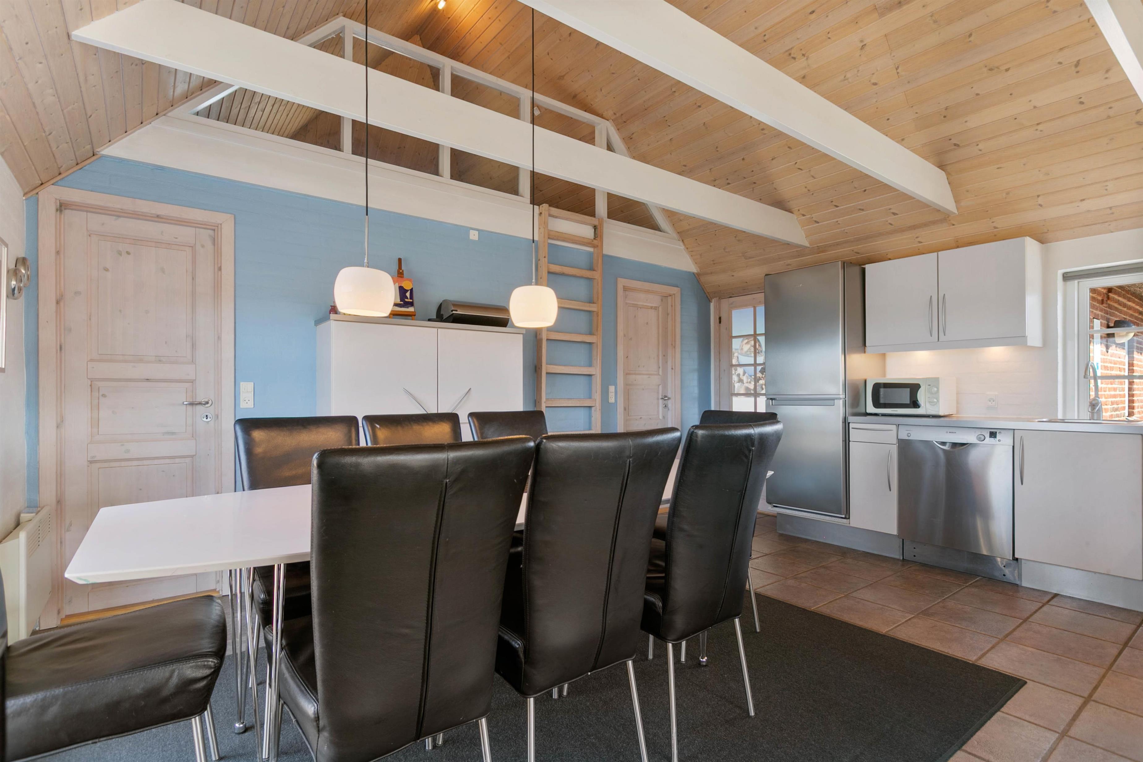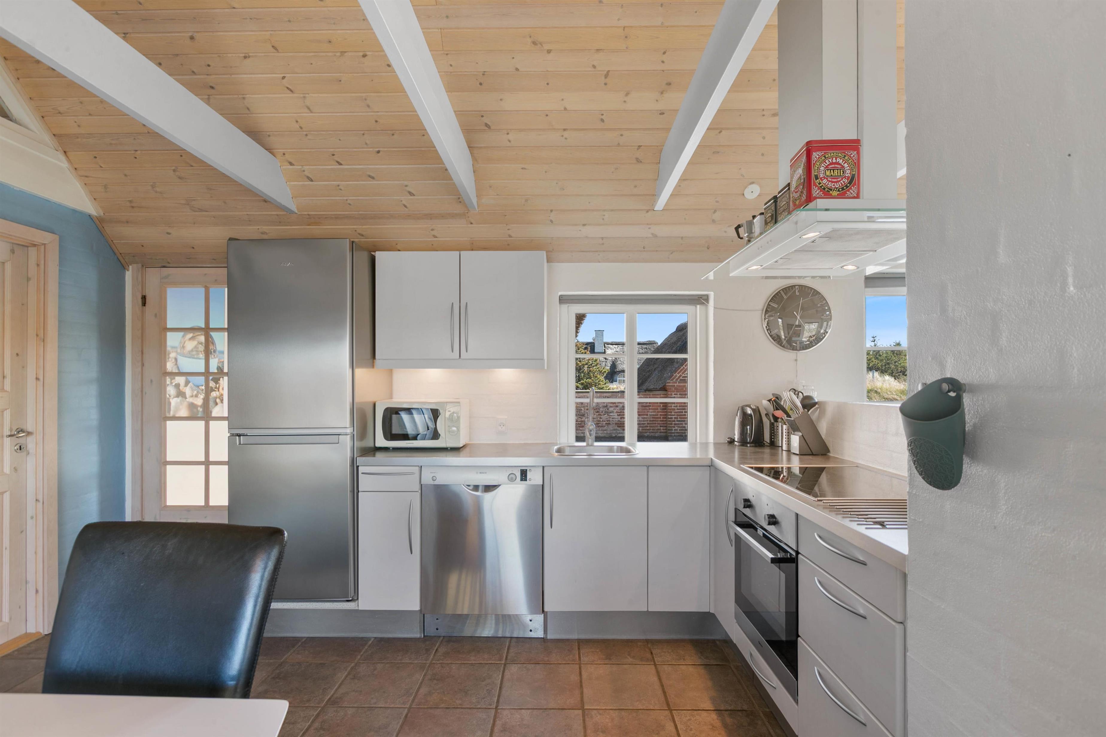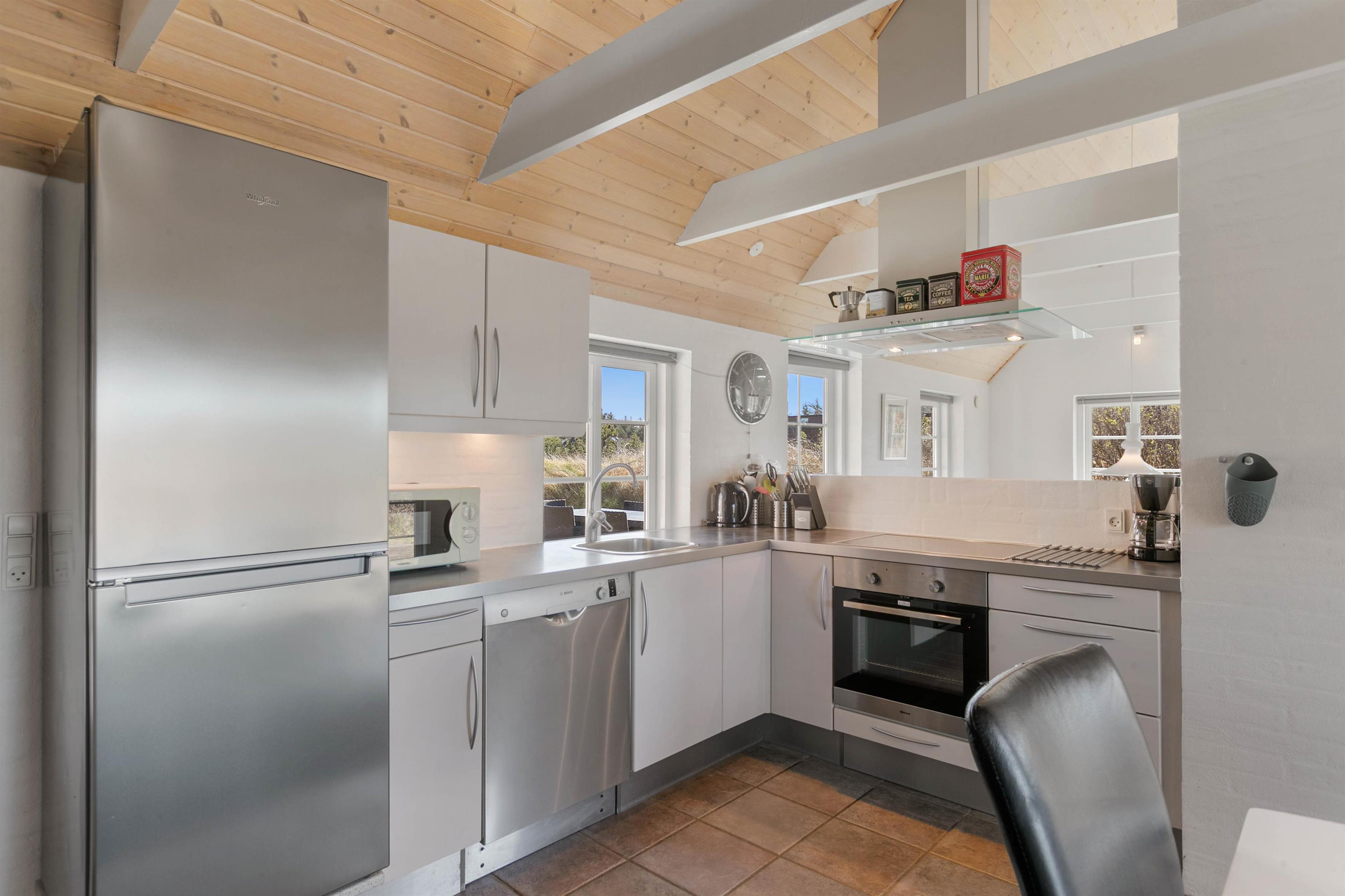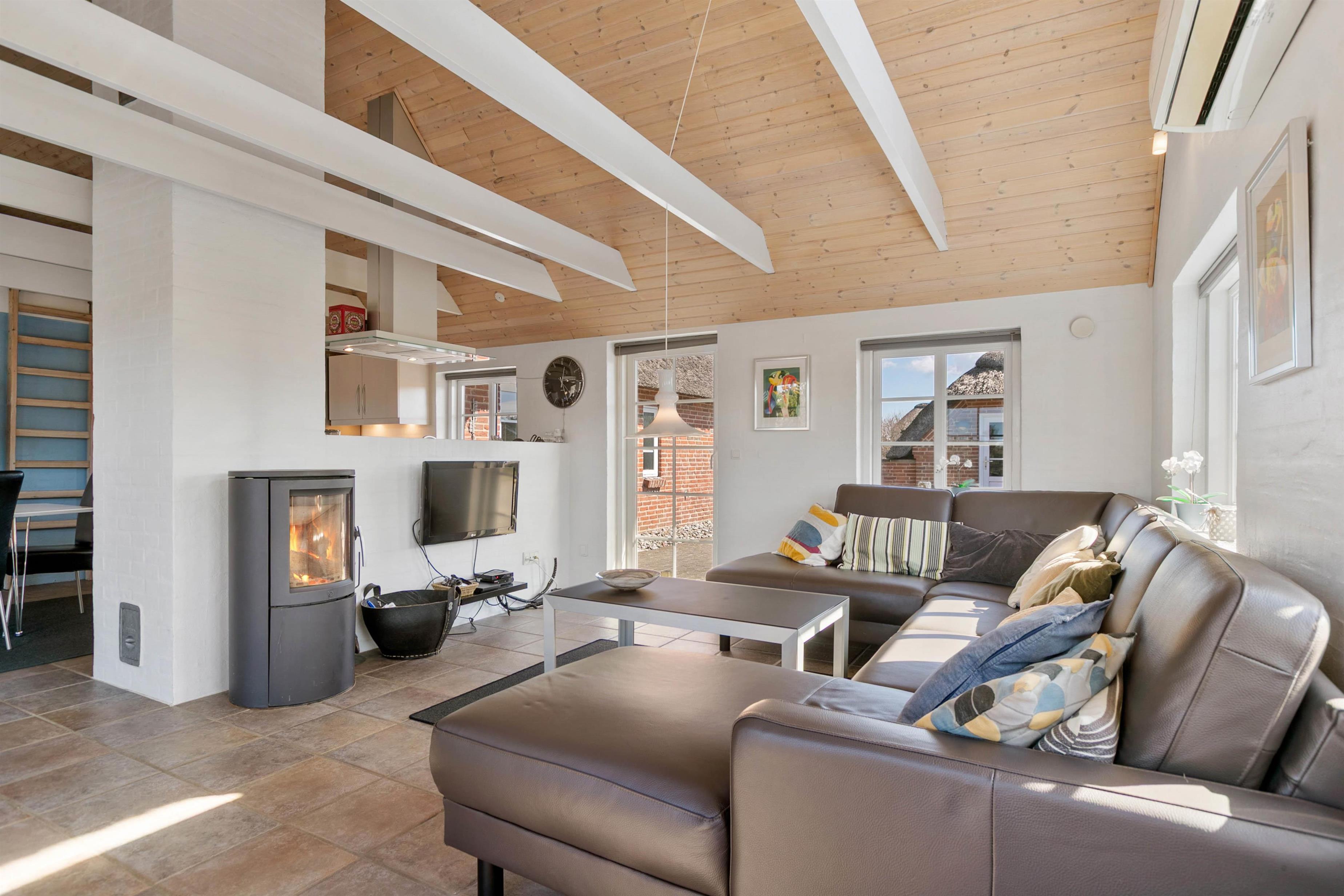 Indretningen i huset er lys og indbydende. I stue og alrum går loftet højt til kip med synlige loftsbjælker. Det giver luft og masser af lys i rummet. Køkkenet er placeret bag en halvmur i alrummet. Det betyder, at I har mulighed for at være samlet, selvom I laver forskellige ting. Fra alrummet er der desuden opgang til en dejlig hems, som er perfekt, hvis I har børn. De vil elske den hulestemning, der er i hemsen. Her kan de lege og hygge sig og samtidig følge med i gangen i huset. Stuen er indrettet med en dejlig brændeovn og en god, stor sofa, som har plads til hele familien. Og med en 60 L separat fryser er der også god plads til at opbevare mad og drikke til hele ferien