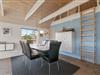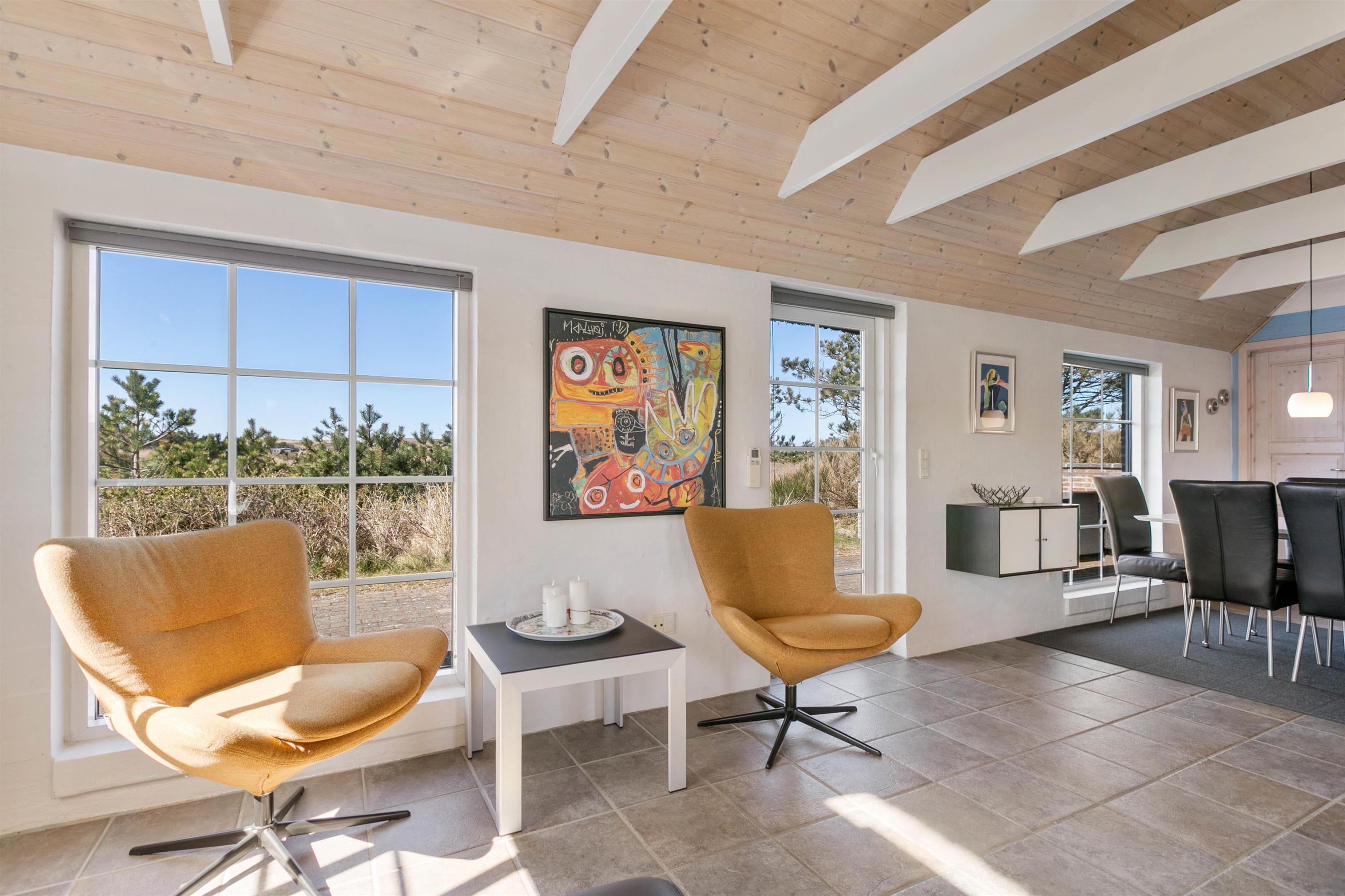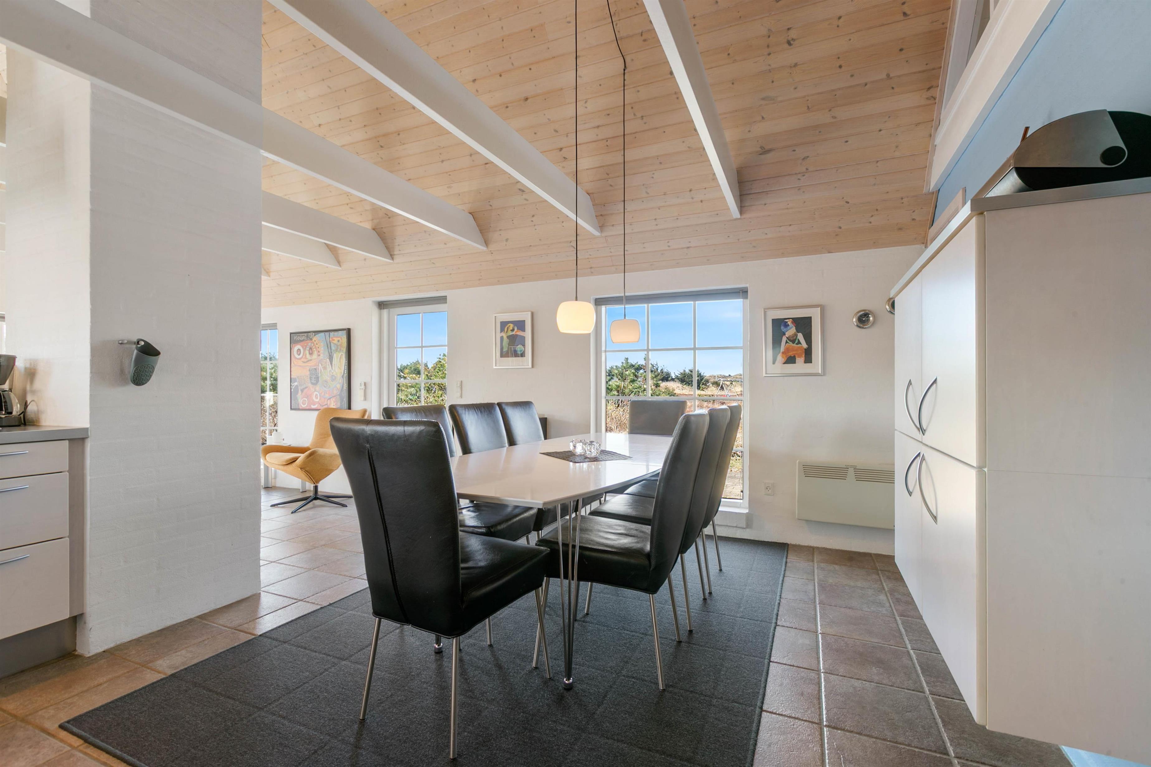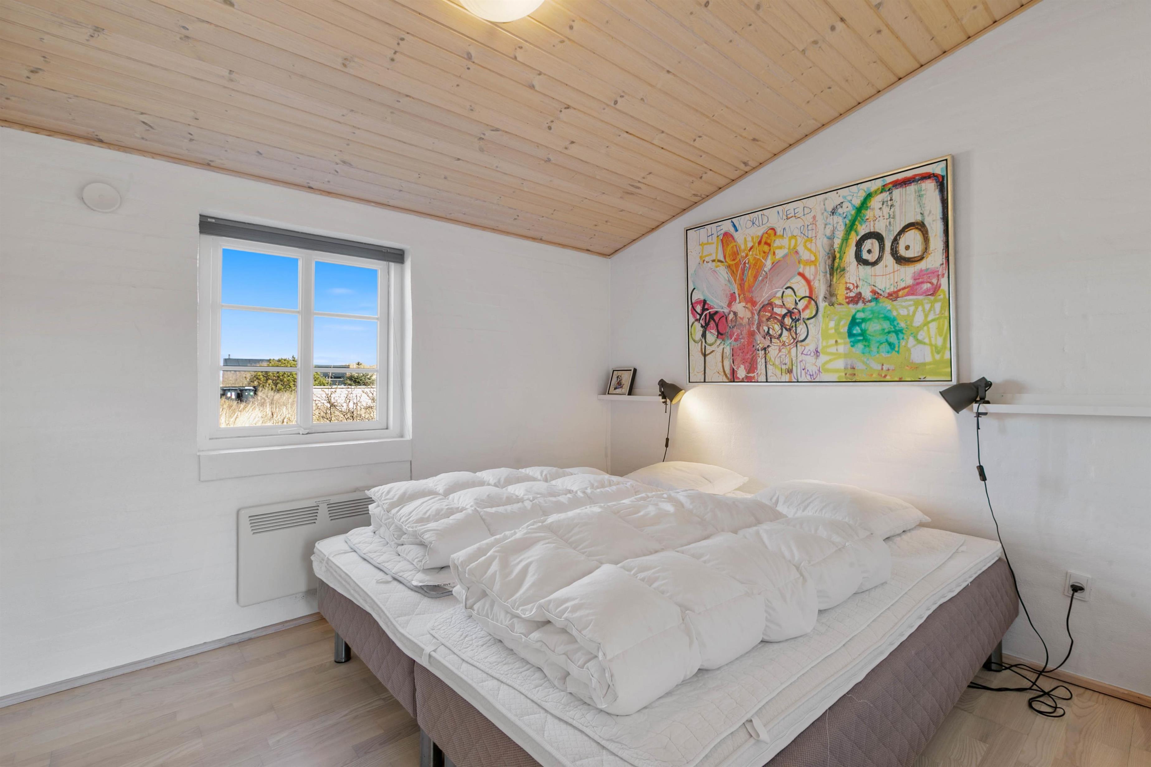 Indretningen i huset er lys og indbydende. I stue og alrum går loftet højt til kip med synlige loftsbjælker. Det giver luft og masser af lys i rummet. Køkkenet er placeret bag en halvmur i alrummet. Det betyder, at I har mulighed for at være samlet, selvom I laver forskellige ting. Fra alrummet er der desuden opgang til en dejlig hems, som er perfekt, hvis I har børn. De vil elske den hulestemning, der er i hemsen. Her kan de lege og hygge sig og samtidig følge med i gangen i huset. Stuen er indrettet med en dejlig brændeovn og en god, stor sofa, som har plads til hele familien. Og med en 60 L separat fryser er der også god plads til at opbevare mad og drikke til hele ferien
