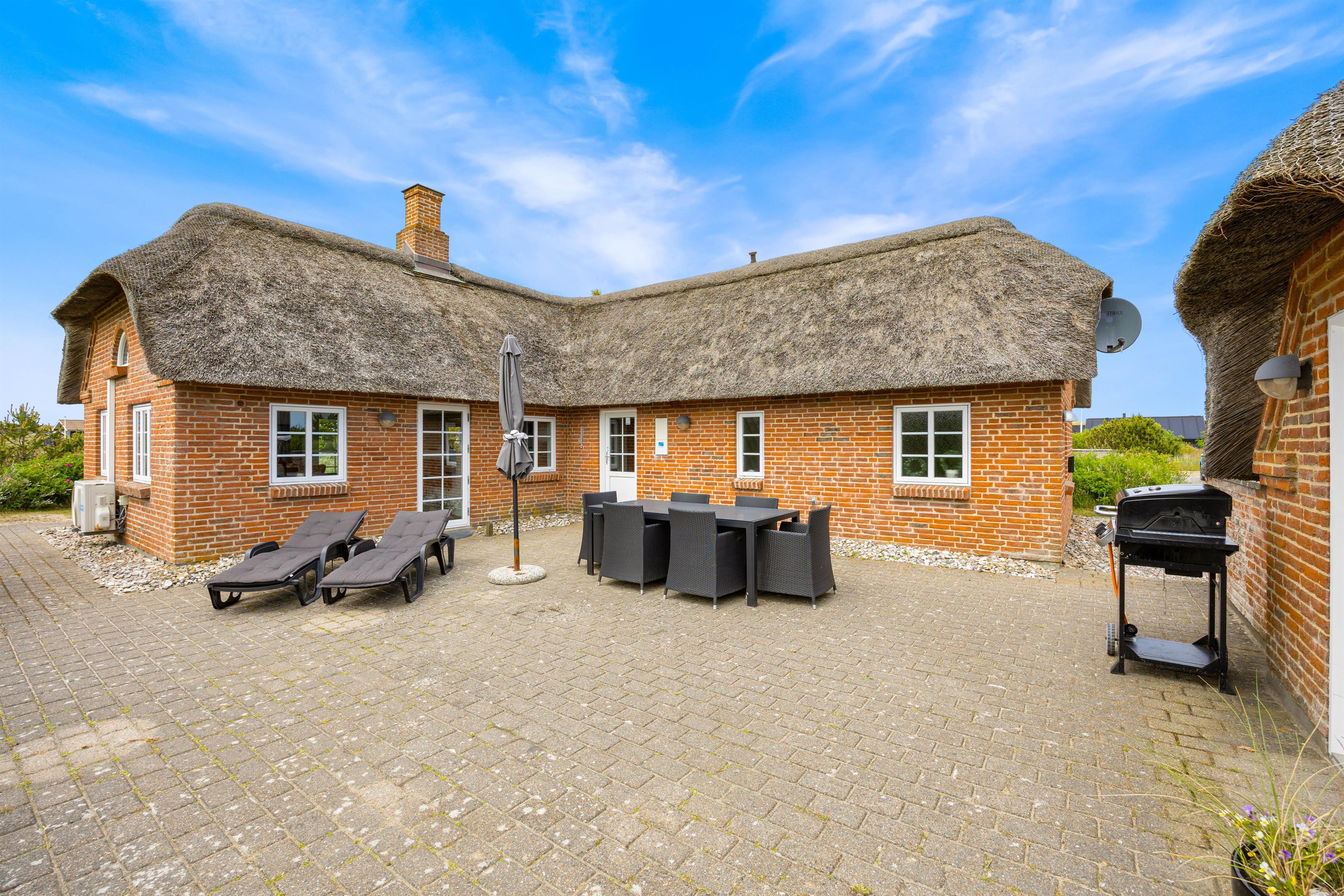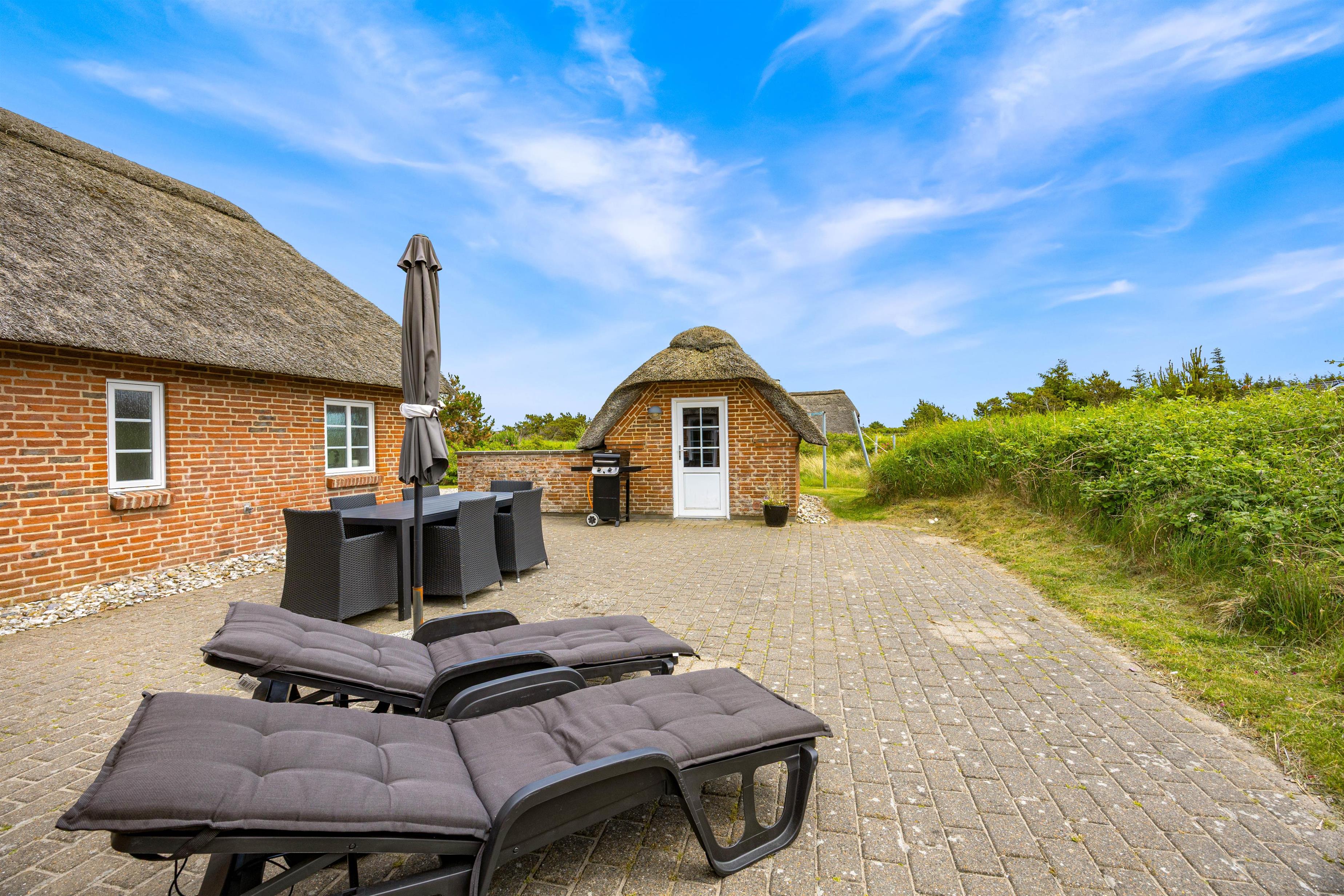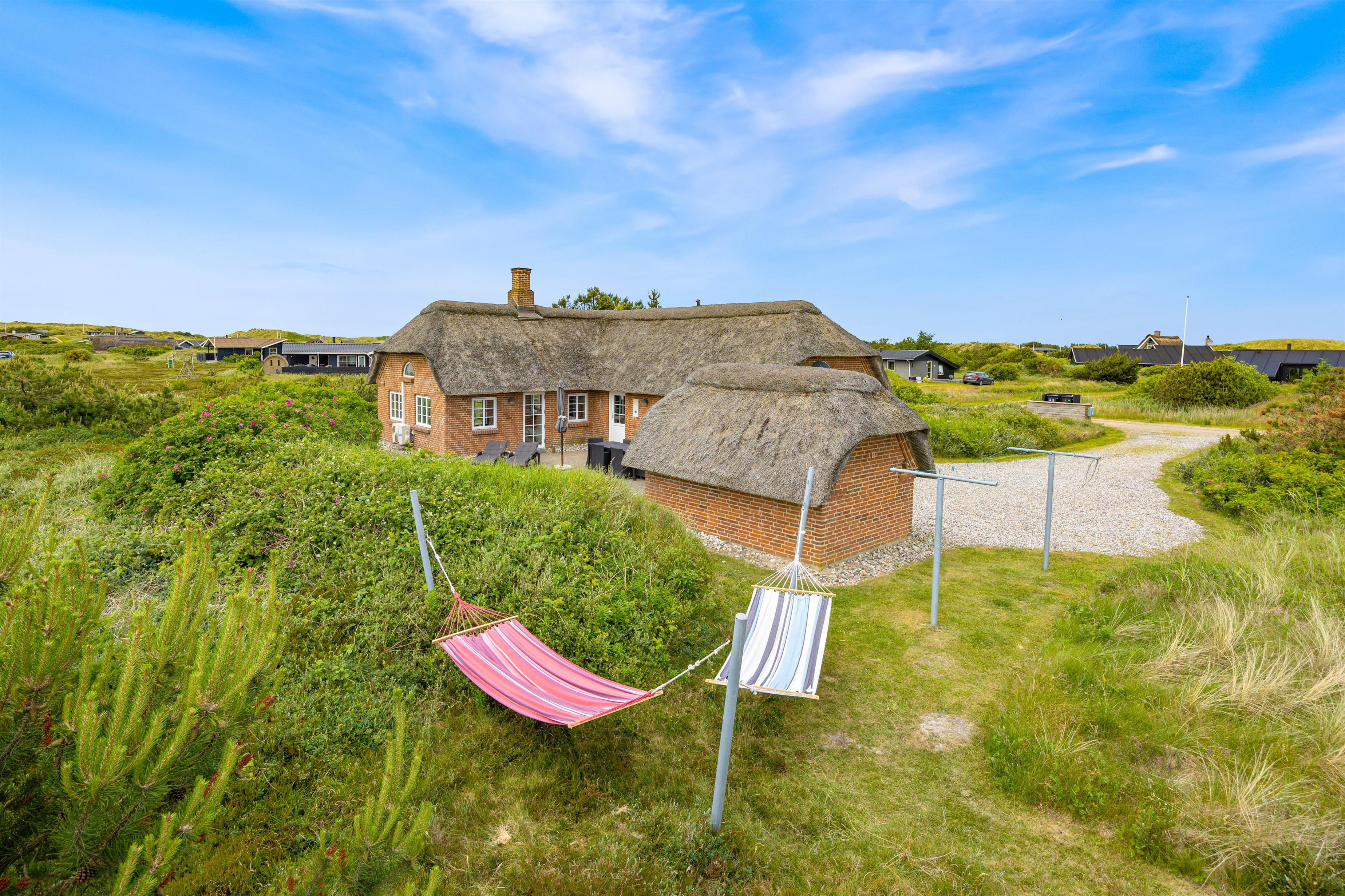 På Wolle Friks Vej 45 ved Søndervig ligger dette dejlige sommerhus med spabad og sauna. Huset er indbydende og velholdt og med stråtag. Et godt valg for en børnefamilie, der gerne vil bo centralt og tæt på byen men samtidig i naturskønne omgivelser. Rabat gives ved udlejning i to uger i ydersæsonen.