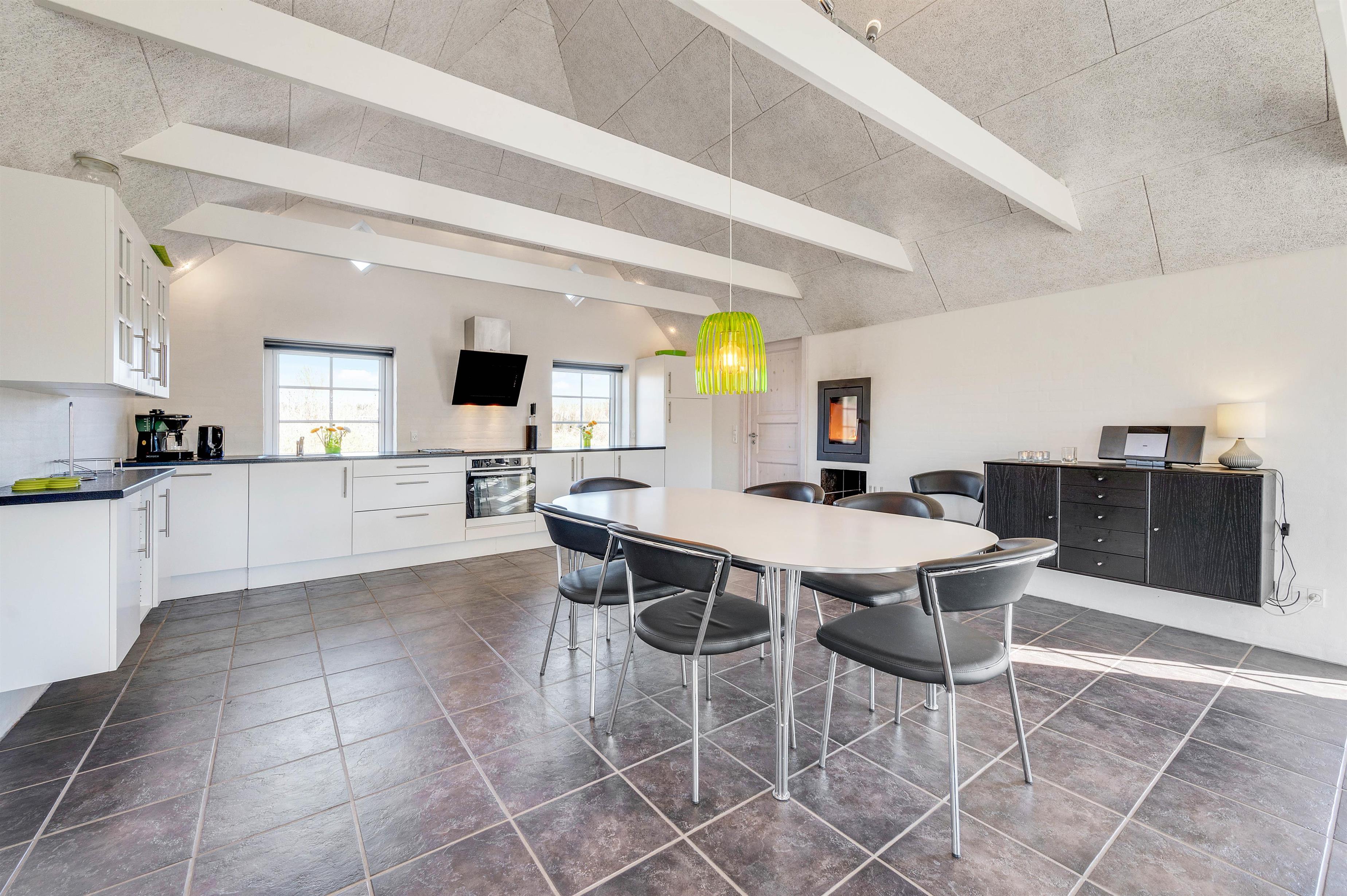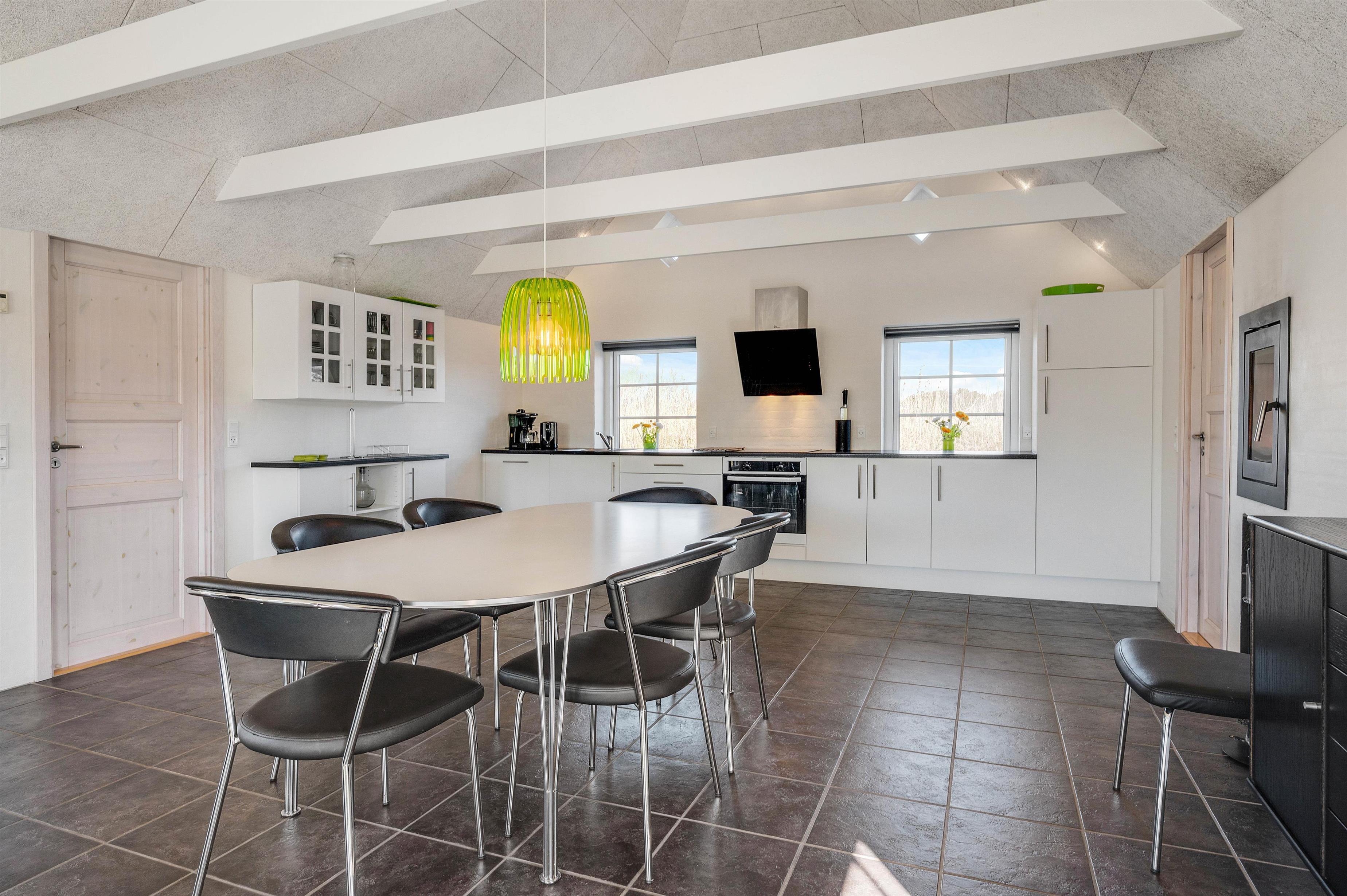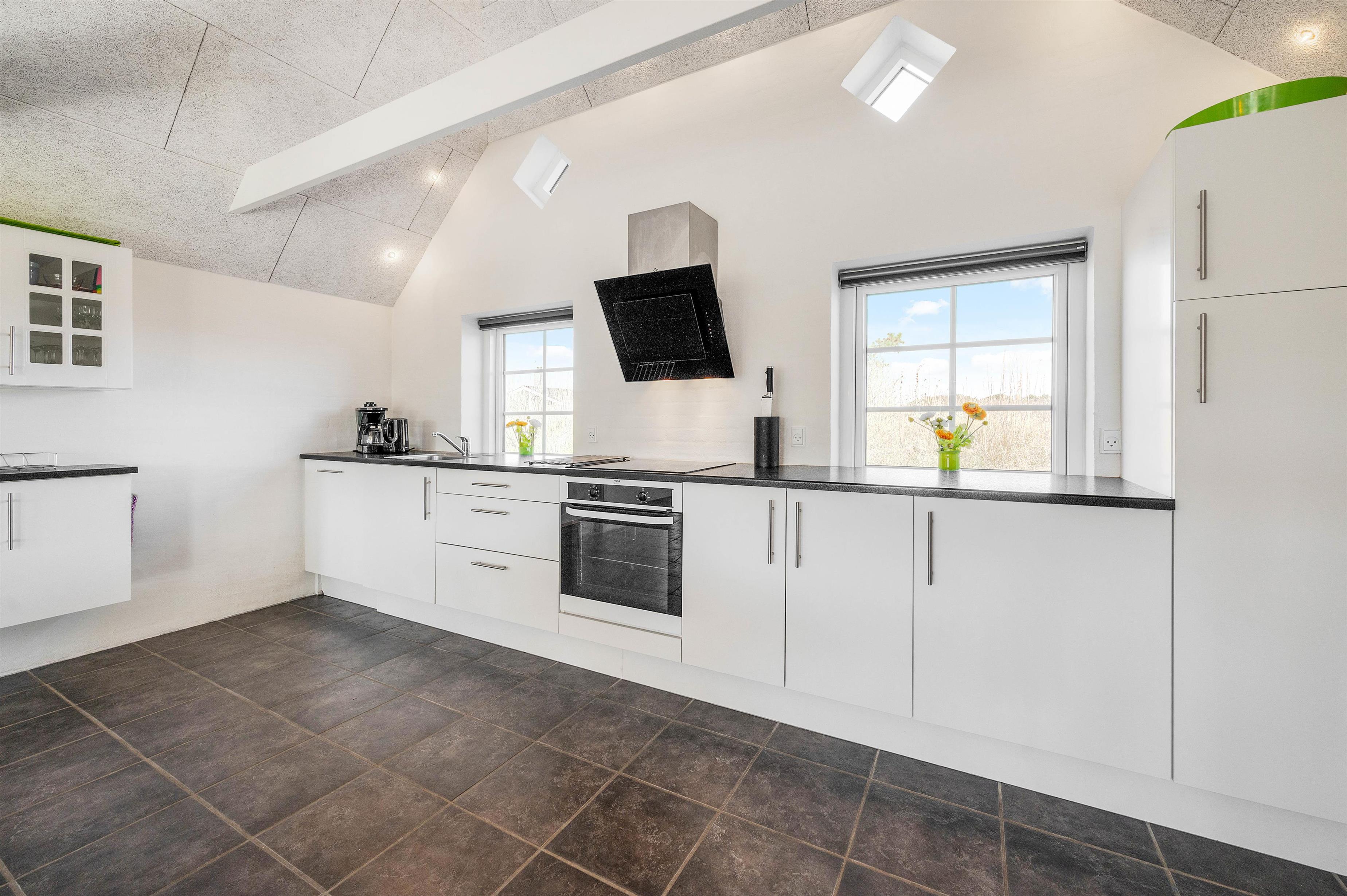 I den ene ende af opholdsrummet ligger det flotte køkken, der kalder på at blive indtaget. Her kan I tilberede jeres måltider, mens I vender og drejer dagens oplevelser. Køkkenet fremstår rent og velholdt med flotte fronter og er godt udstyret med mikroovn, opvaskemaskine og køleskab med 110 liters frysekapacitet.