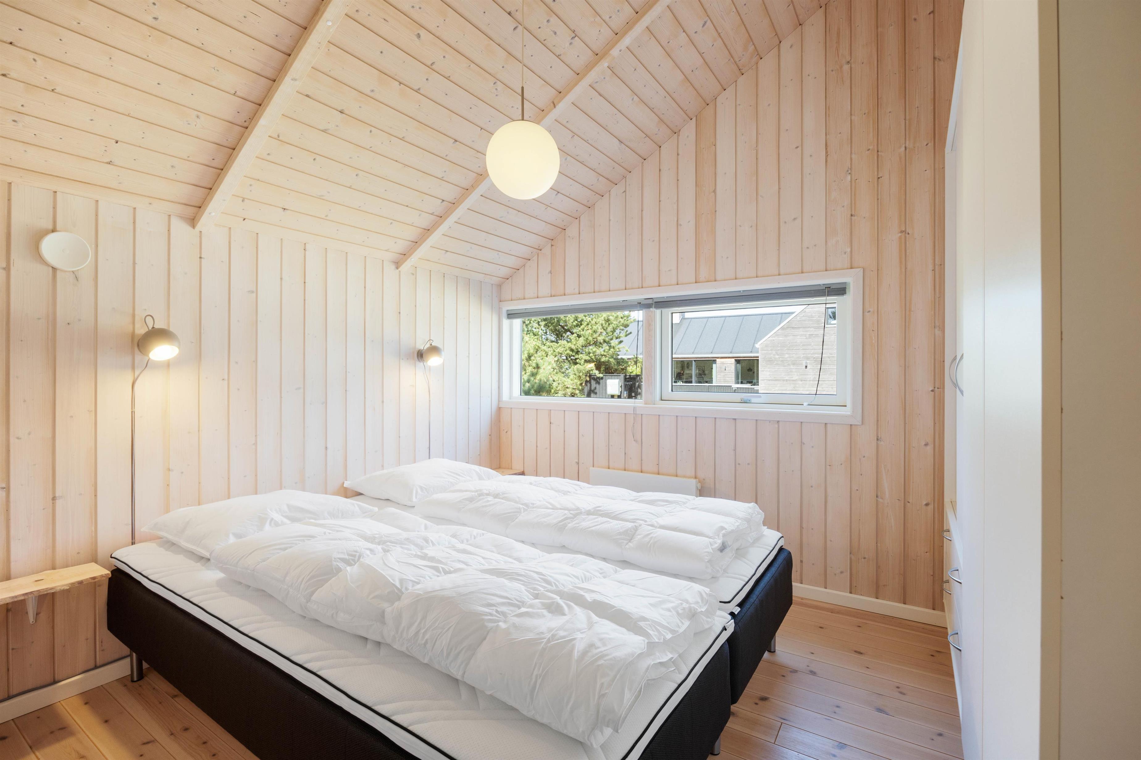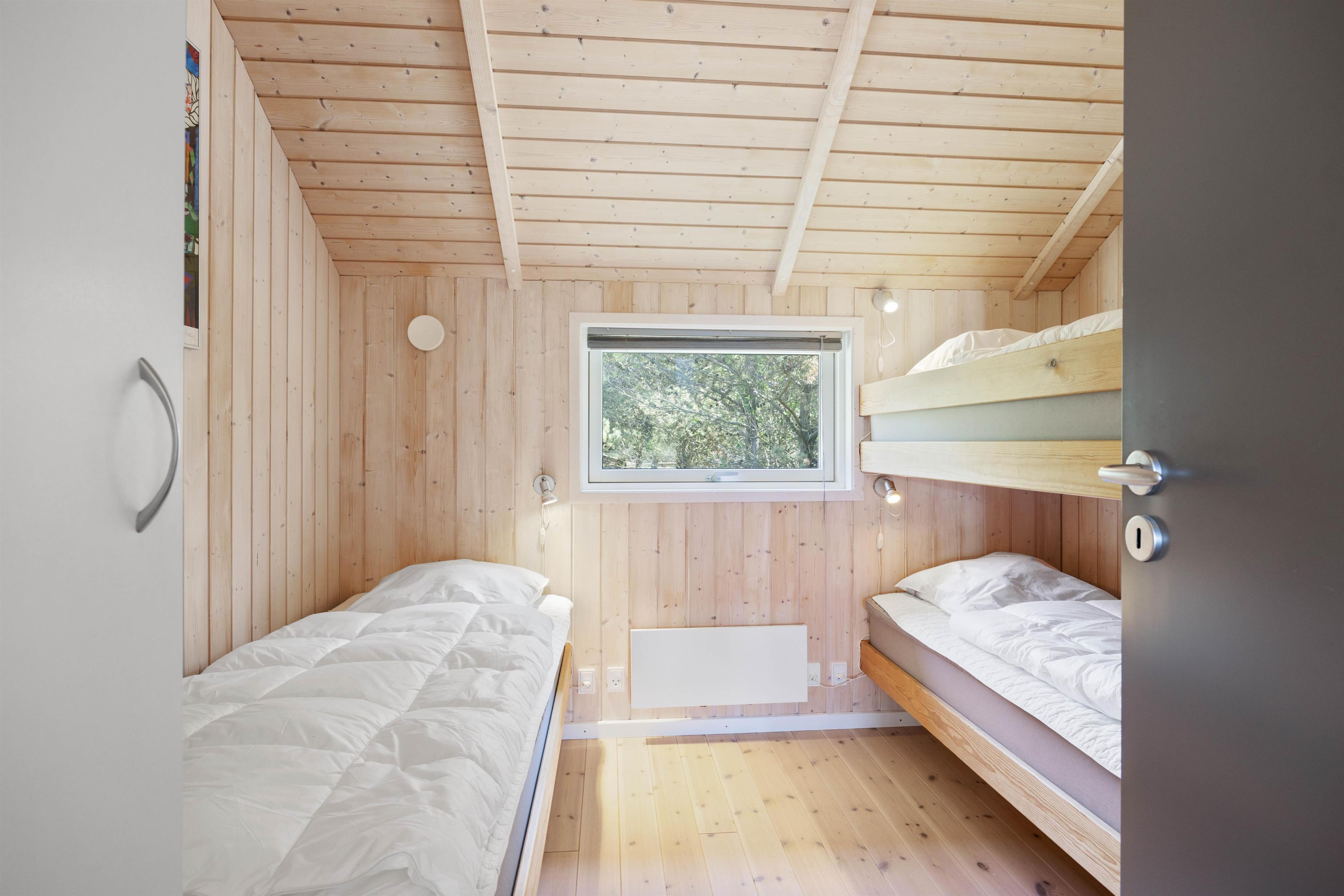 Der er 3 soveværelser i sommerhuset. To af soveværelserne er hver indrettet med en dobbeltseng, og i det tredje soveværelse er der en køjeseng og en enkeltseng.