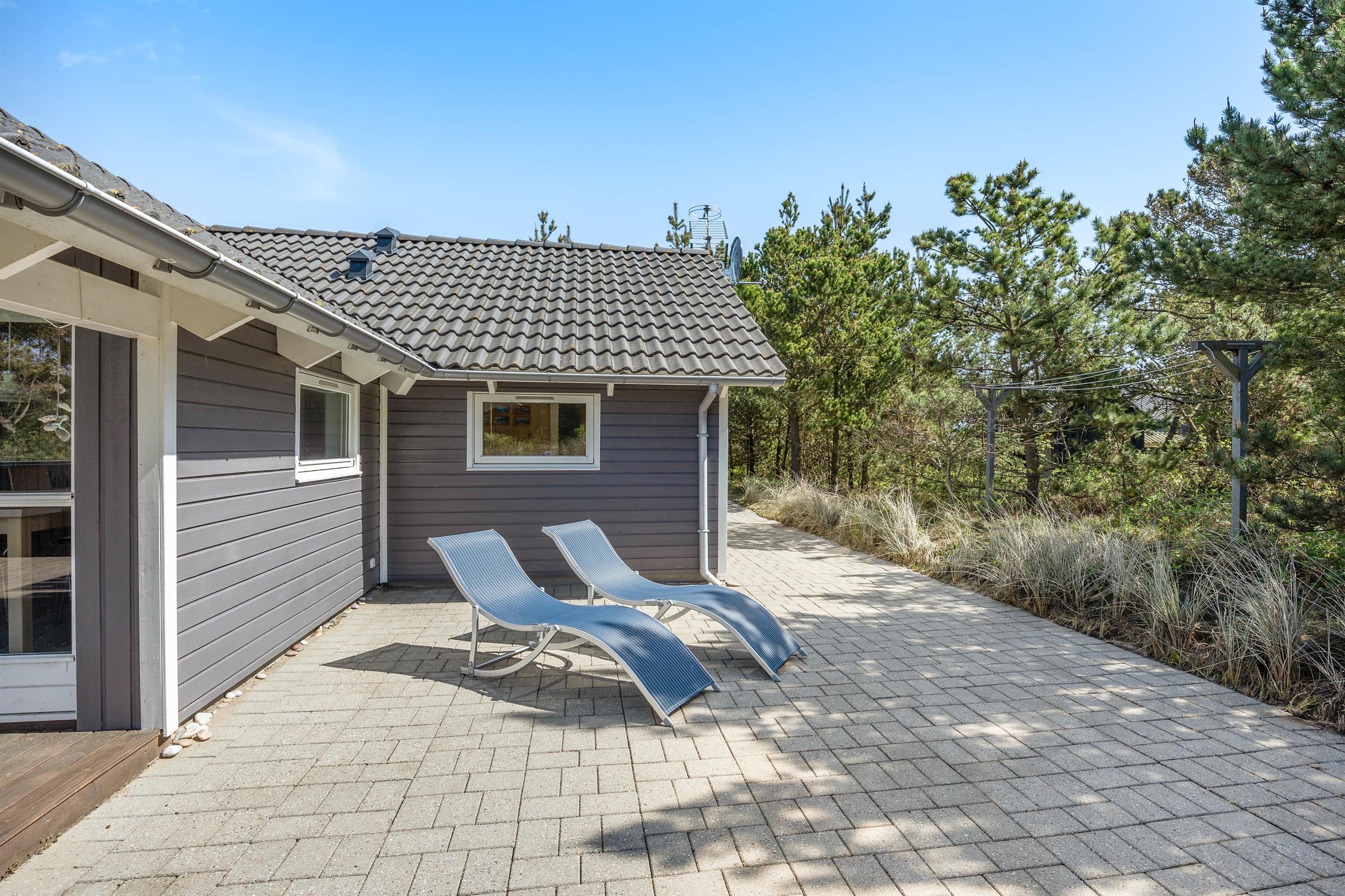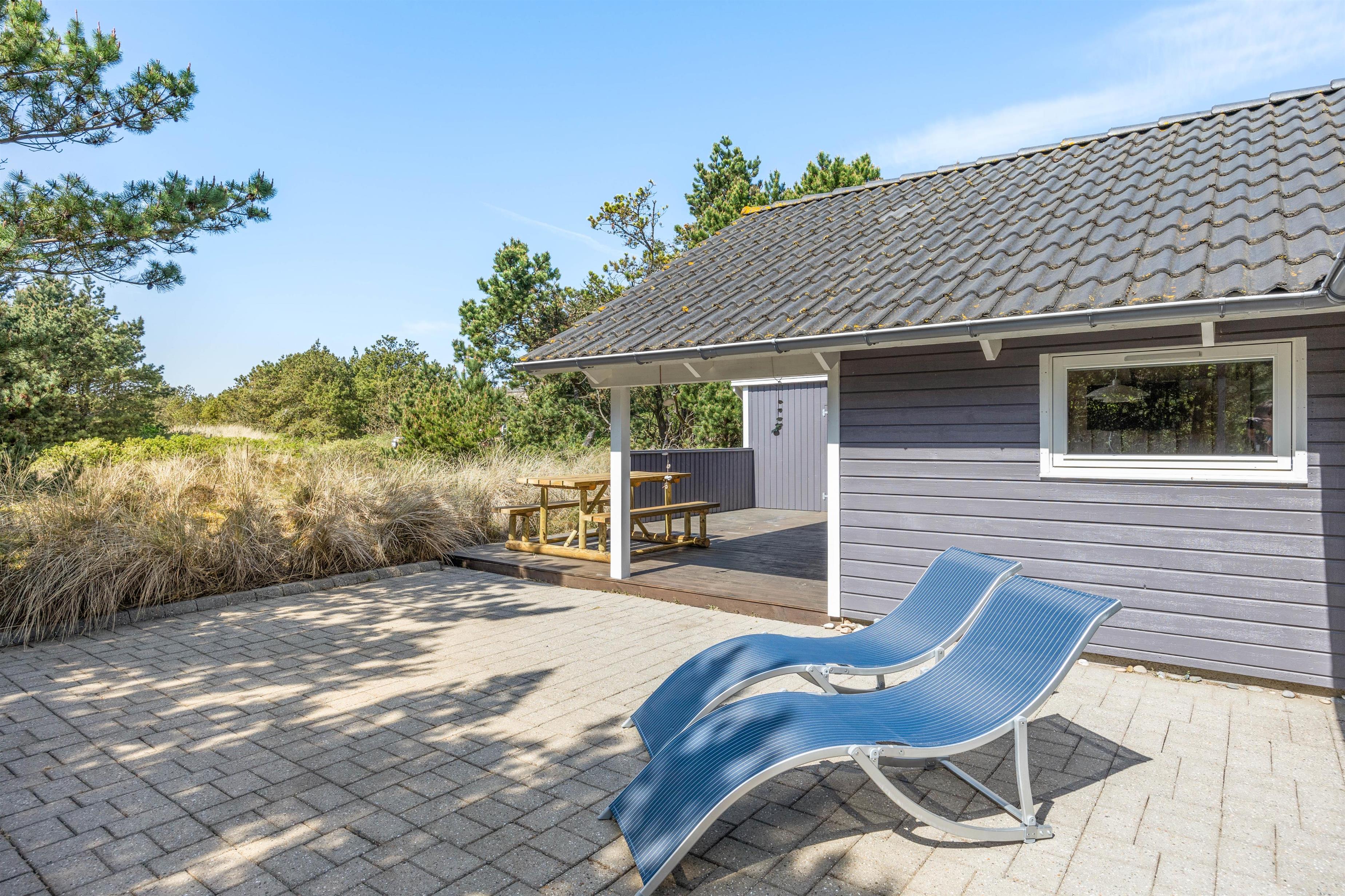 På husets terrasse er der havemøbler, så når vejret er til det, kan I Sætte jer godt til rette og bare nyde solens varme stråler. En del af terrassen er overdækket, hvilket gør at I ikke skal bekymre jer om at blive våde, hvis der kommer en regnbyge. Om aftenen kan I lytte til lyden af Vesterhavets brussen, og nyde en hyggelig middag tilberedt på sommerhusets tilhørende grill.