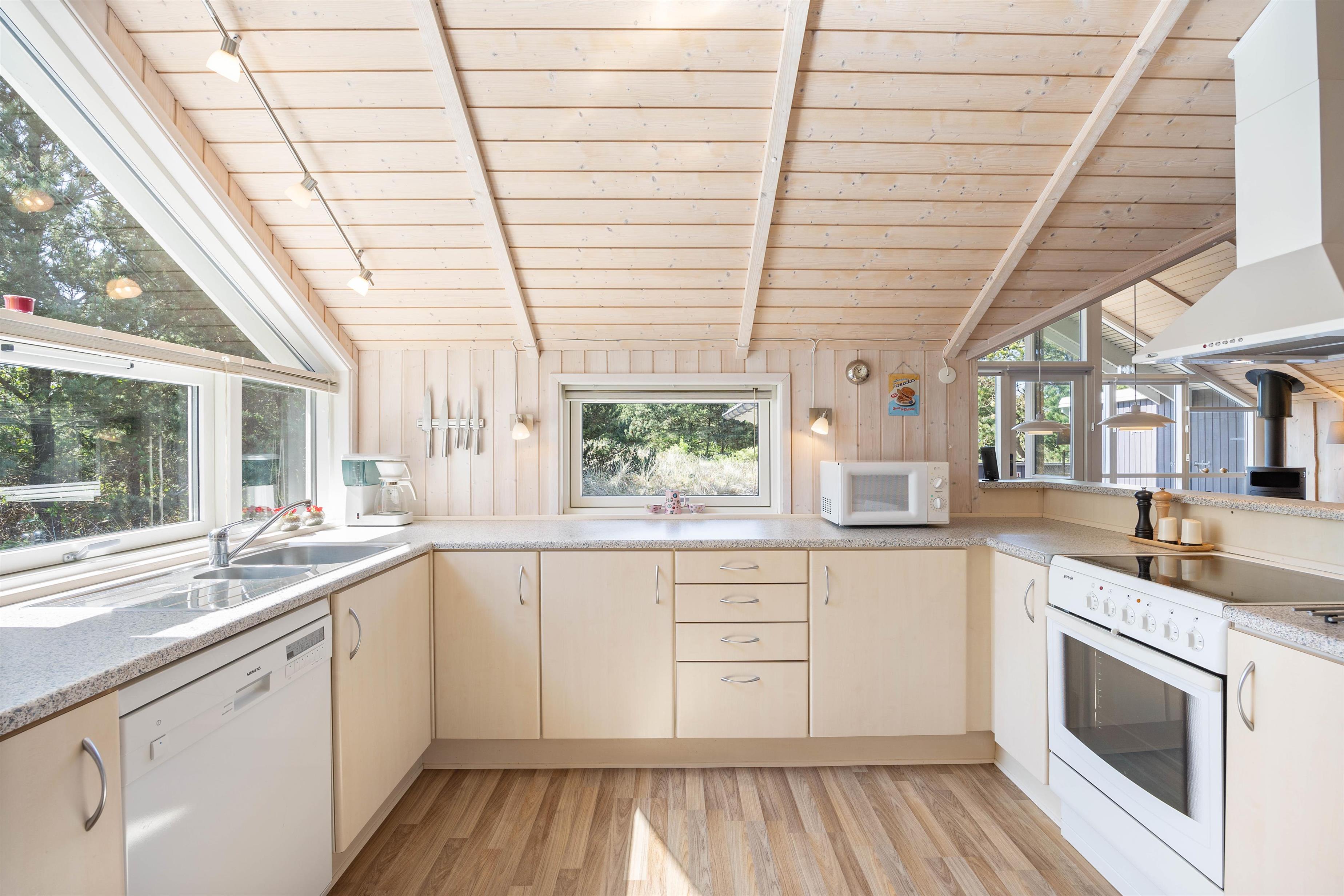 Feriehuset byder jer velkomment med et åbent køkkenalrum, som sørger for at I kan have en samtale sammen, uanset om I sidder i sofaen og slapper af, eller om I står i køkkenet og er i gang med at tilberede et lækkert måltid mad. Køkkenet er praktisk indrettet, og opvaskemaskinen klarer opvasken, hvor I imens kan sidde sammen ved køkkenbordet og spille et spil sammen. Den knitrende ild i brændeovnen skaber en behagelig feriestemning, når I hygger jer i sofaen og nyder en hyggelig aften foran tv´et. De er også muligt at se tyske tv-programmer.
